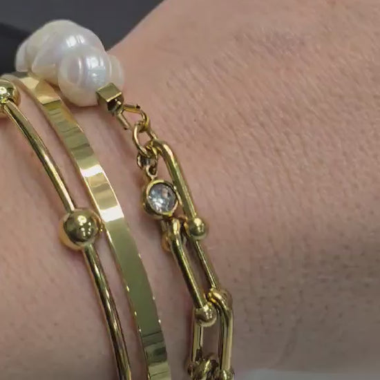 Tento náramok kombinuje prírodnú krásu riečnych perál so štýlovou nerezovou retiazkou v zlatej farbe, ktorá doplní každý outfit – od bežného oblečenia až po večernú eleganciu.