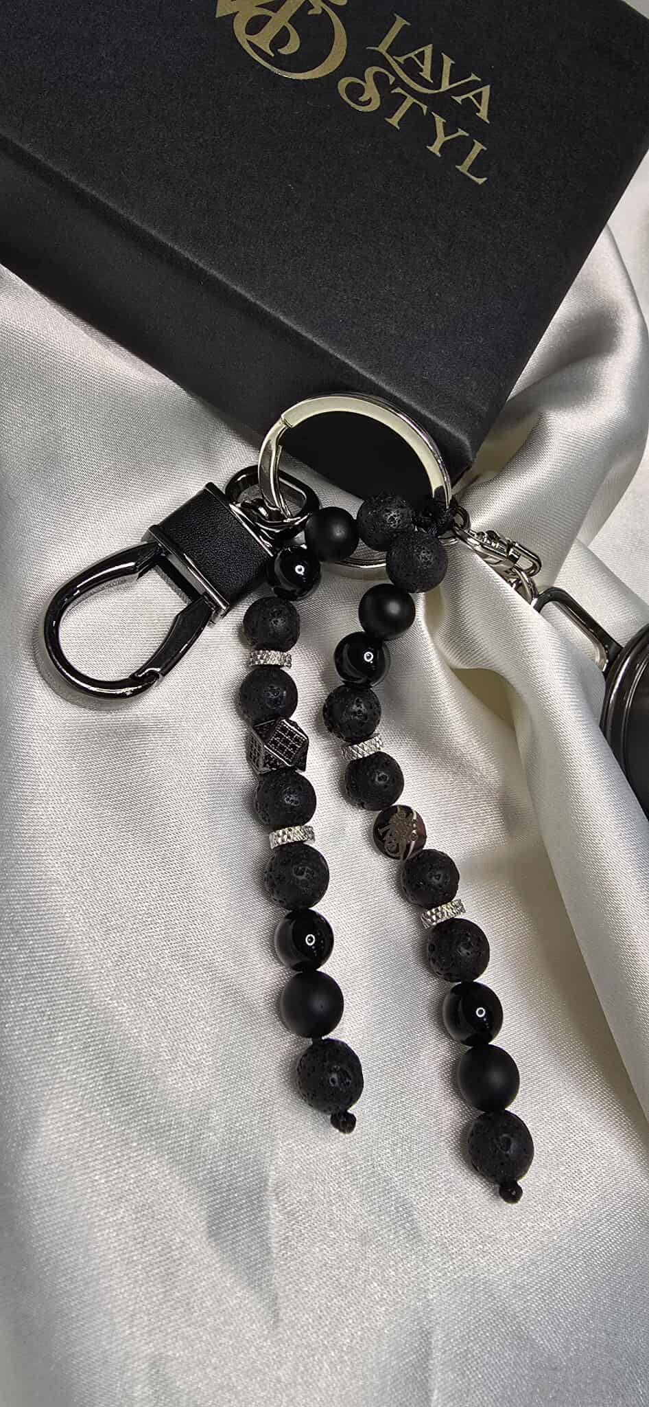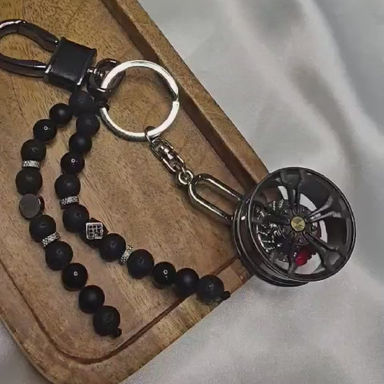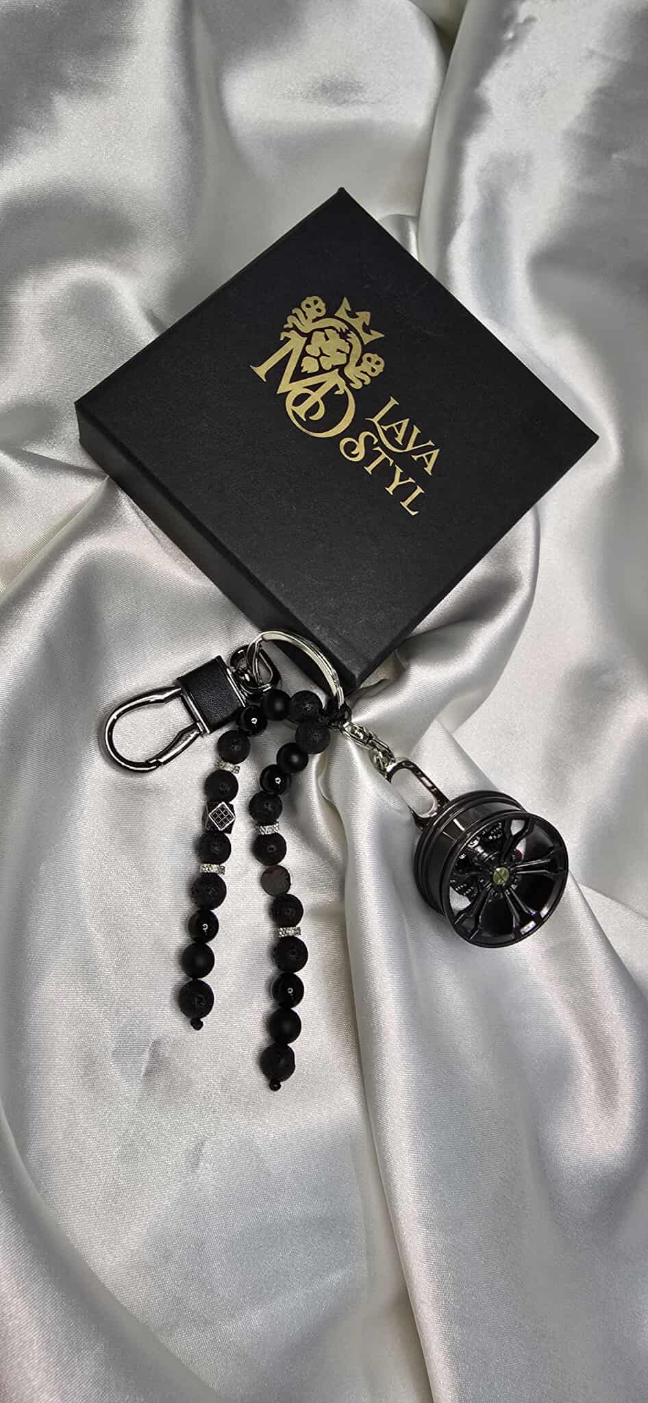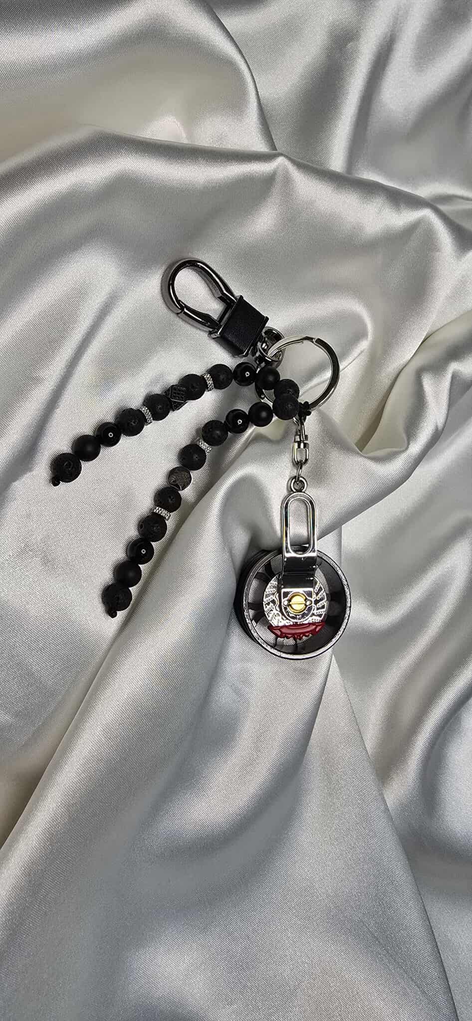 Unikátna kľúčenka spája precízny otočný disk v dizajne auto elektrónov s dvoma šnúrkami ozdobenými minerálmi. Nielen praktický doplnok, ale aj štýlový talizman alebo darček, ktorý poteší každého milovníka áut a originálnych detailov.