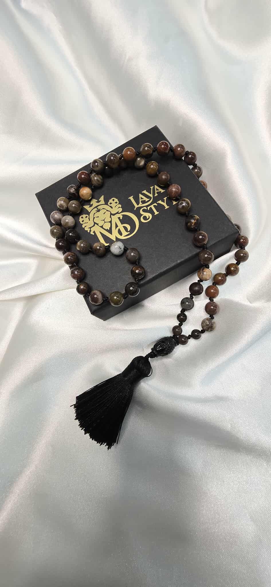 Jedinečný minerálny náhrdelník vyrobený zo skameneného dreva, ktorý v sebe nesie energiu zeme, času a stability. Dominantou náhrdelníka je prívesok v tvare hlavy Budhu doplnený o čiernu štrasu, ktorá mu dodáva jemný lesk a elegantný kontrast.