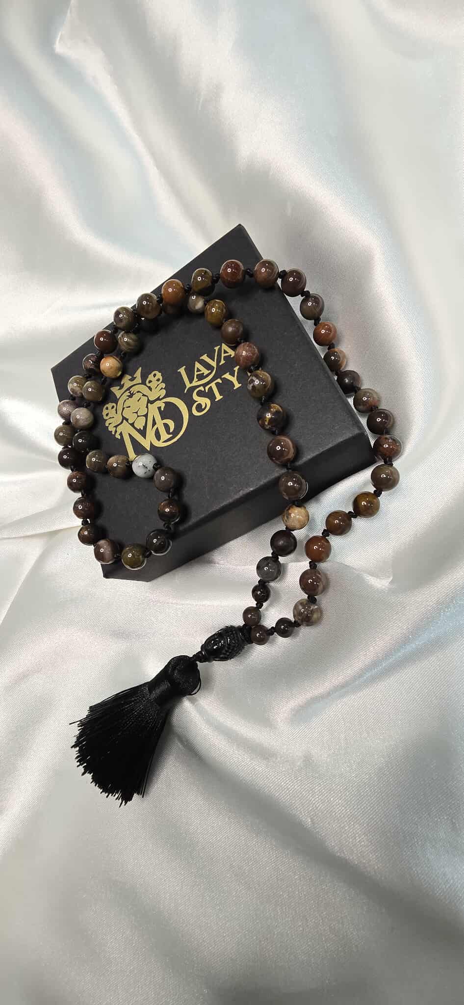 Náhrdelník je bez zapínania, nosí sa pohodlne cez hlavu. Celková dĺžka 64 cm (32 cm + 32 cm) je ideálna na každodenné nosenie aj ako výrazný spirituálny doplnok. Každý kus je originál vďaka prirodzenej kresbe skameneného dreva.