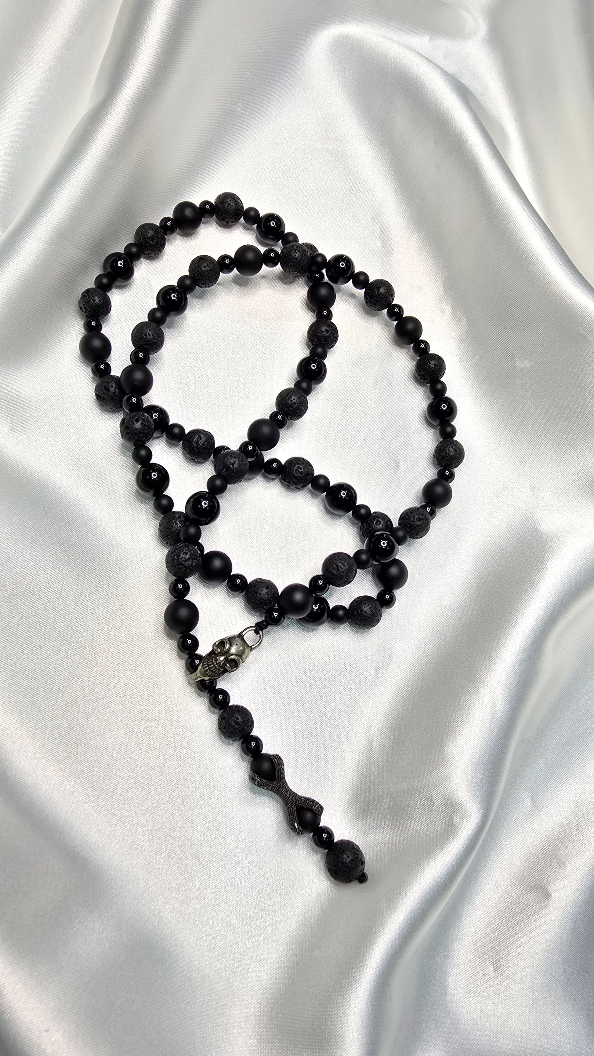 Originálny pánsky náhrdelník Shadow Beads z čiernych minerálov Lávového kameňa a Ónyxu s unikátnym príveskom lebky, ktorý slúži ako zapínanie. ideálny doplnok pre každého muža, ktorý chce podčiarknúť svoj štýl.