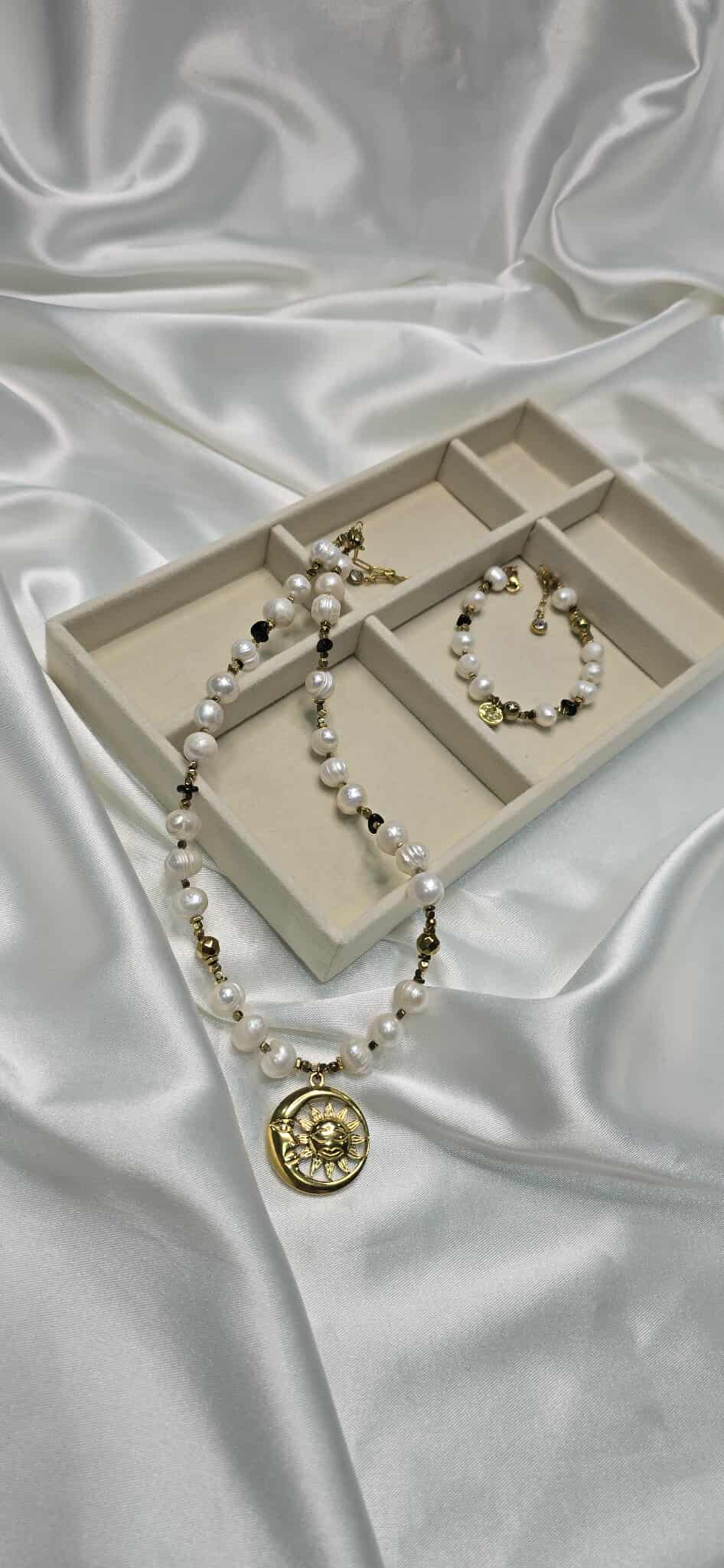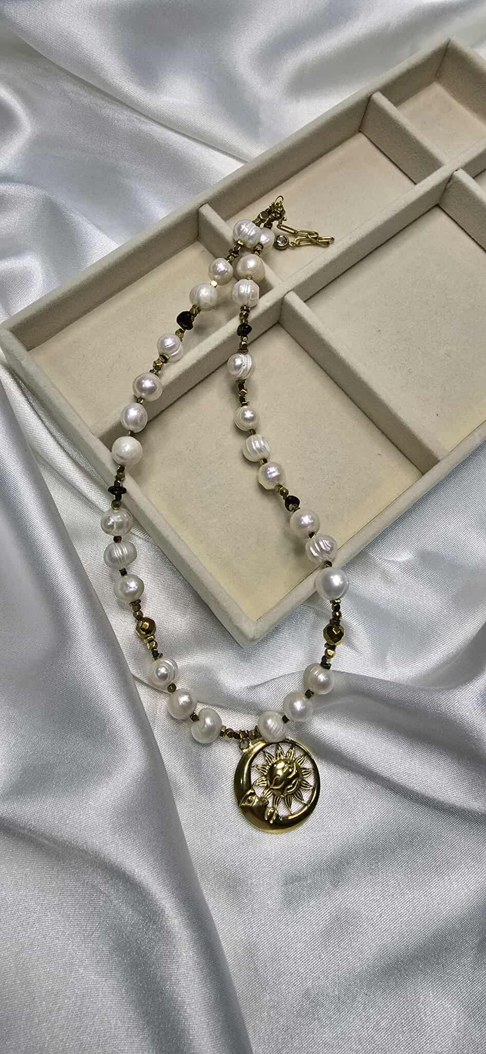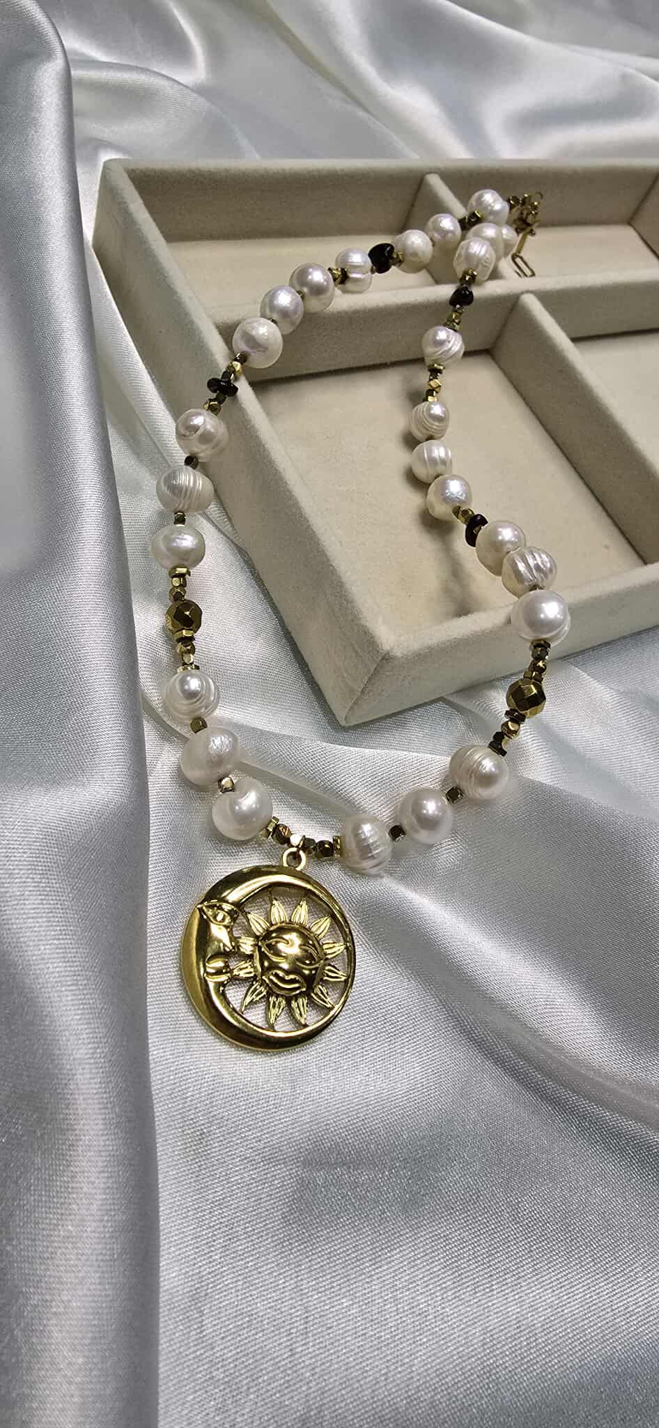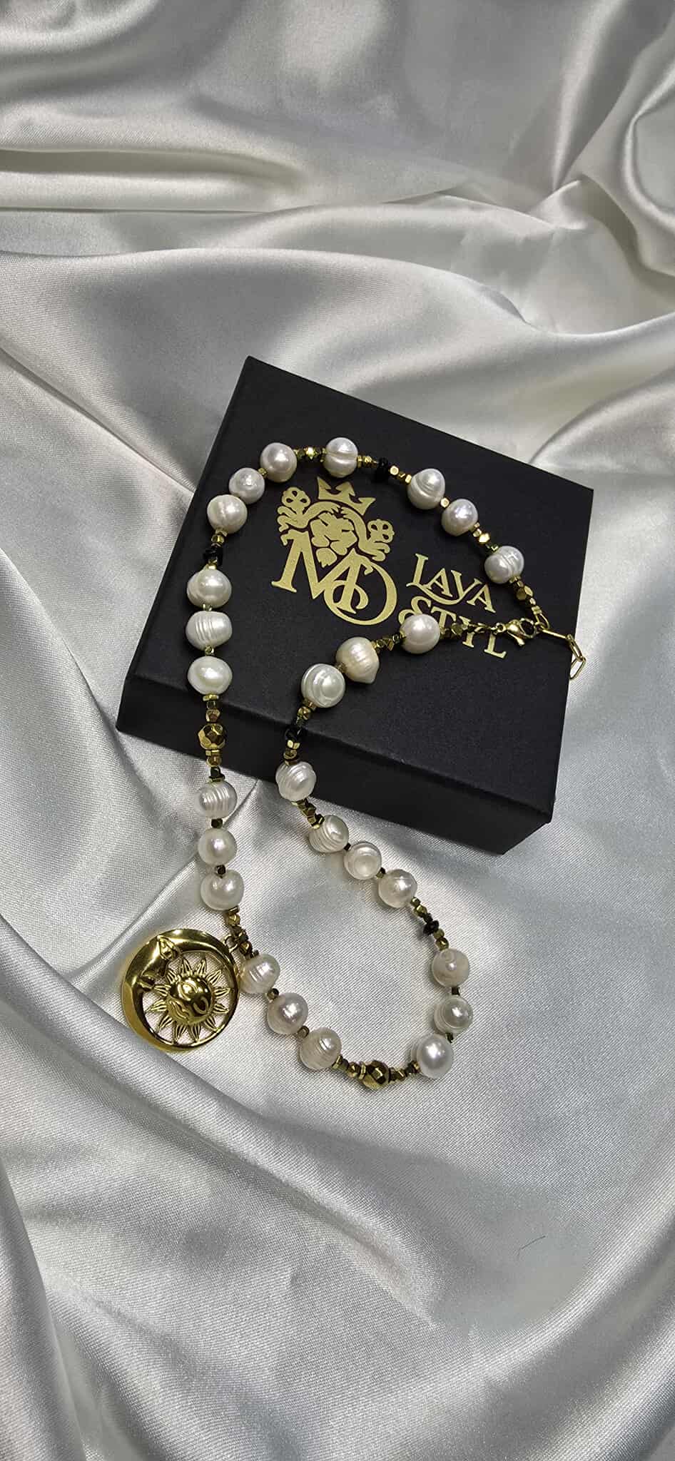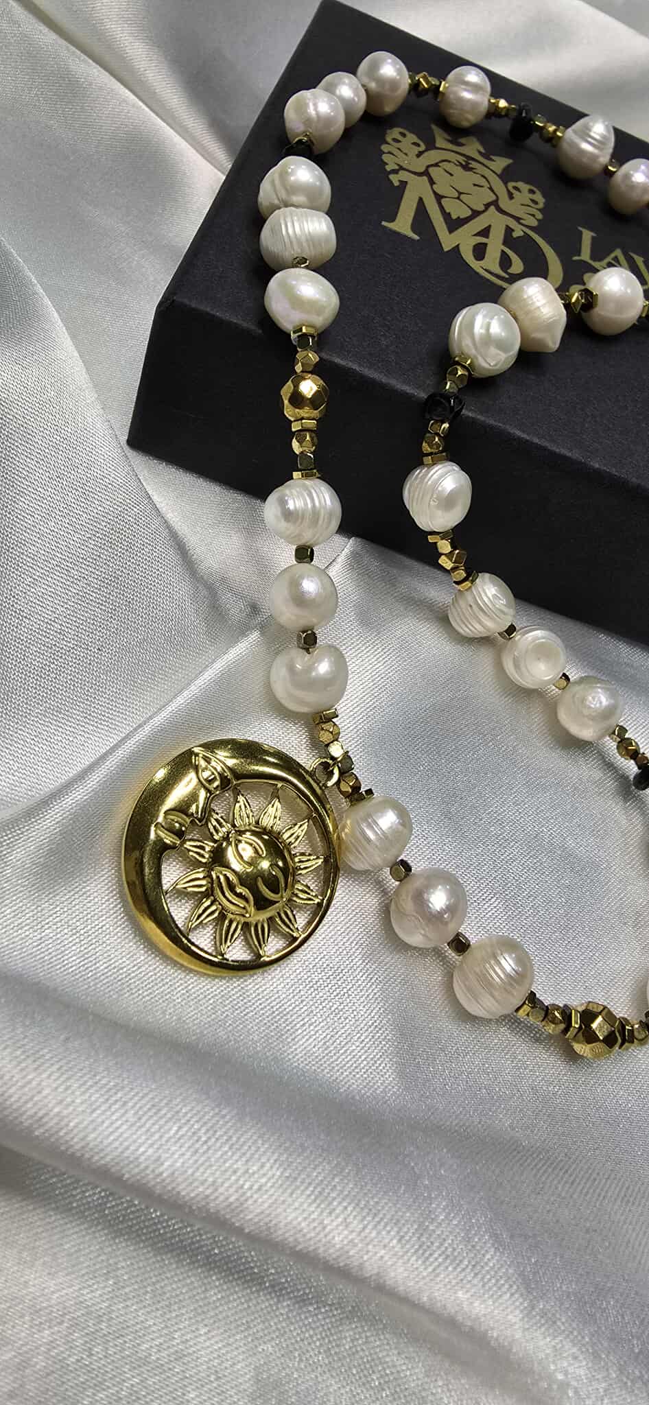 Elegantný náhrdelník Golden Sun je vyrobený z riečnych perál s jemným prirodzeným leskom, doplnený o zlatý hematit a čierny turmalín. Tentokrát je prívesok unikátny, odlišný od predchádzajúcej kolekcie, a dodáva náhrdelníku nový, osobitý charakter.