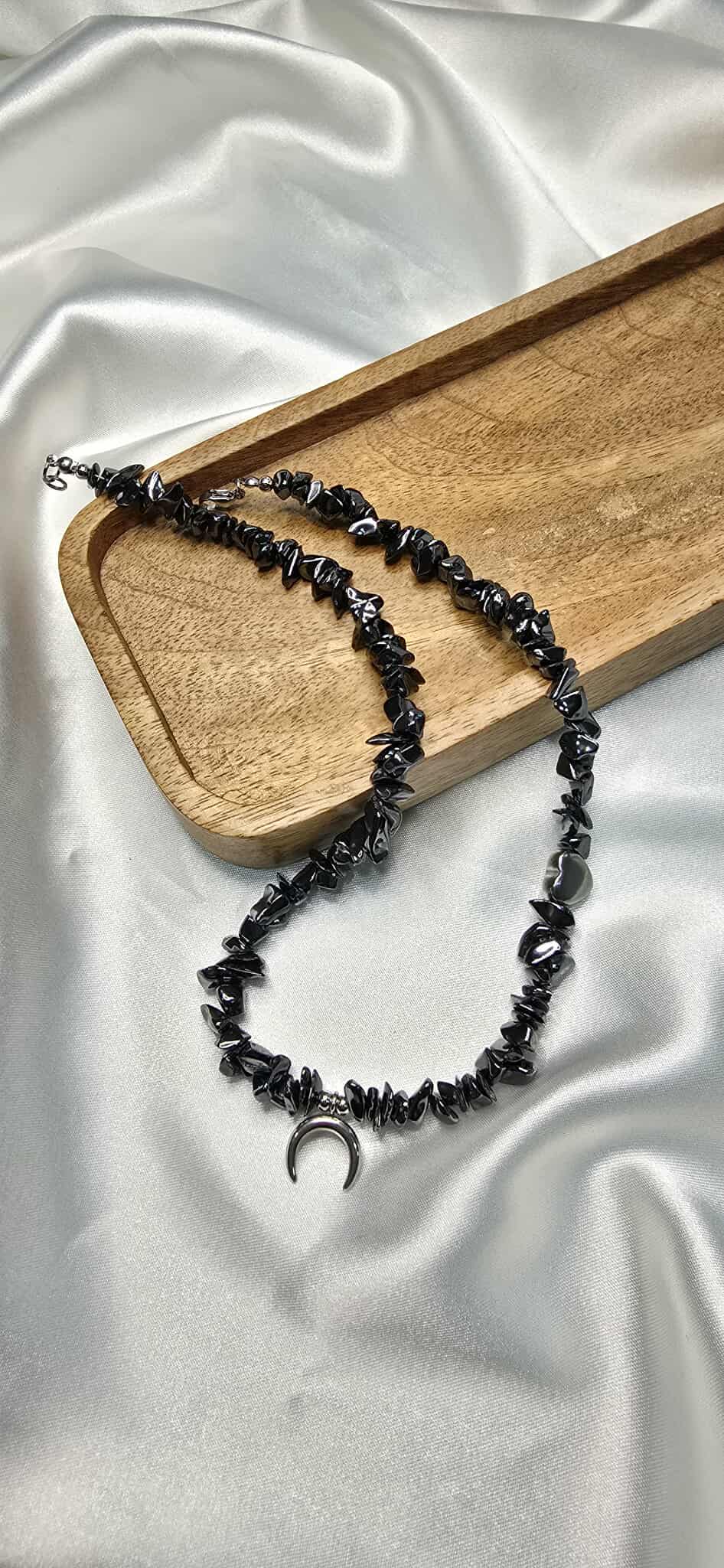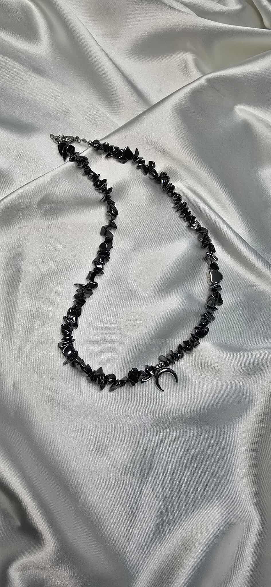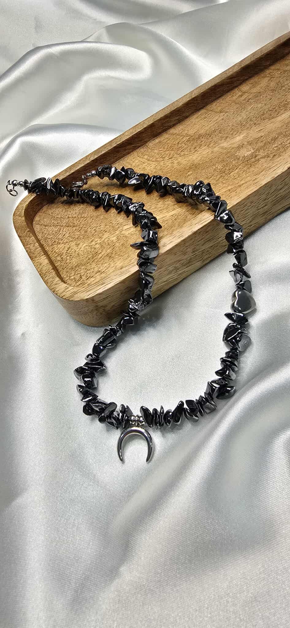 Elegantný náhrdelník vyrobený z hematitu, s jemným príveskom v tvare mesiaca a srdiečkovým komponentom, ktorý symbolizuje harmóniu a lásku.