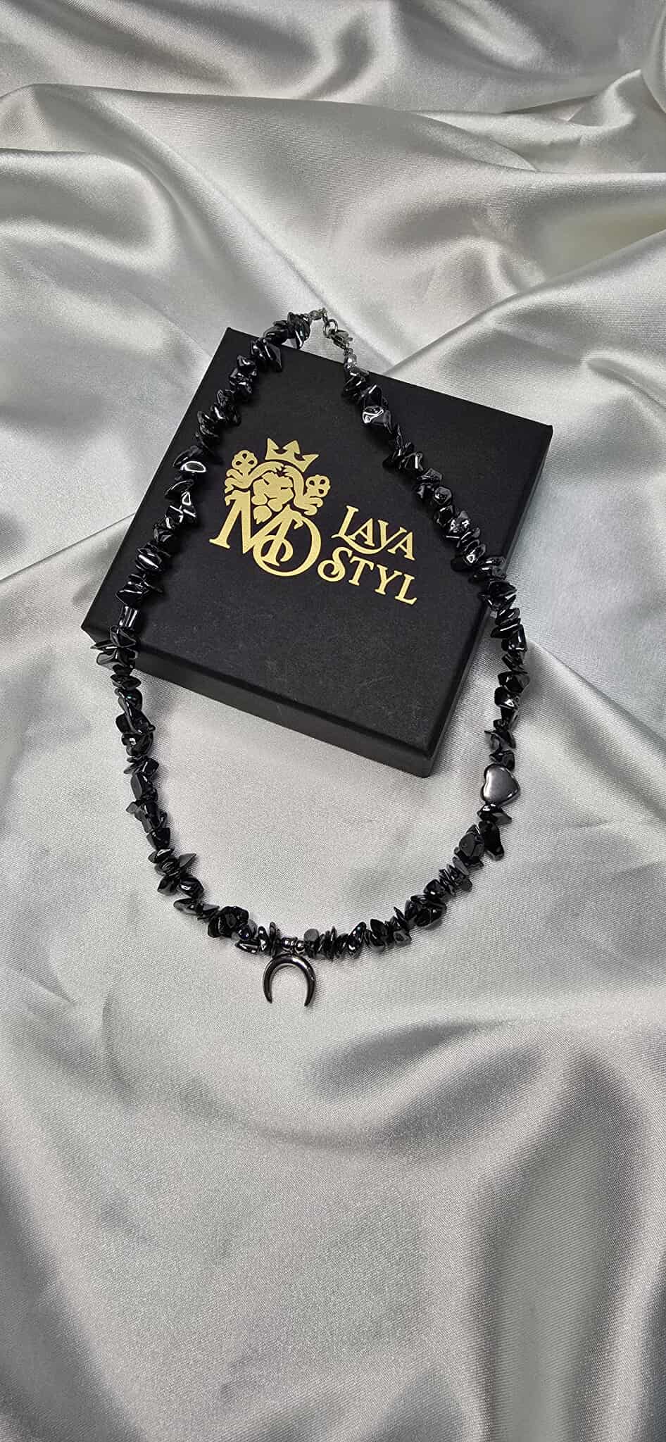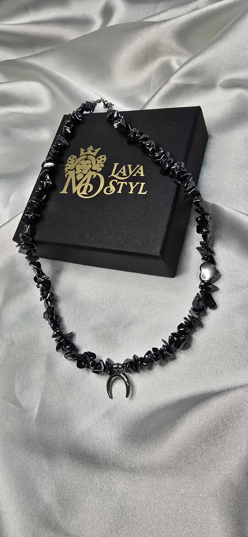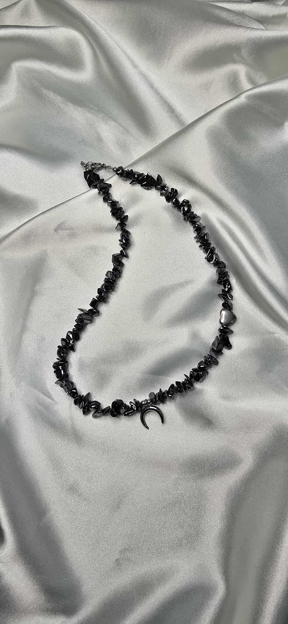 Elegantný náhrdelník vyrobený z hematitu, s jemným príveskom v tvare mesiaca a srdiečkovým komponentom, ktorý symbolizuje harmóniu a lásku.