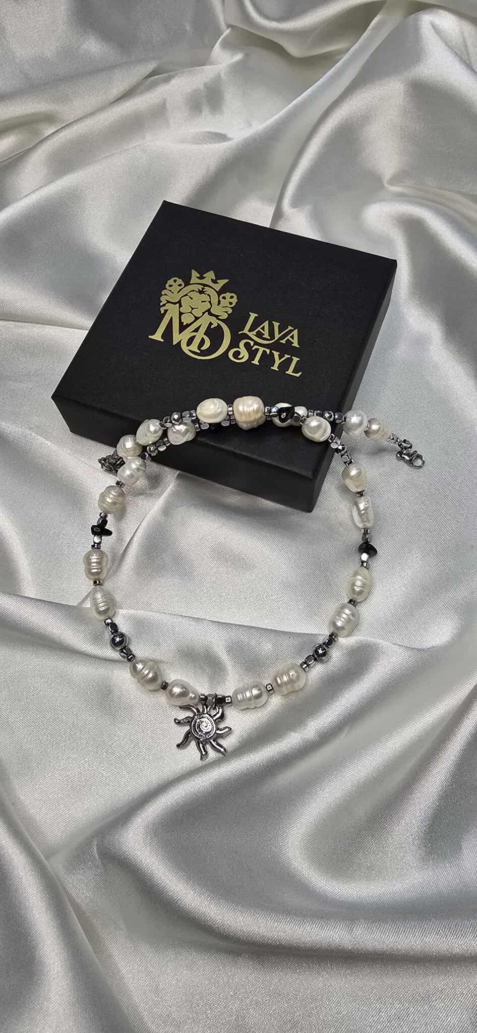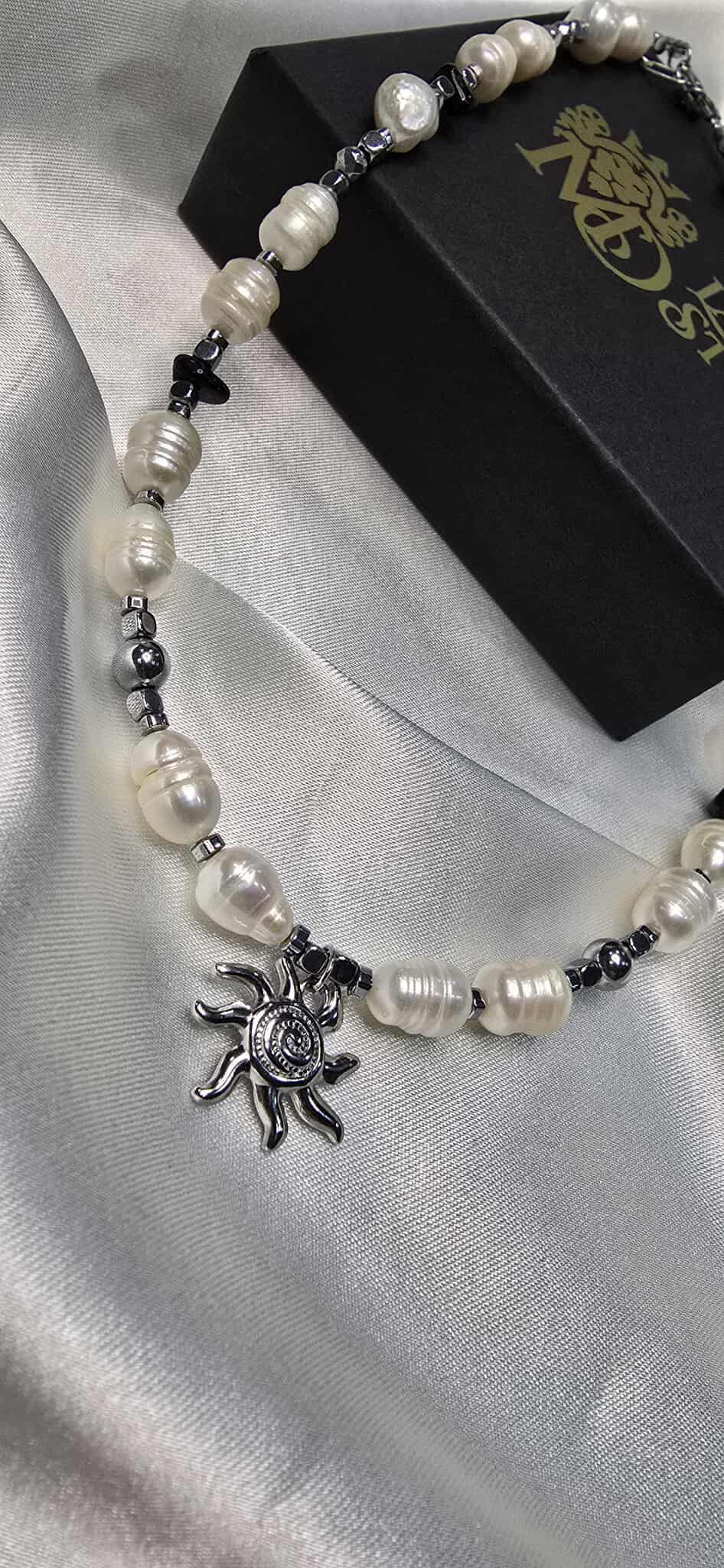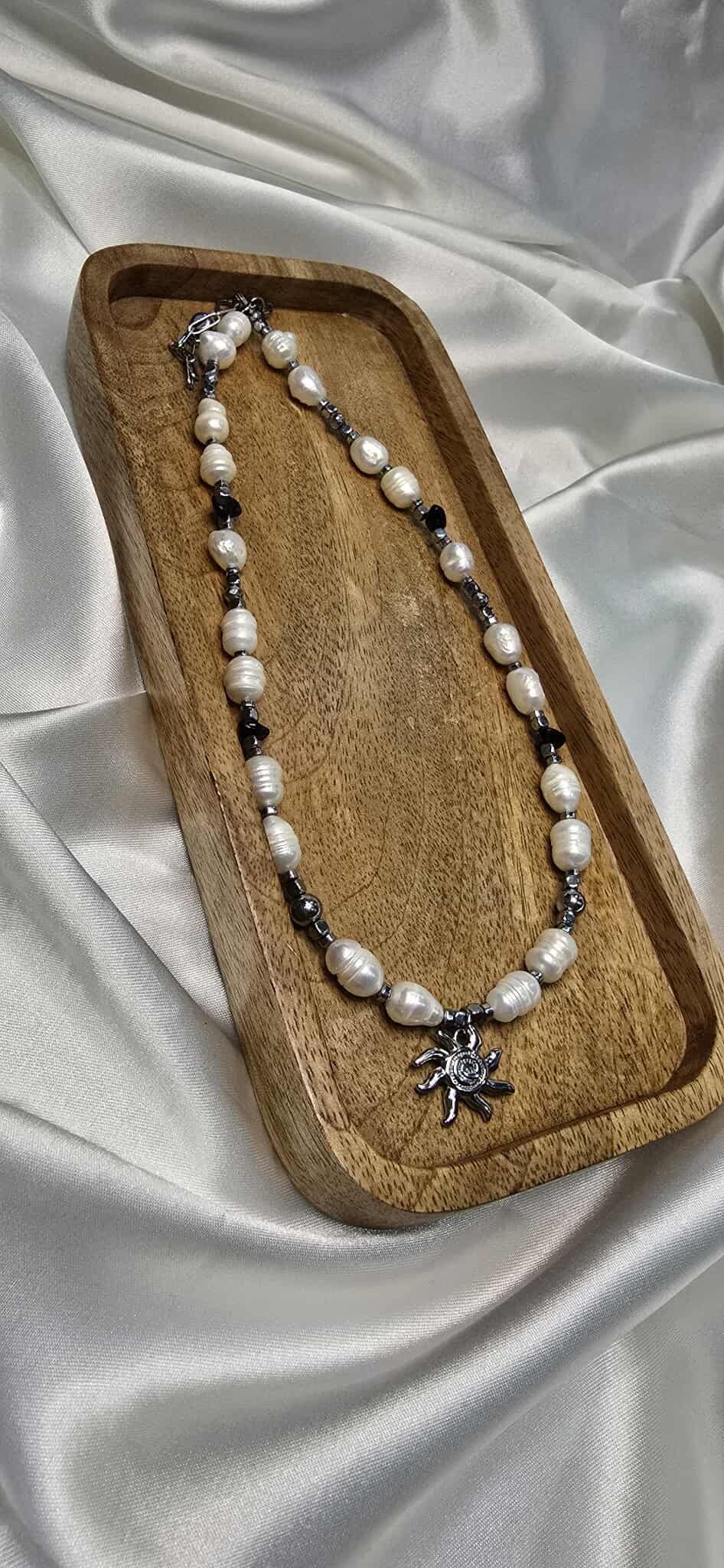 Elegantný náhrdelník vytvorený z pravých riečnych perál, strieborného hematitu a čierneho turmalínu. Spojenie jemnosti, sily a ochrany vytvára harmonický šperk, ktorý podčiarkne ženskosť a vnútornú rovnováhu.