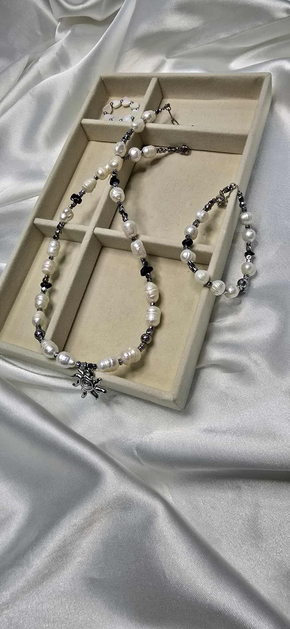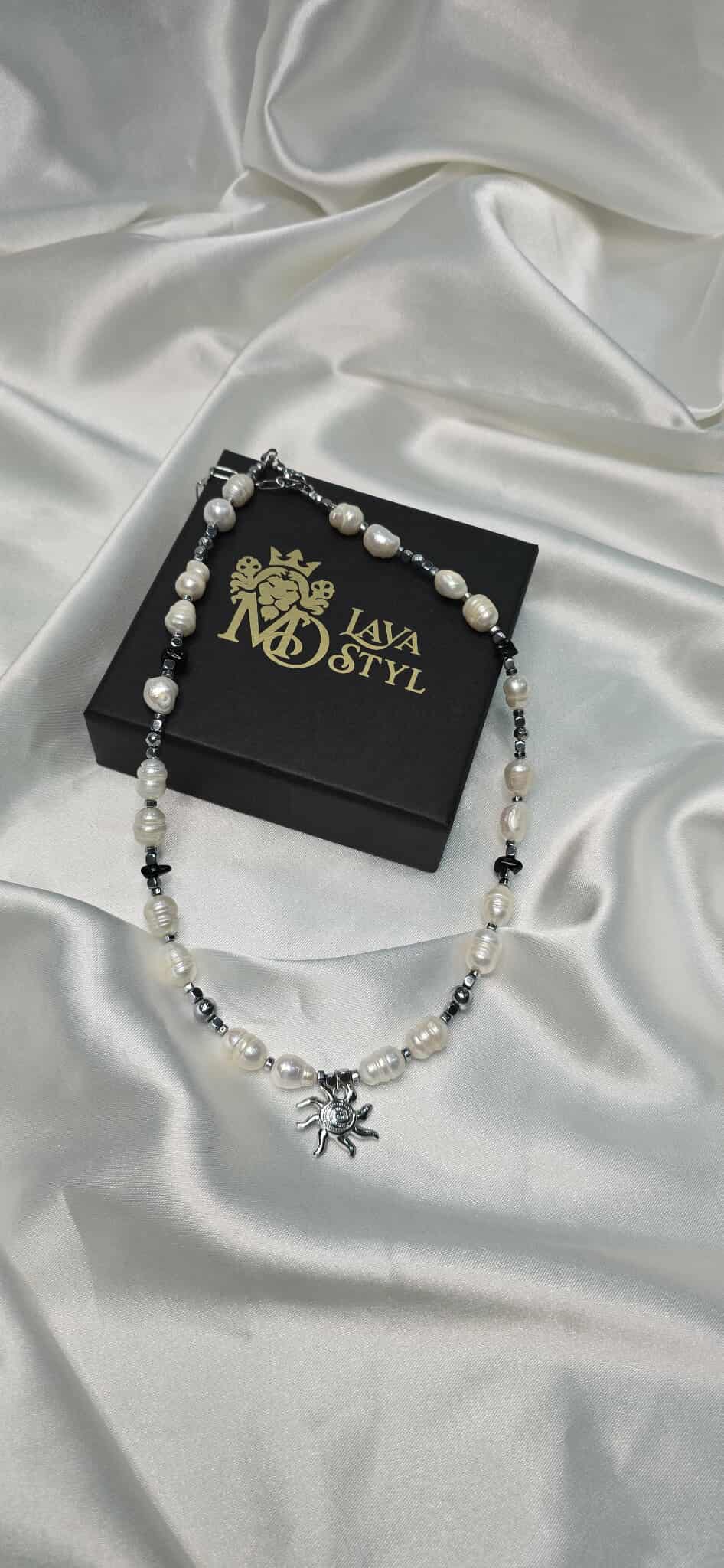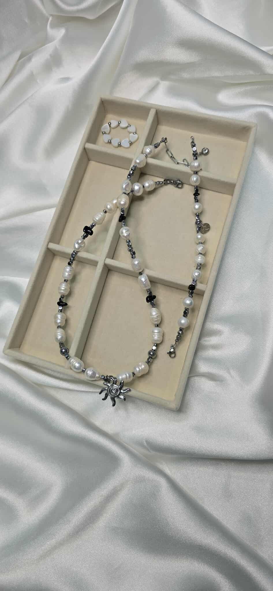 Elegantný náhrdelník vytvorený z pravých riečnych perál, strieborného hematitu a čierneho turmalínu. Spojenie jemnosti, sily a ochrany vytvára harmonický šperk, ktorý podčiarkne ženskosť a vnútornú rovnováhu.