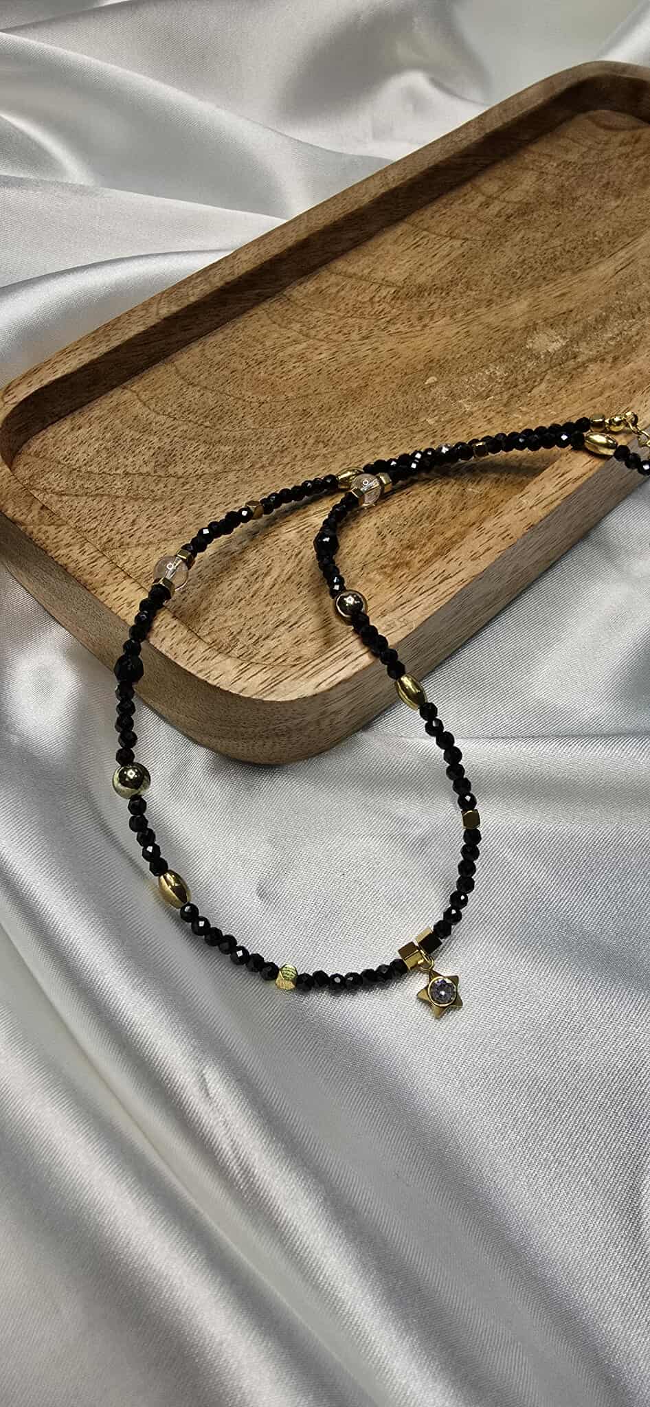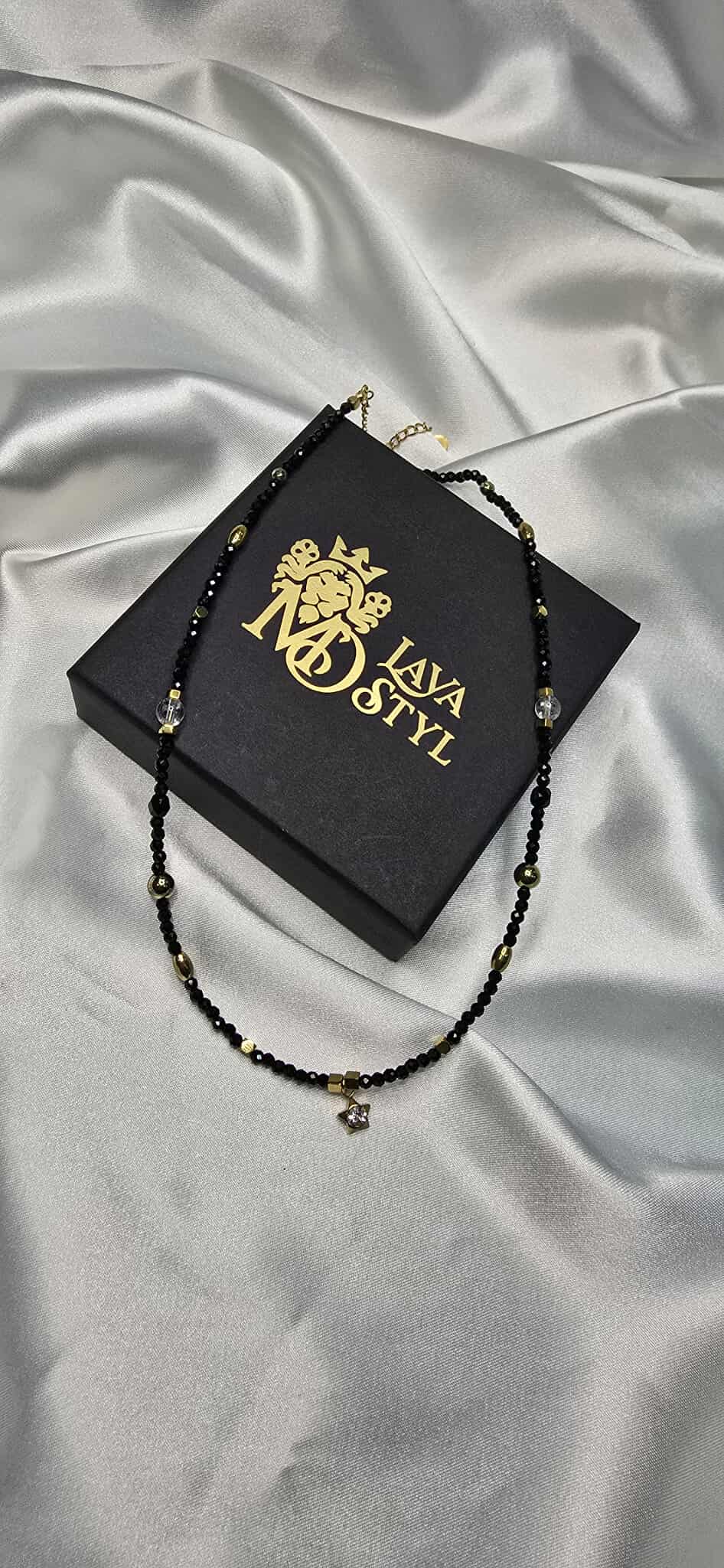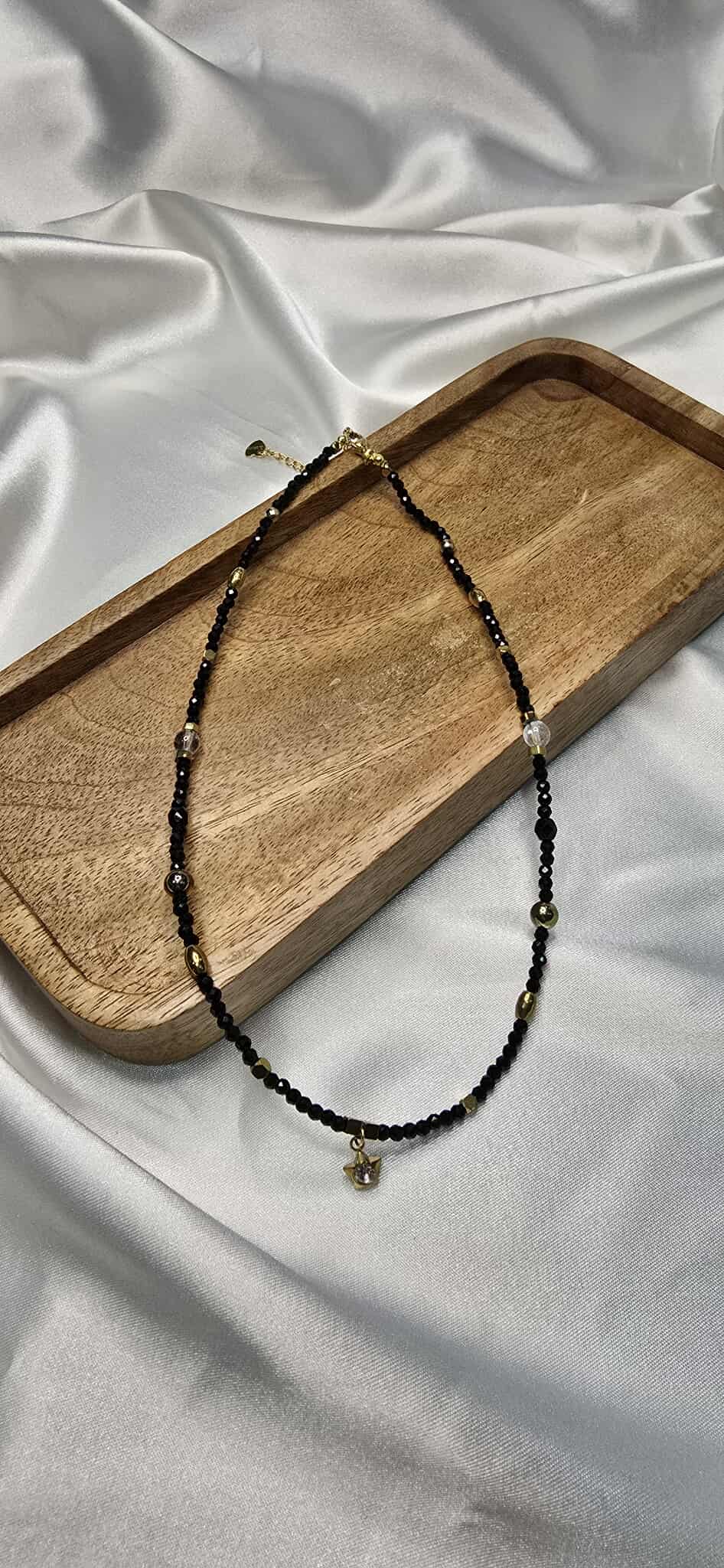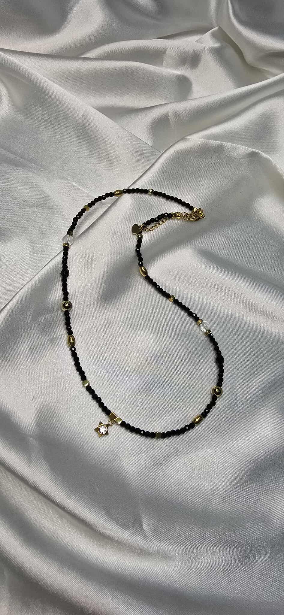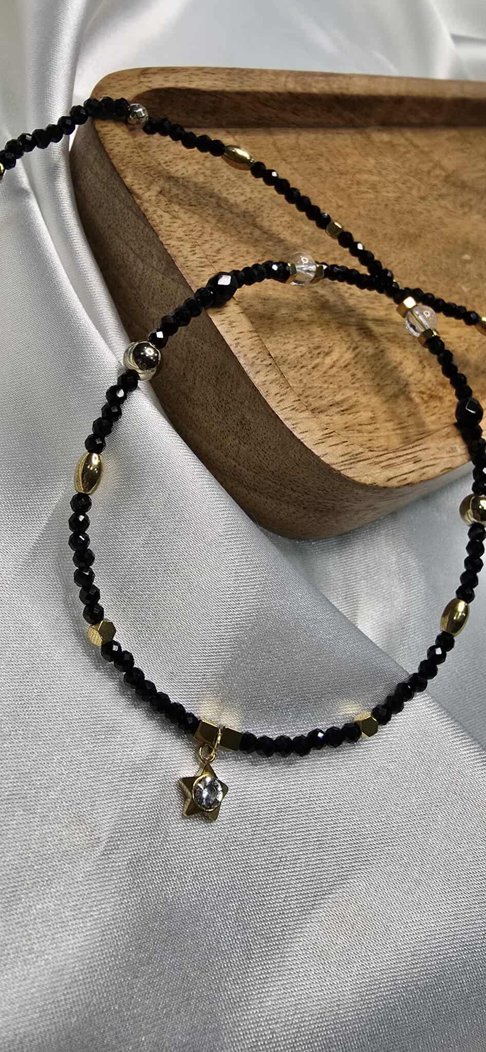 Nežný náhrdelník vyrobený z čiernych diamantovo brúsených spinelov, zlatého hematitu a krištáľu, s jemným leskom a harmóniou minerálov.