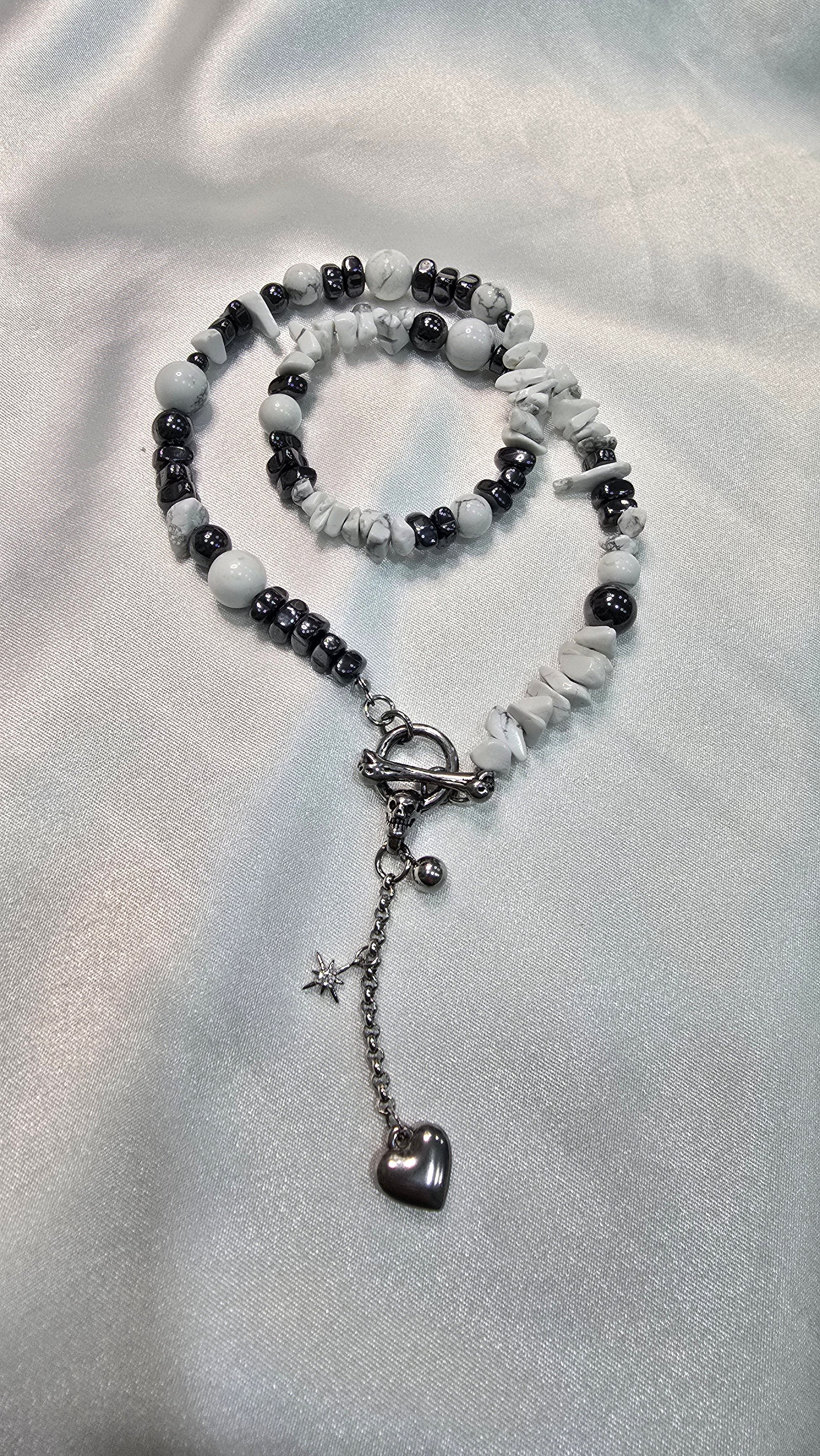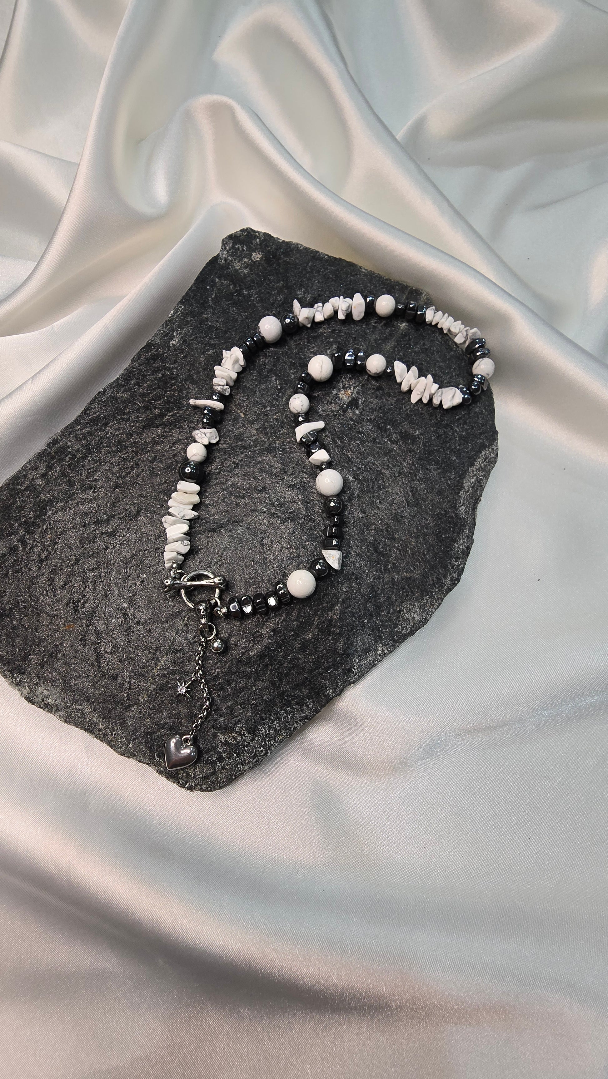 Jemné kontrasty bieleho a tmavého kameňa dopĺňajú kvalitné nerezové komponenty, vďaka čomu je náhrdelník nielen štýlový, ale aj odolný.