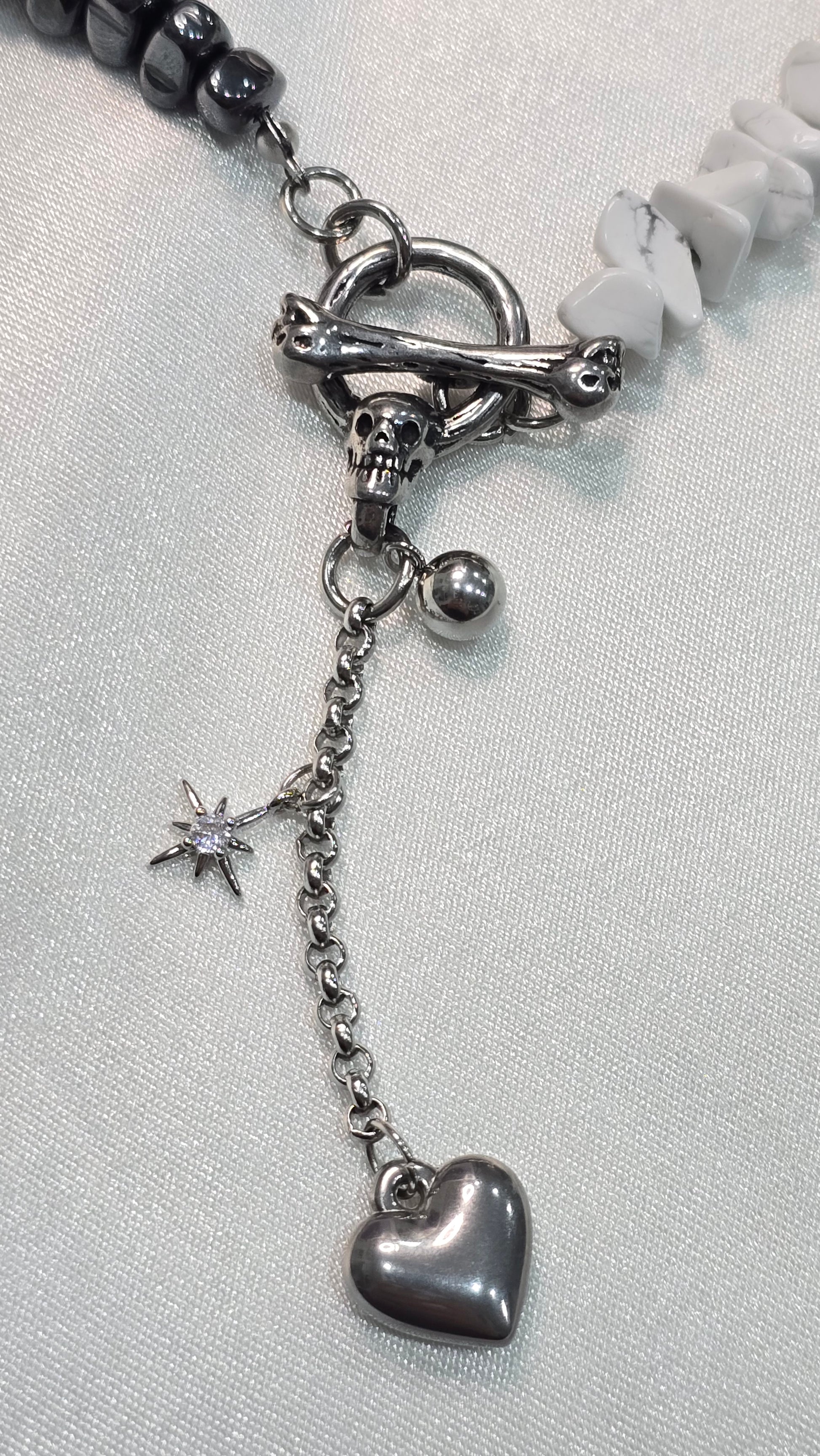 Tento jedinečný kúsok je vyrobený z prírodných minerálov – howlitu a hematitu, ktoré spájajú harmonickú energiu s nadčasovou eleganciou. Howlit je kameň pokoja a harmónie, pomáha zmierniť stres, upokojiť myseľ a podporuje trpezlivosť. Hematit zas dodáva vnútornú silu, energiu a chráni pred negatívnou energiou.