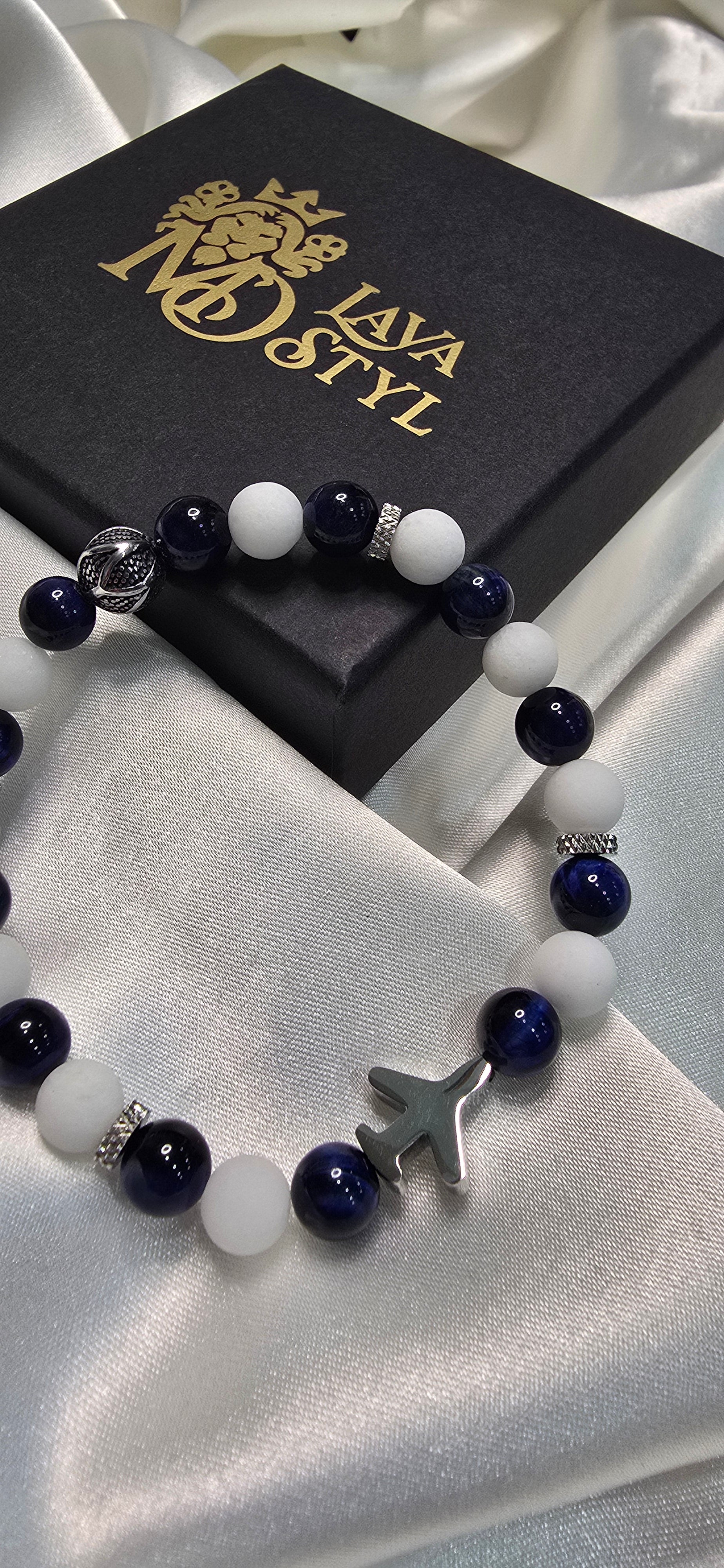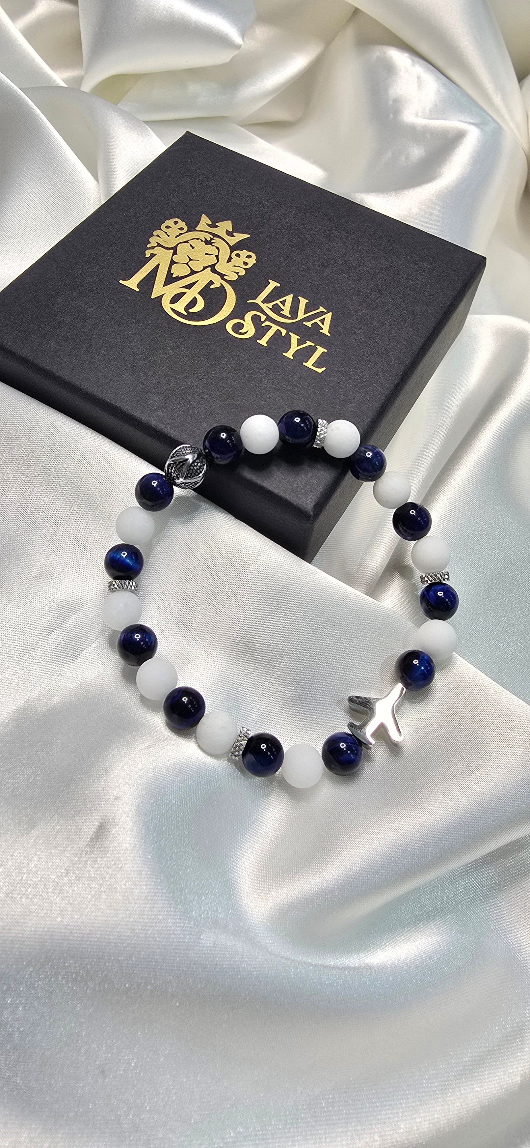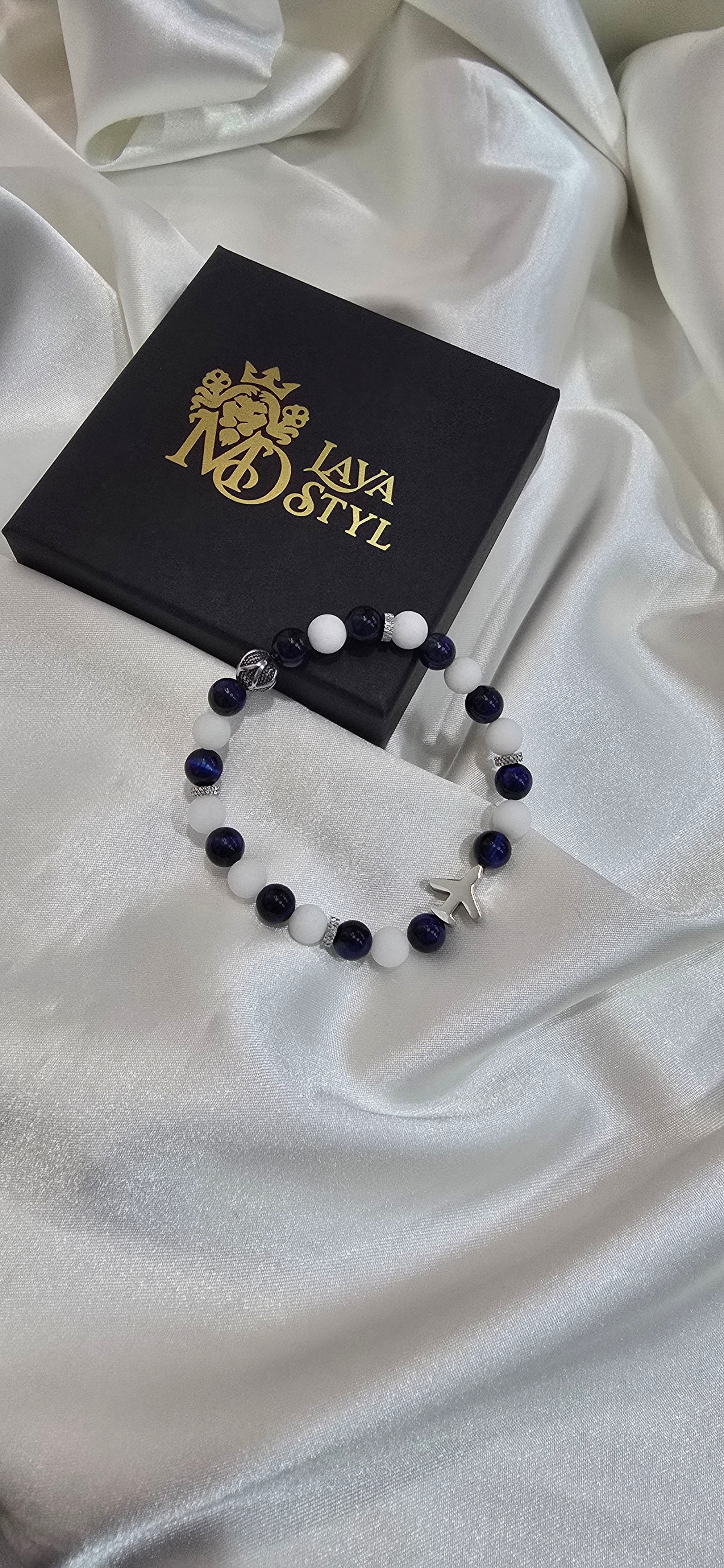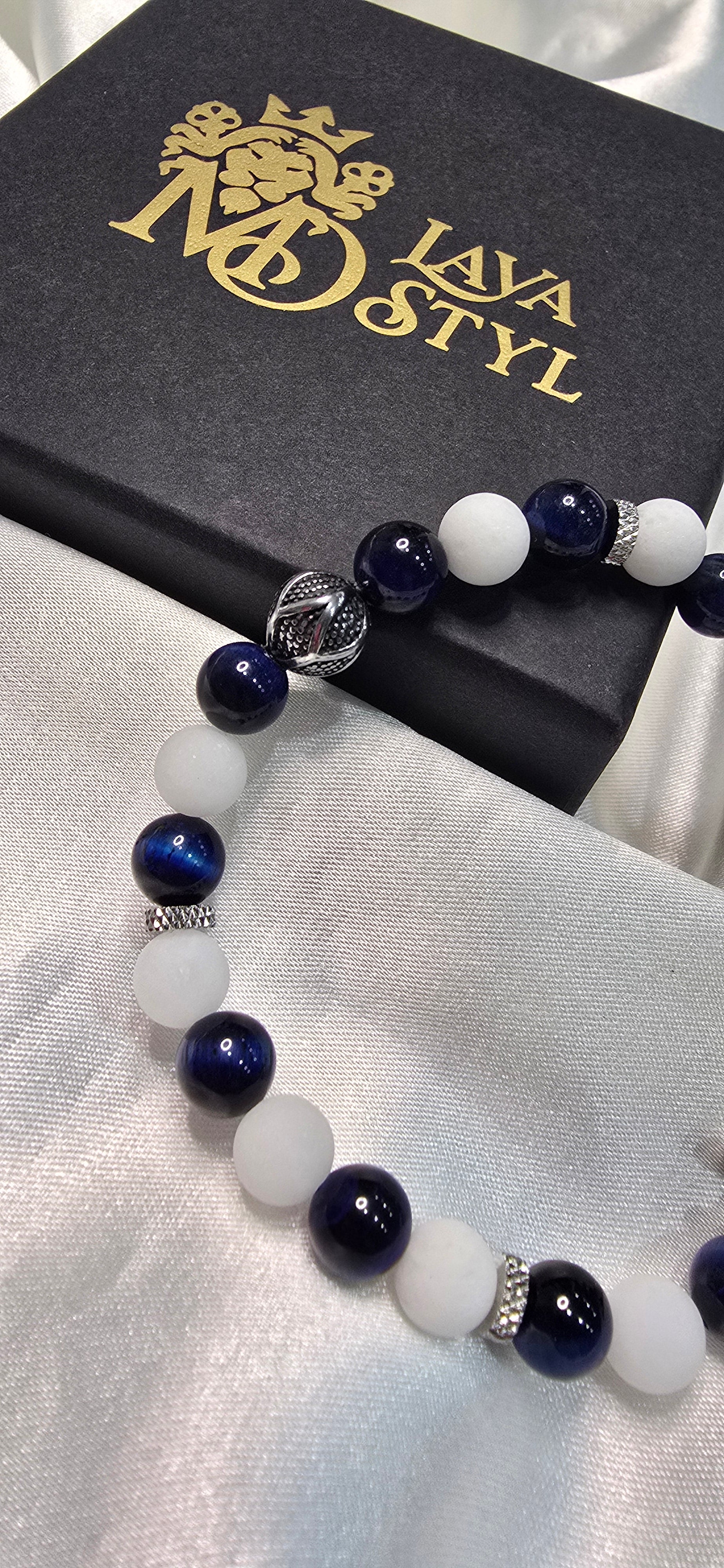 Objav kúzlo neba ukryté v mineráloch. Náramok Sky Voyage spája biely ónyx – kameň čistoty, ktorý prináša vnútorný pokoj a ochranu – s modrým tigrím okom, symbolom intuície, odvahy a jasného smeru.