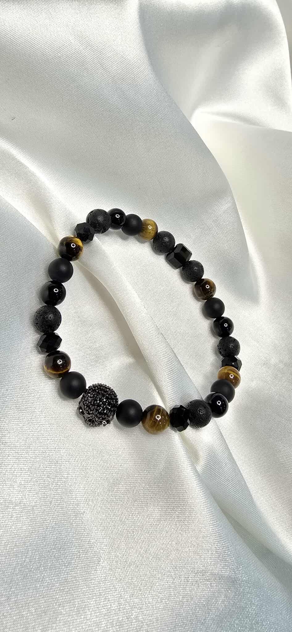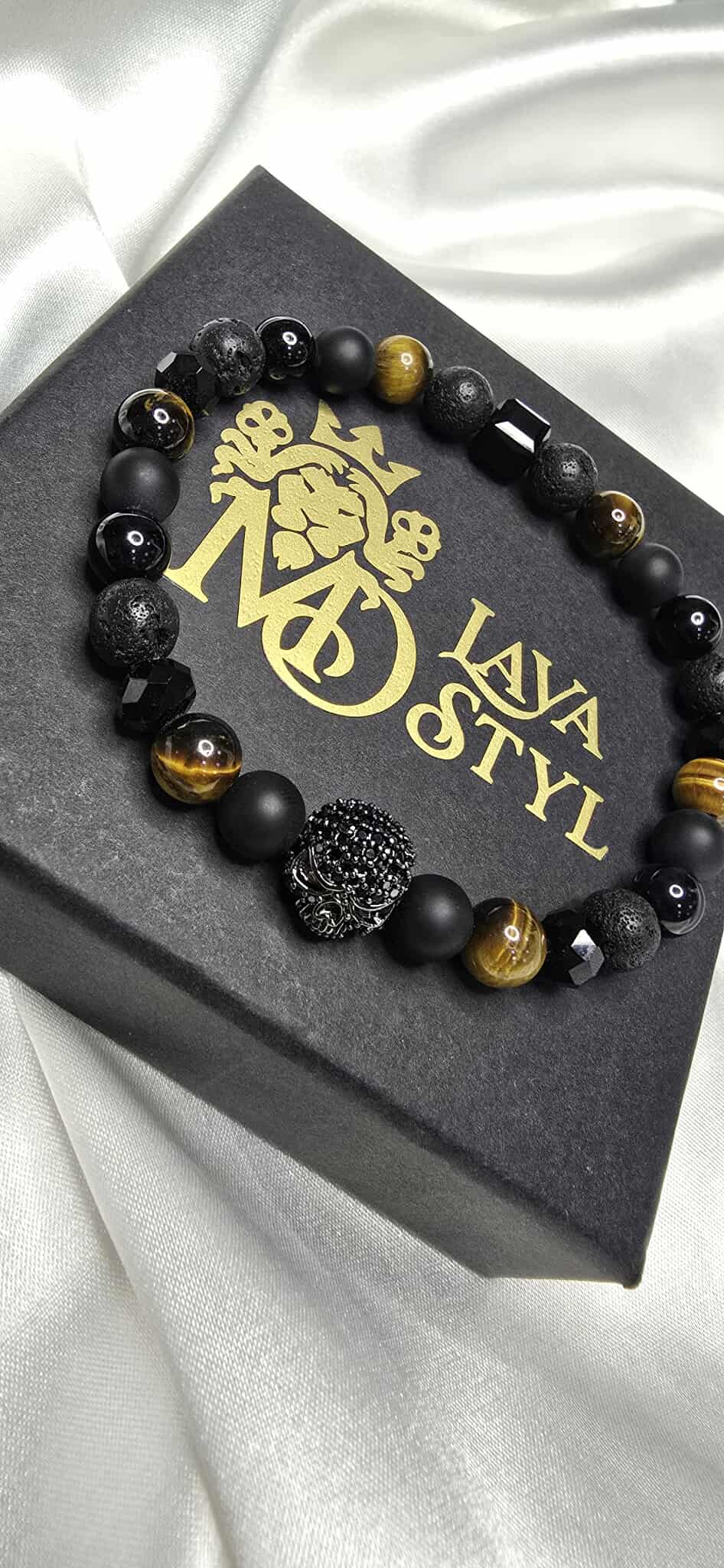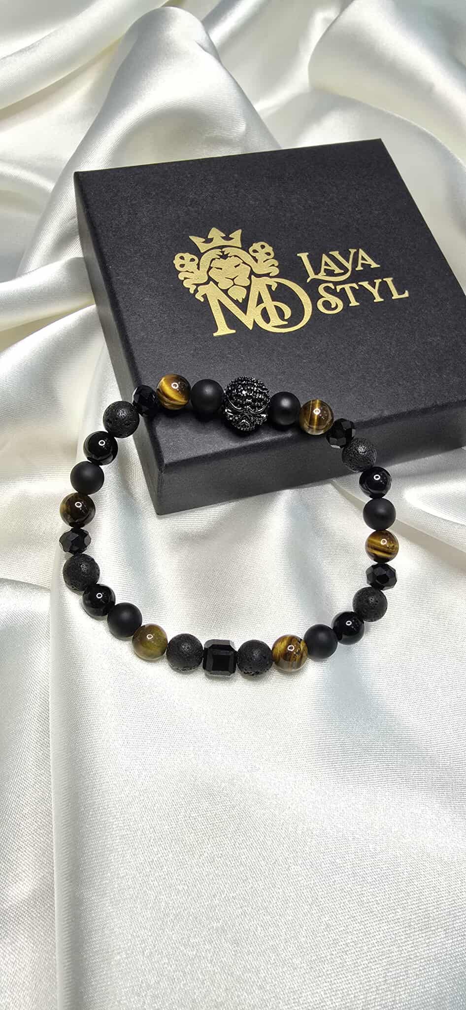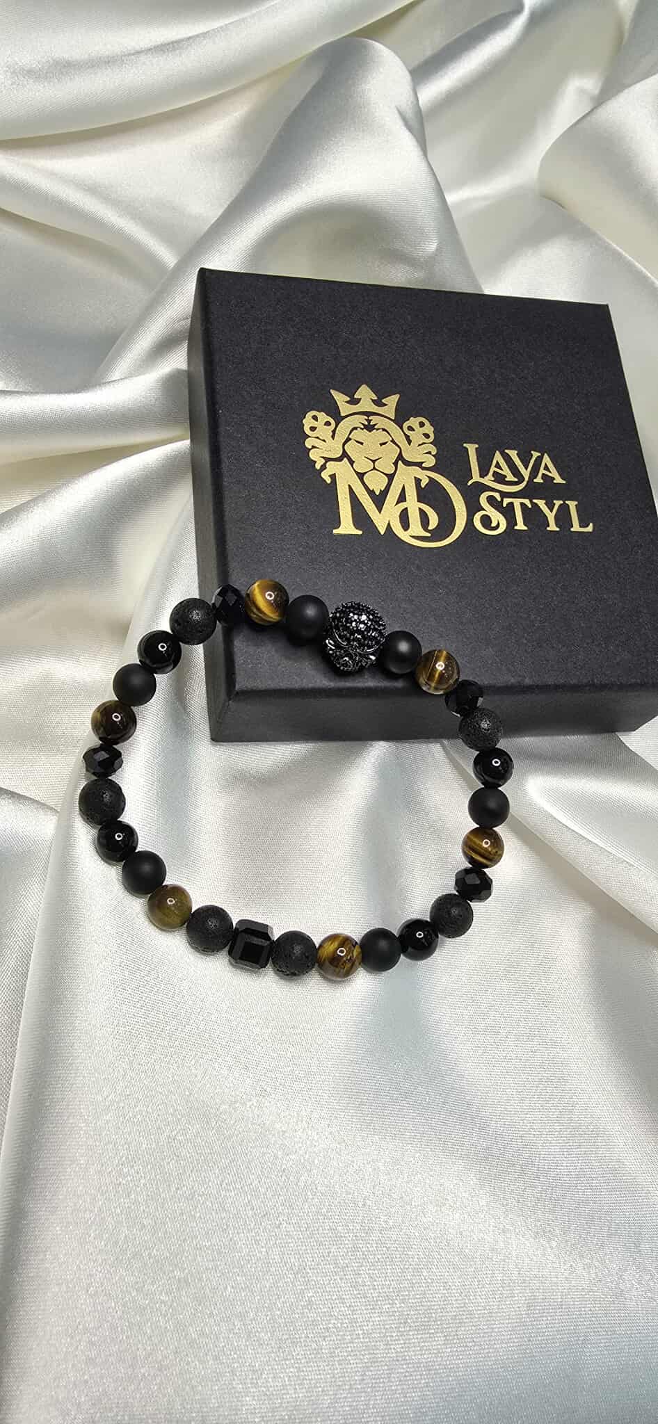 Vyjadrite svoju vnútornú silu a odhodlanie s týmto výrazným pánskym náramkom. Iron Spirit je vyrobený z ónyxu, lávového kameňa a tigrieho oka, doplnený o kovový komponent v tvare lebky – symbol odvahy a nezlomnej energie.