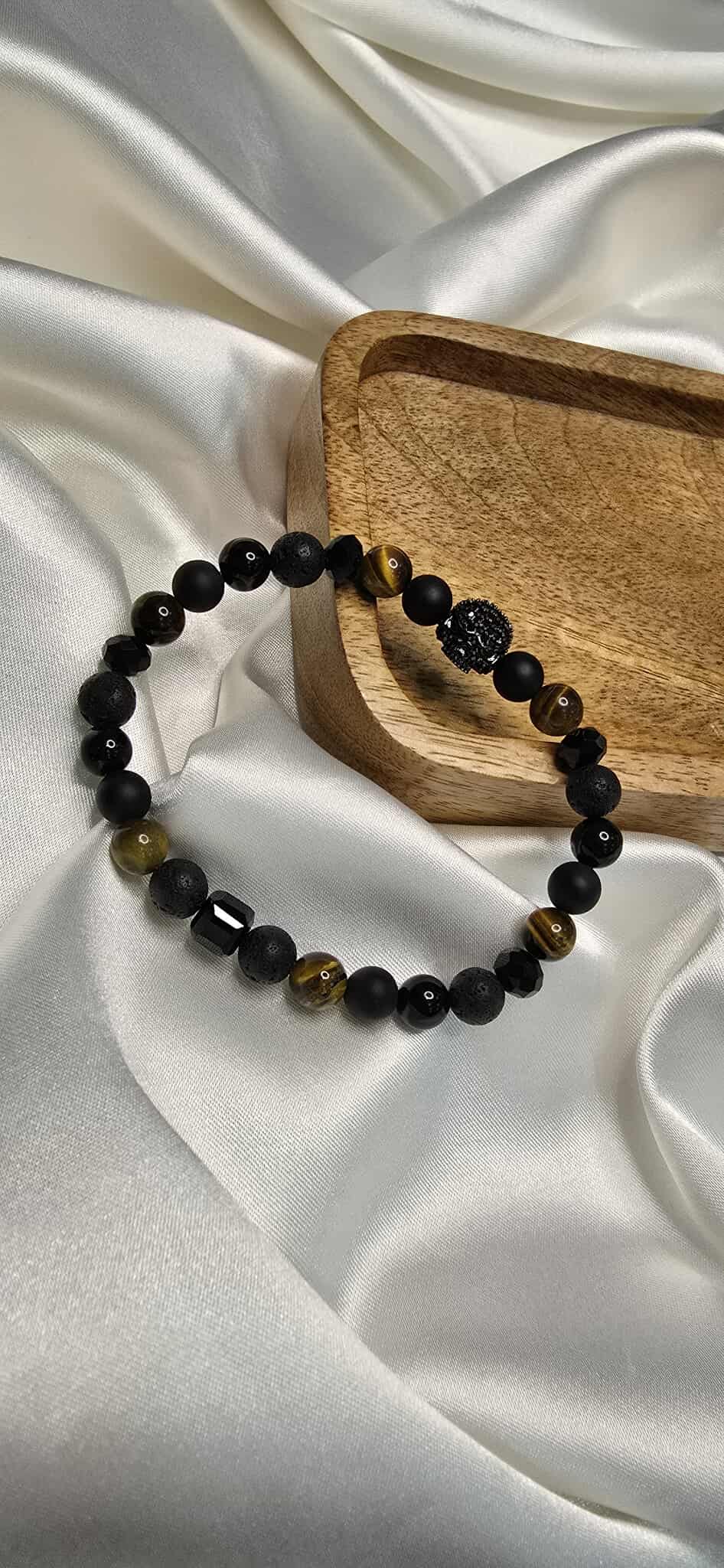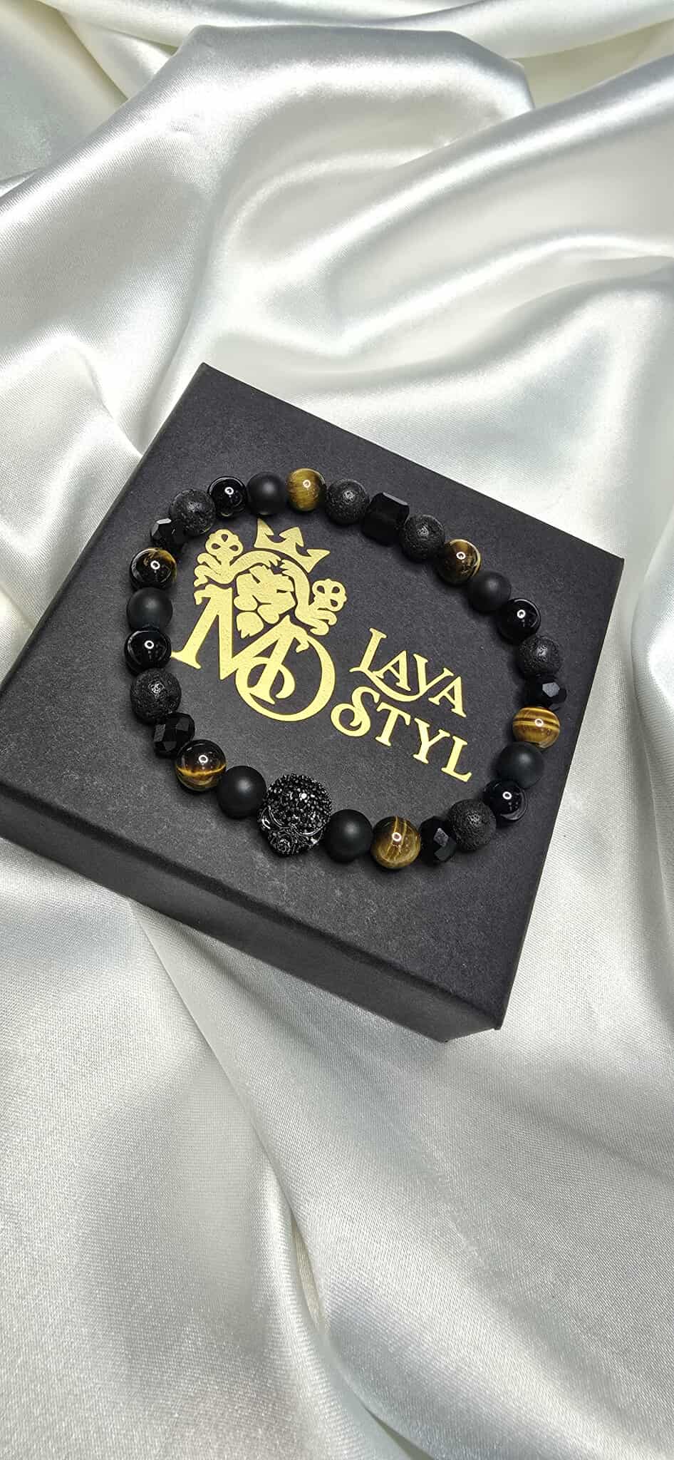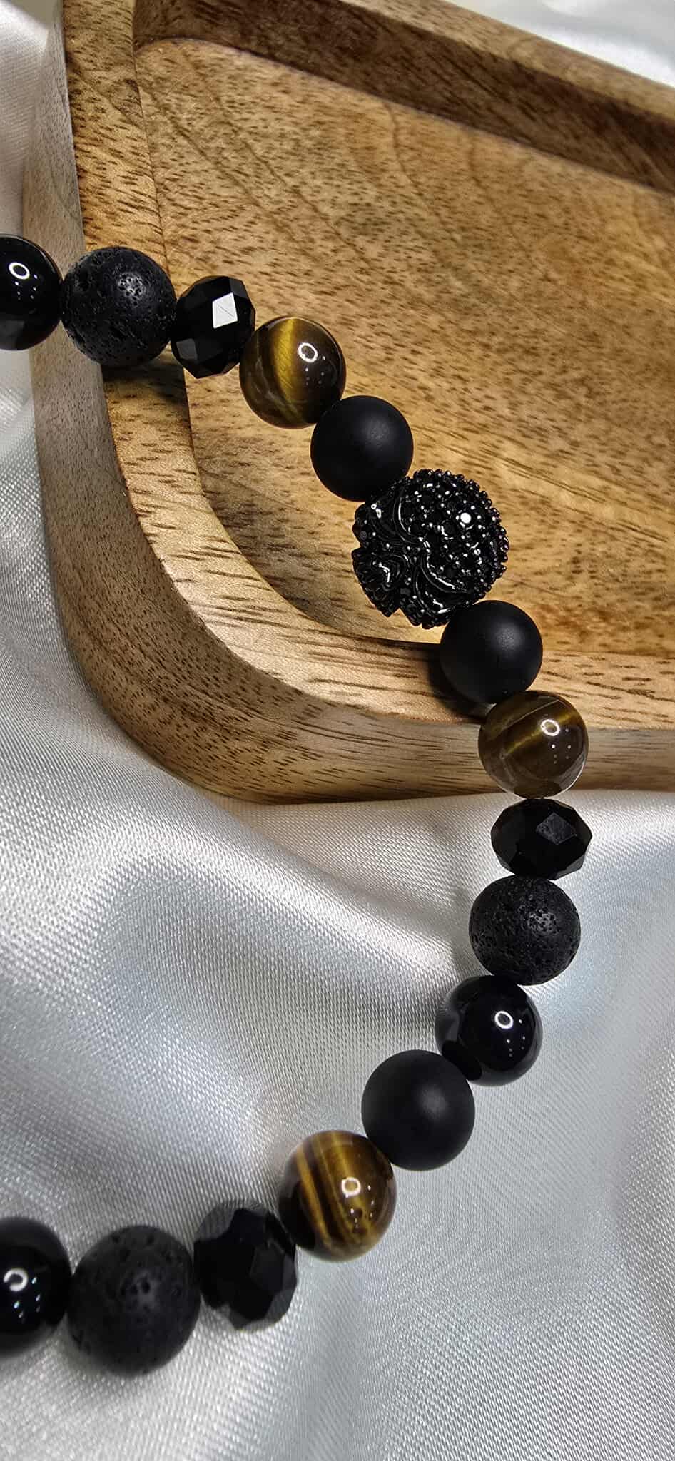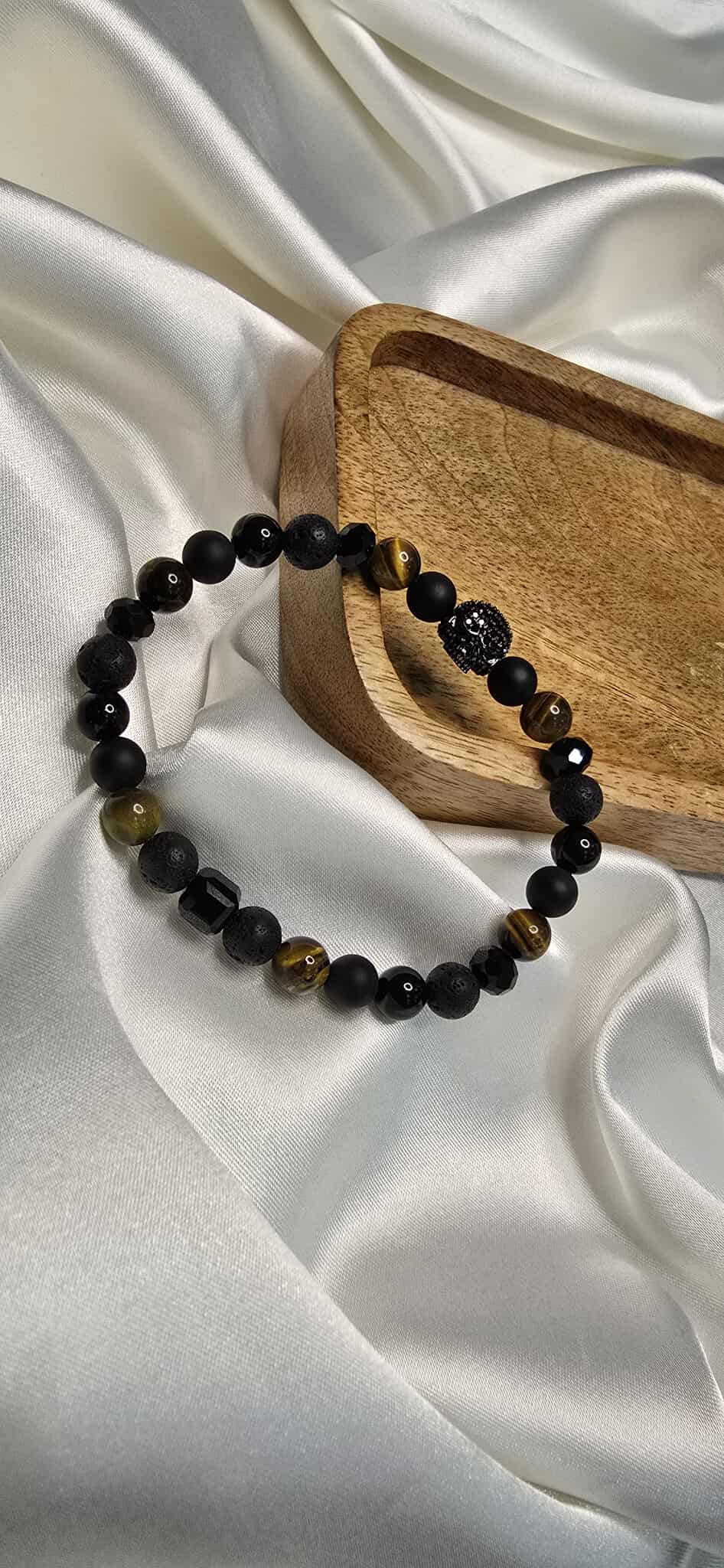 Vyjadrite svoju vnútornú silu a odhodlanie s týmto výrazným pánskym náramkom. Iron Spirit je vyrobený z ónyxu, lávového kameňa a tigrieho oka, doplnený o kovový komponent v tvare lebky – symbol odvahy a nezlomnej energie.