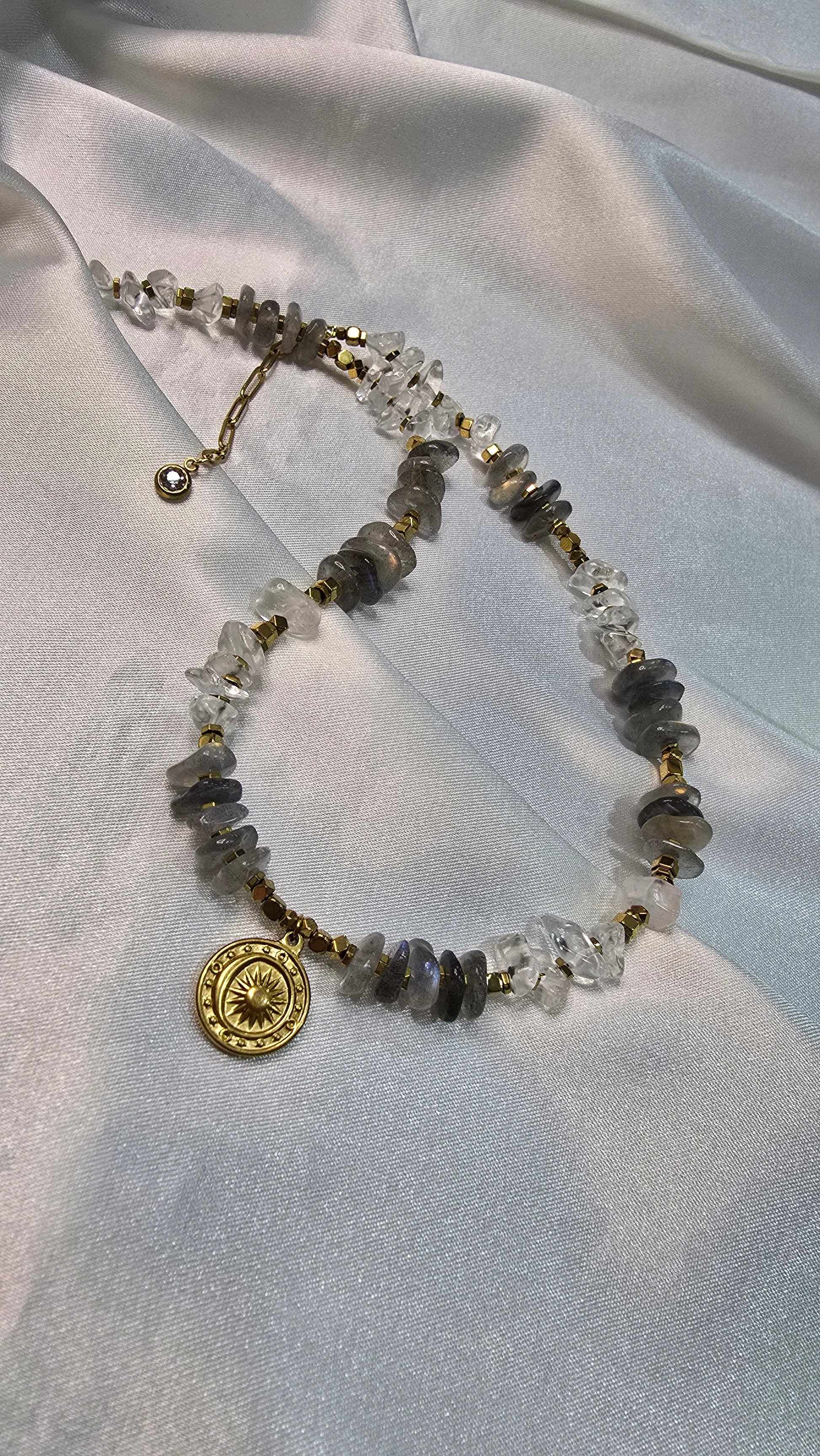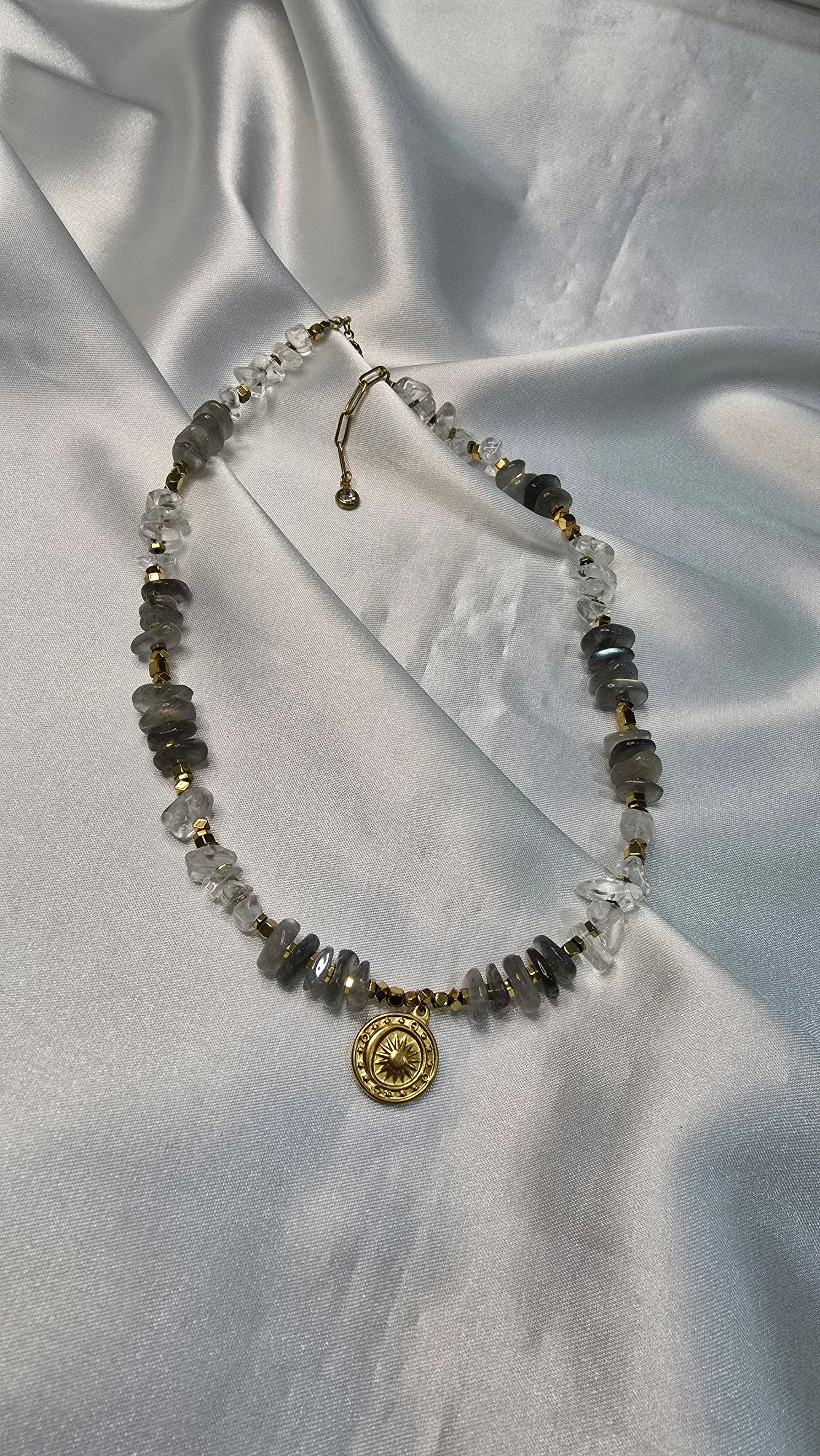 Tento náhrdelník som vytvorila s myšlienkou ochrany, vnútornej sily a jemnej elegancie. Kombinácia labradoritu, krištáľu a hematitu v zlatom tóne v sebe nesie niečo magické.