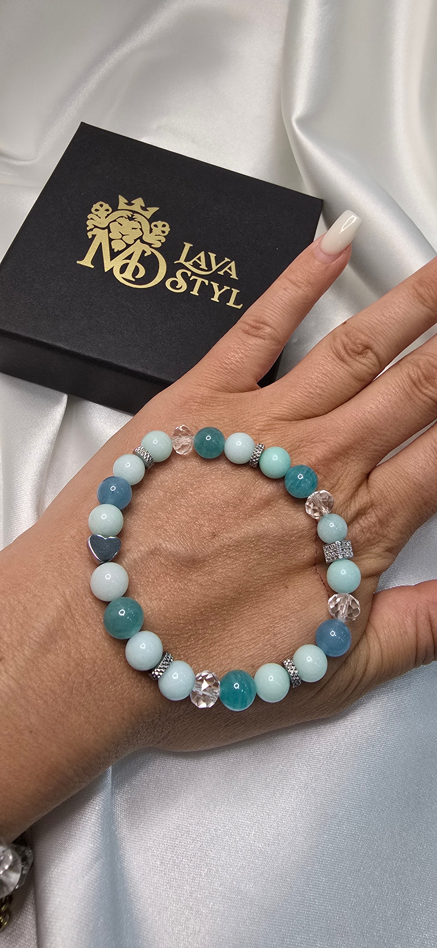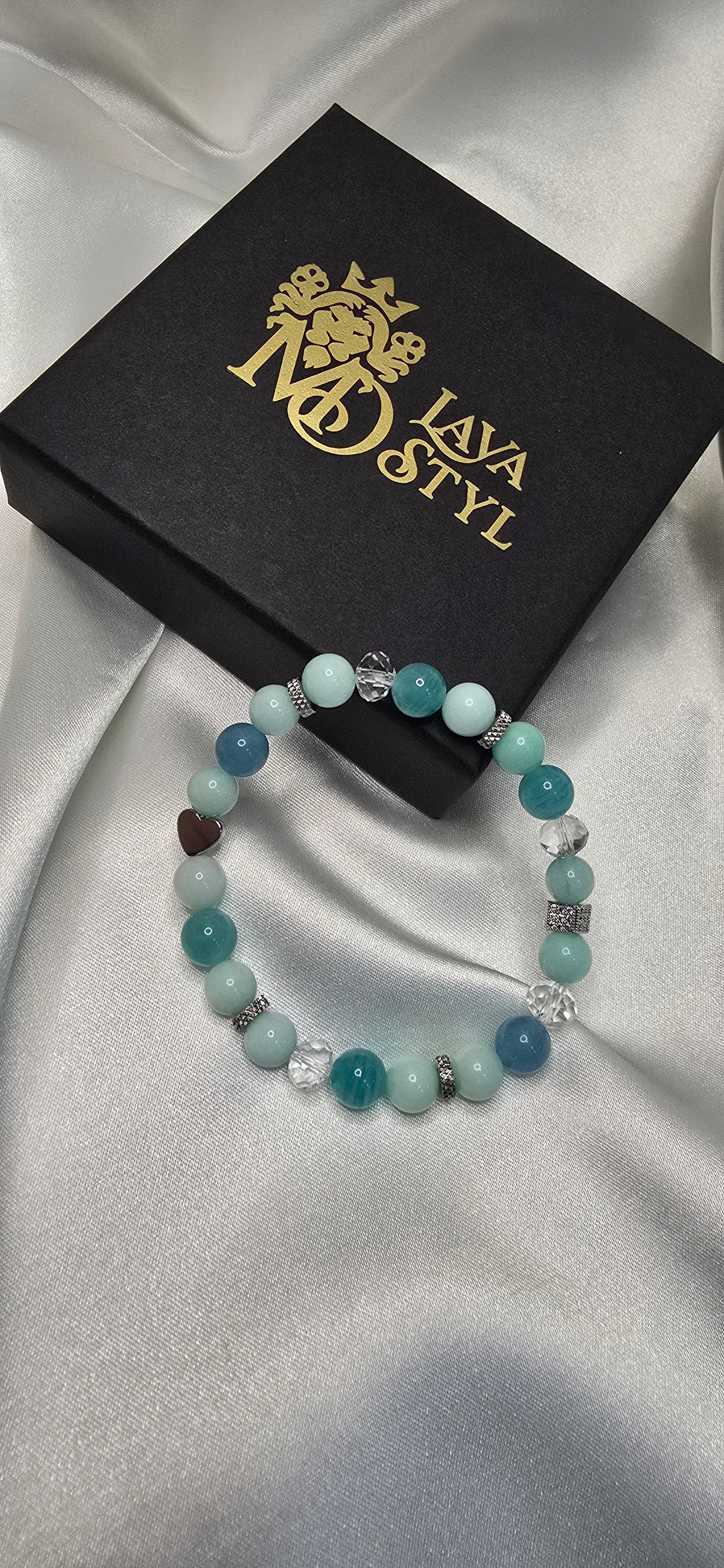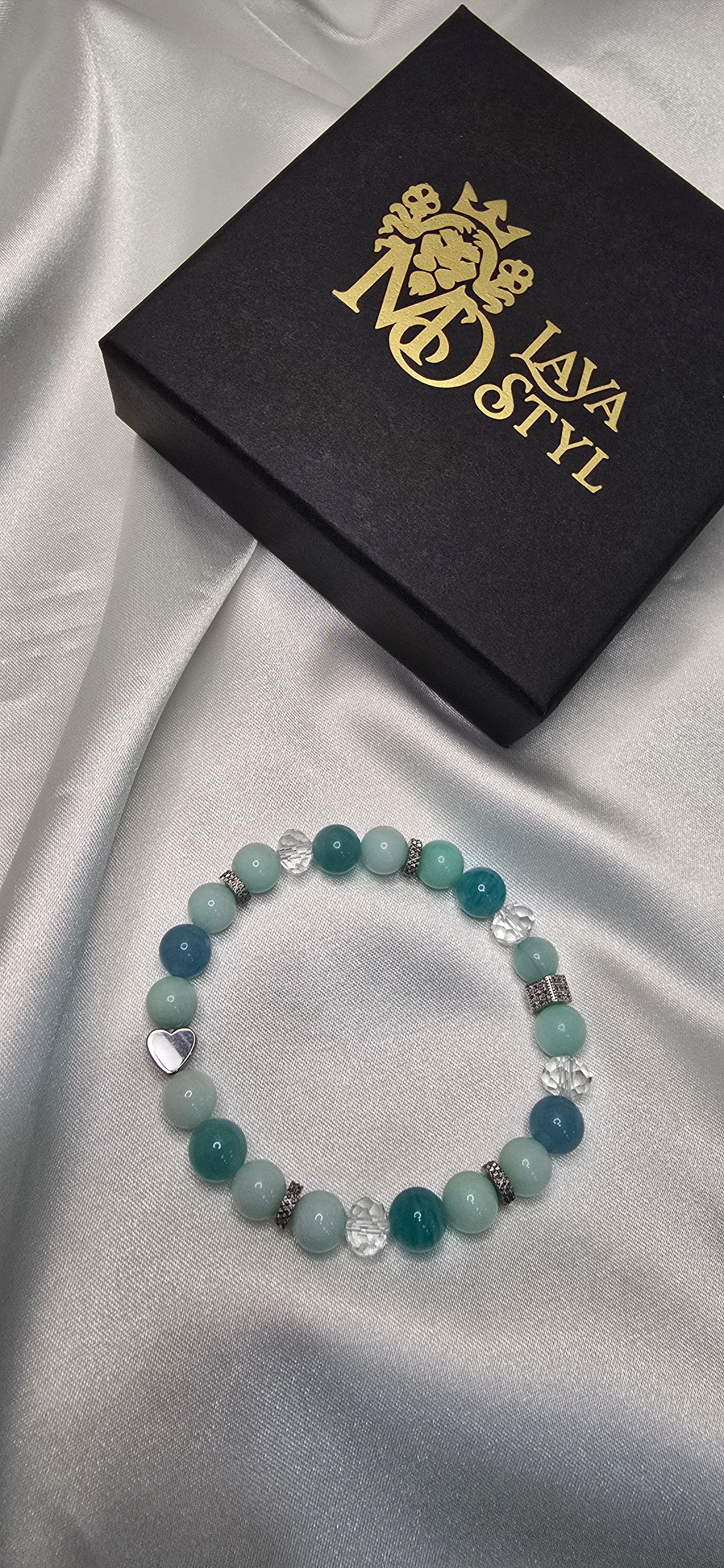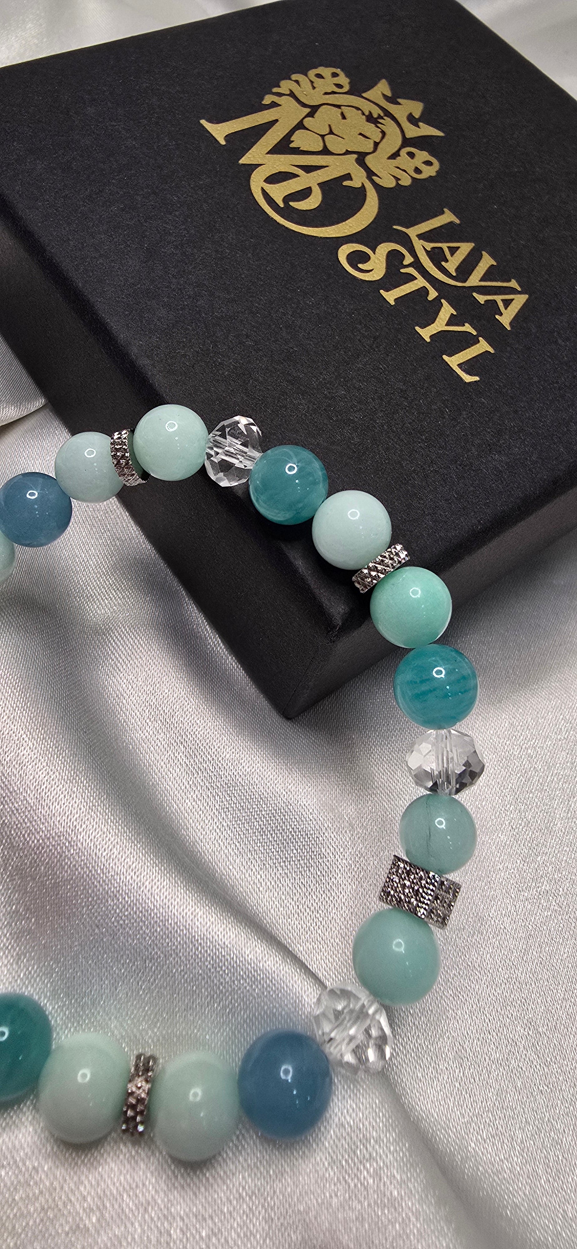 Kombinácia týchto kameňov vytvára upokojujúci a harmonický efekt, ktorý pripomína hladinu pokojnej lagúny. Malajzský nefrit je známy ako kameň harmónie a rovnováhy, zatiaľ čo amazonit prináša pokoj a vyrovnanosť. Náramok je ideálny pre každodenné nosenie a dodá vášmu outfitu jemný, no zároveň výrazný akcent.