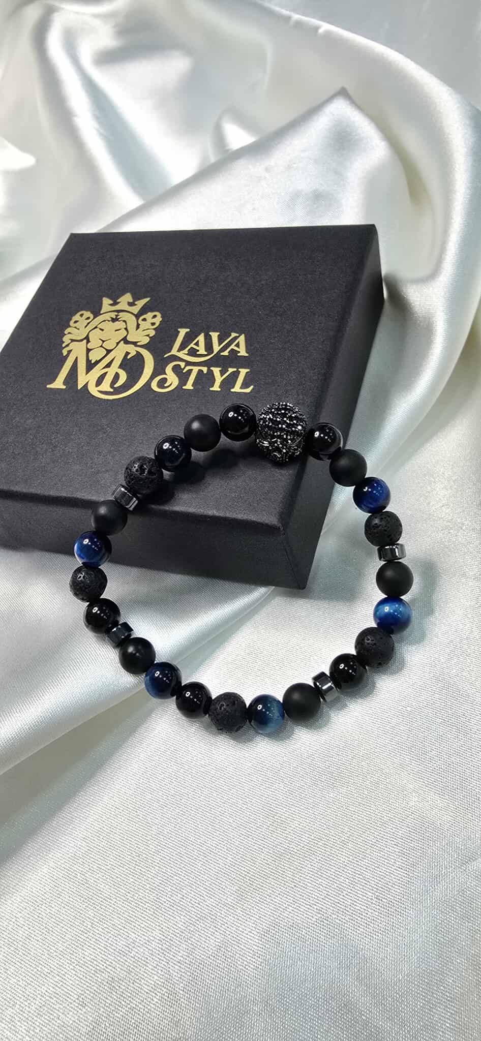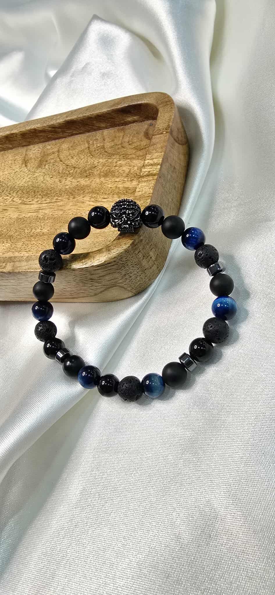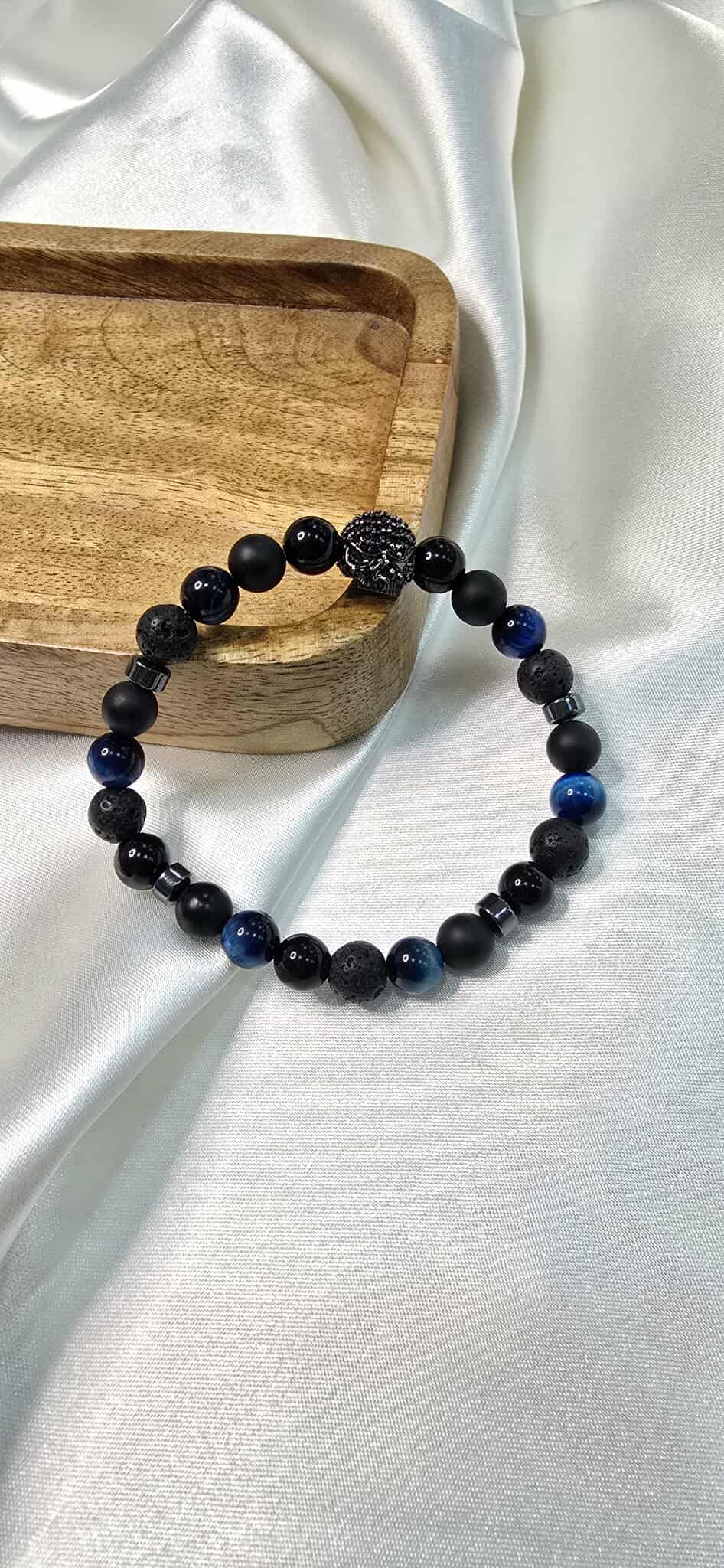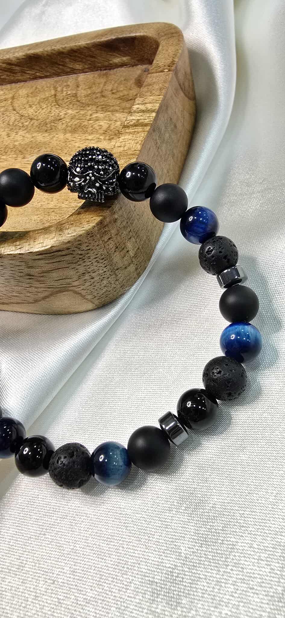 Pánsky náramok Blue Rebellion je výrazným doplnkom pre mužov, ktorí chcú vyjadriť svoju silu a nezávislosť. Je vyrobený z onyxu, lávového kameňa, modrého tigrieho oka a hematitu o priemere 8 mm, doplnený o nerezovú lebku, ktorá symbolizuje odvahu, charakter a nezlomnosť.