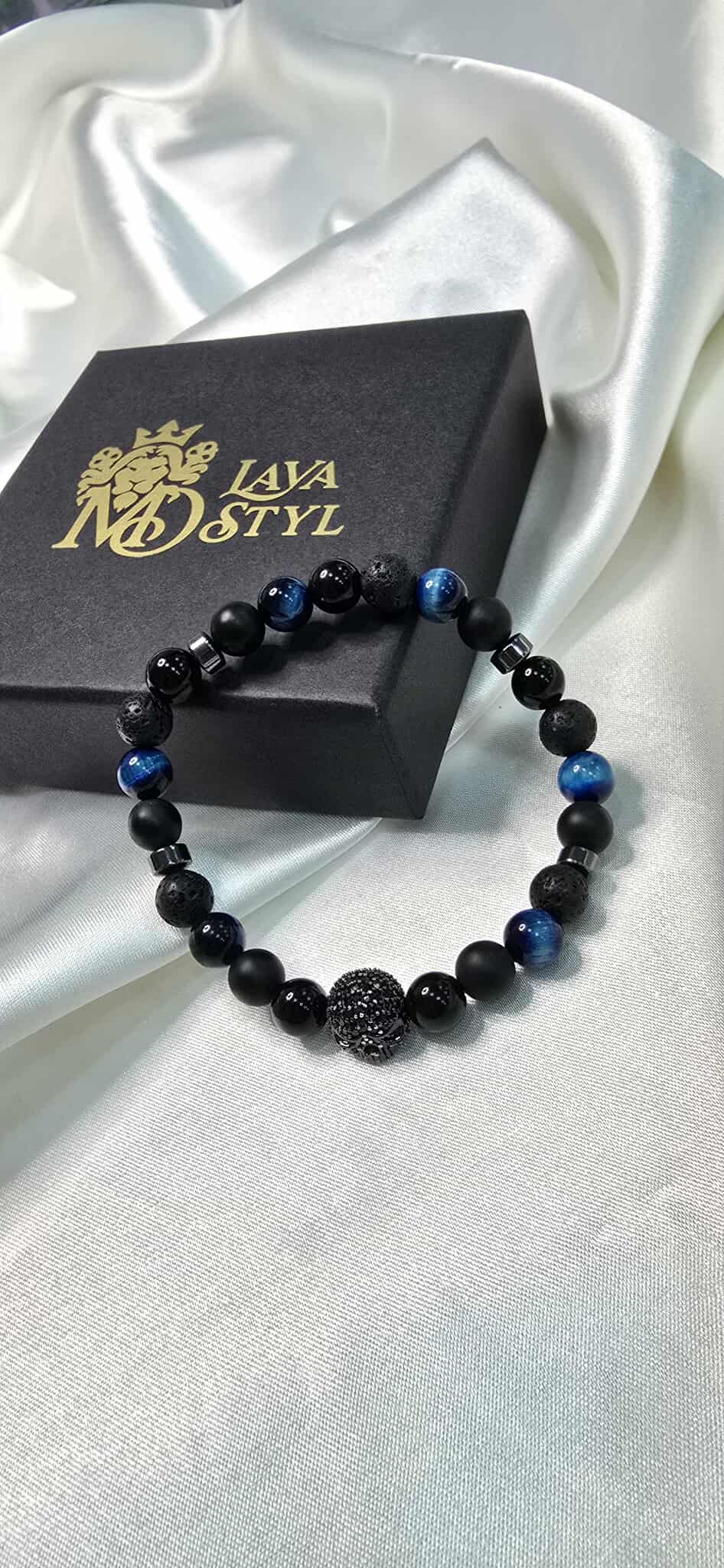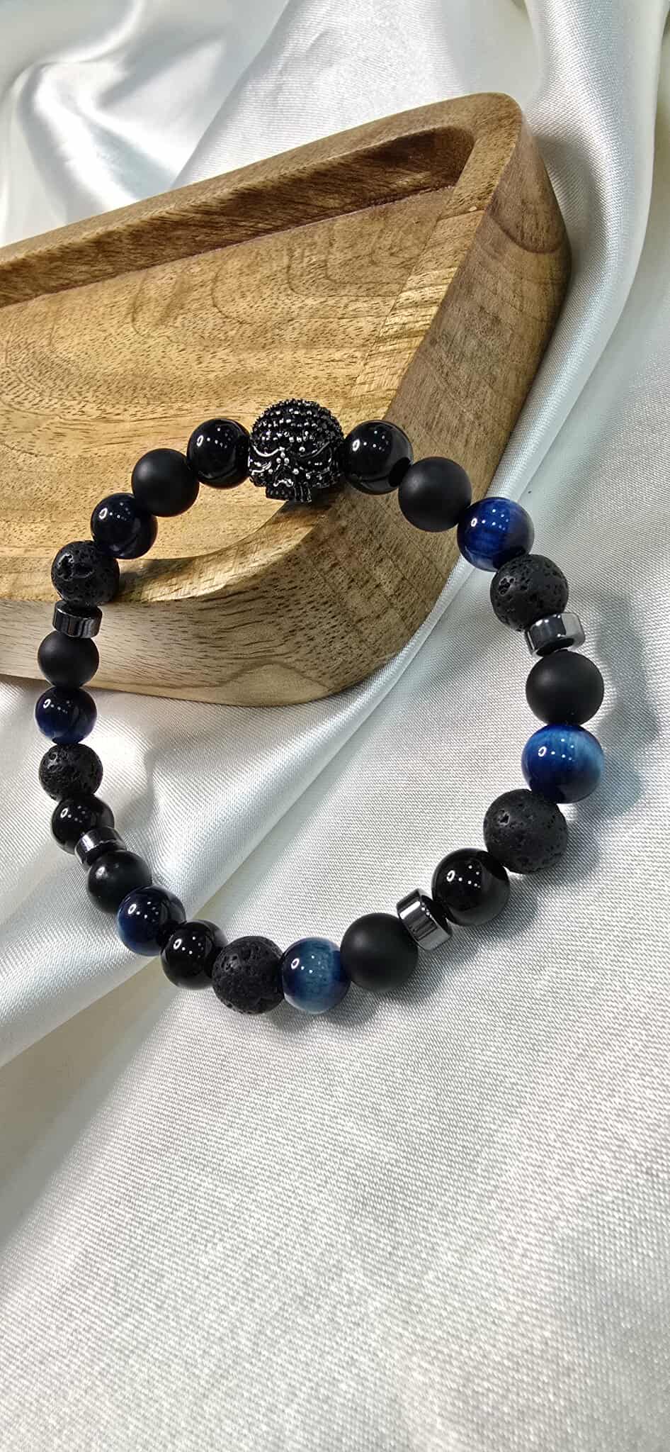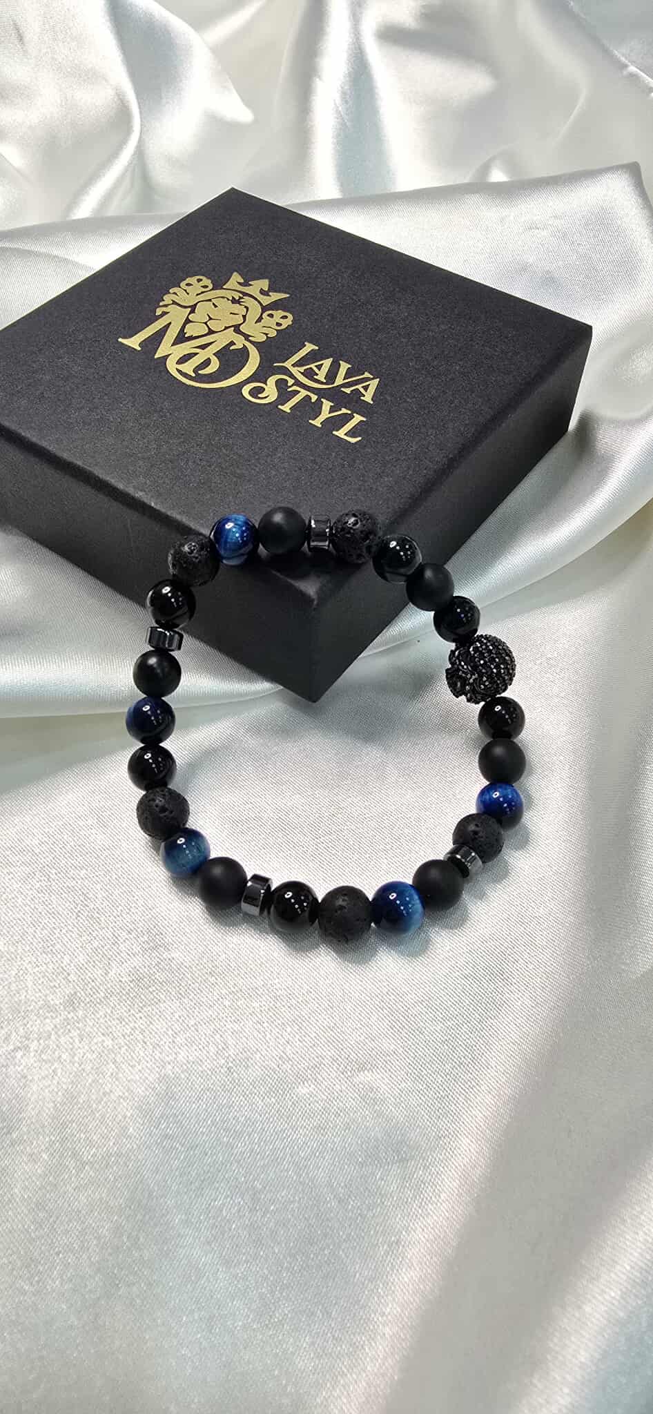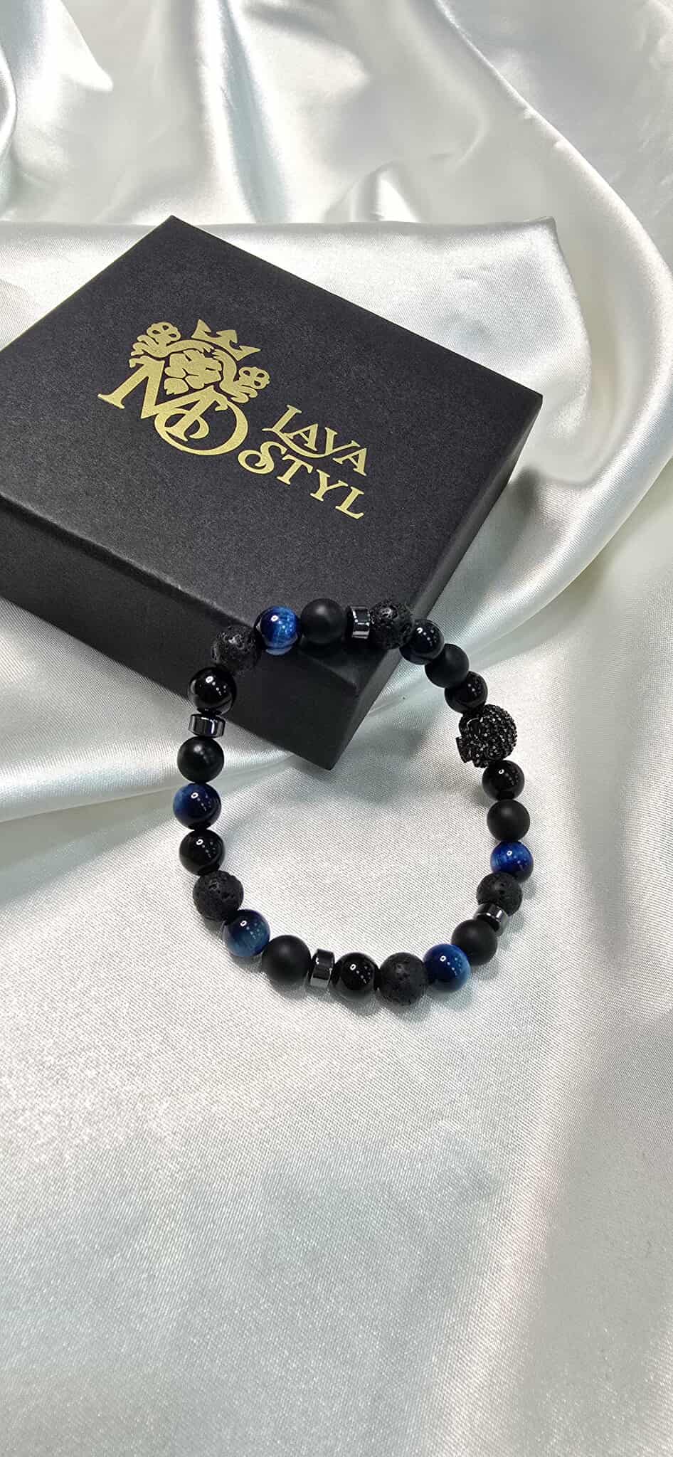 Pánsky náramok Blue Rebellion je výrazným doplnkom pre mužov, ktorí chcú vyjadriť svoju silu a nezávislosť. Je vyrobený z onyxu, lávového kameňa, modrého tigrieho oka a hematitu o priemere 8 mm, doplnený o nerezovú lebku, ktorá symbolizuje odvahu, charakter a nezlomnosť.