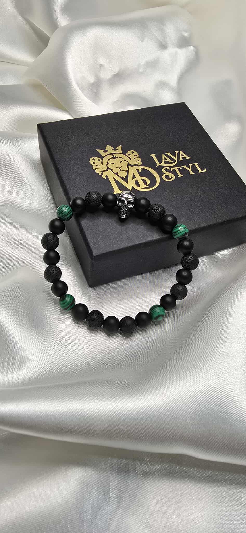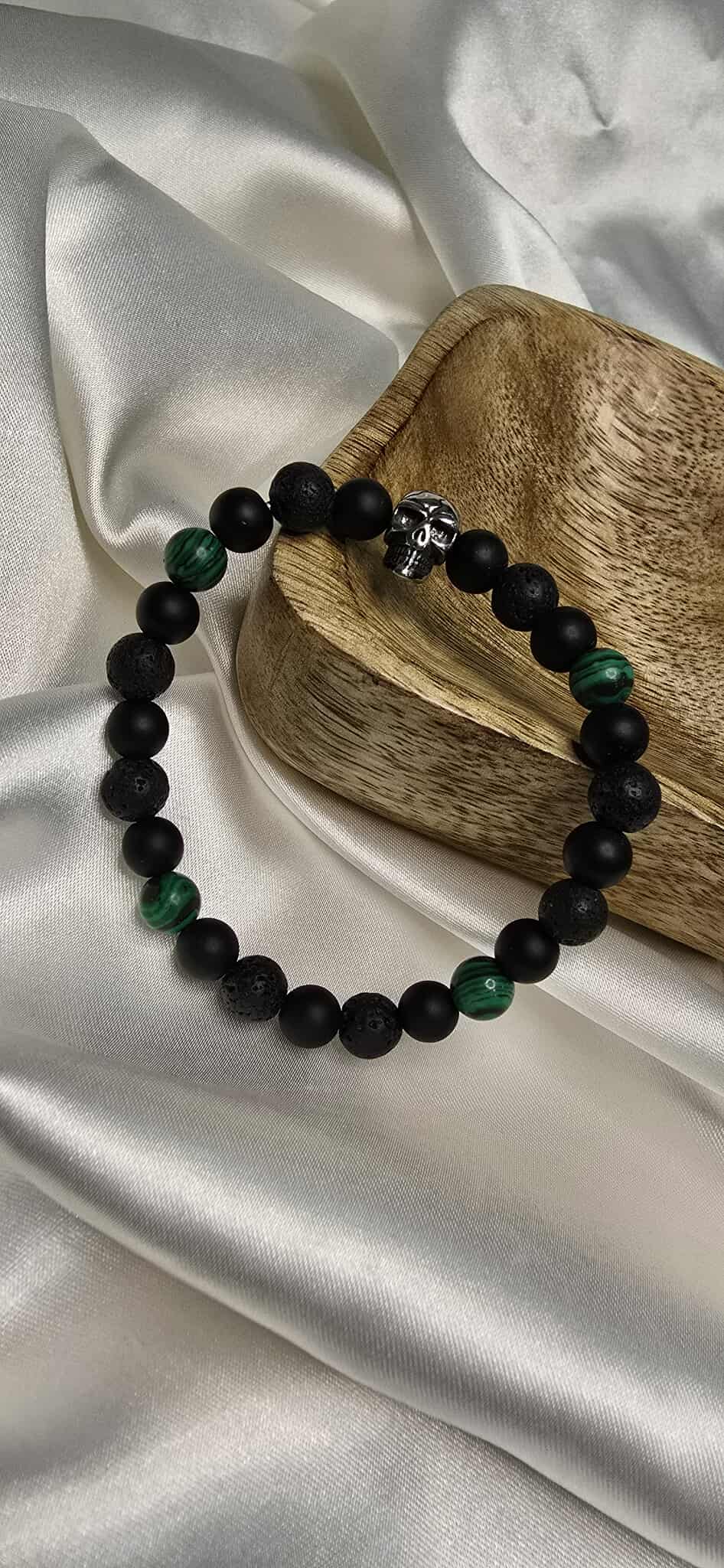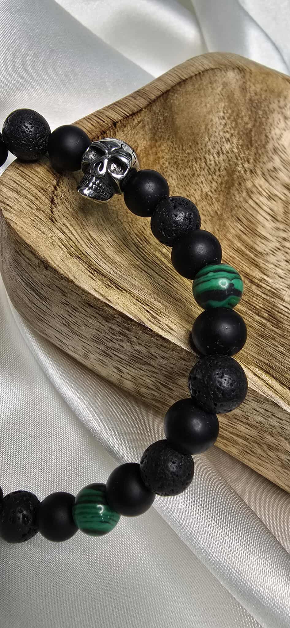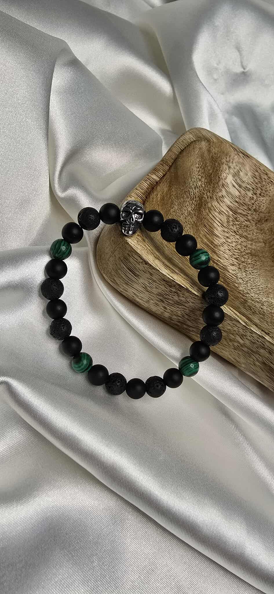 Pánsky náramok Guardian Spirit spája silu prírody a odvahu bojovníka. Je vyrobený z ónyxu, malachitu a lávového kameňa s priemerom 8 mm, doplnený o nerezovú lebku, ktorá symbolizuje odhodlanie a vnútornú moc.