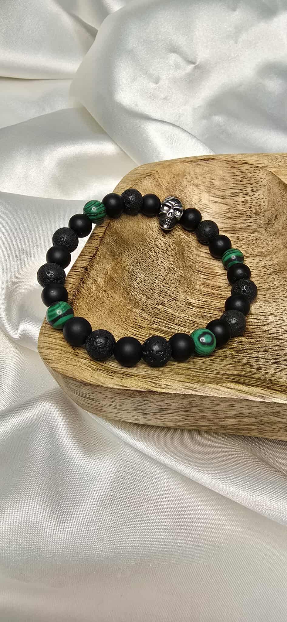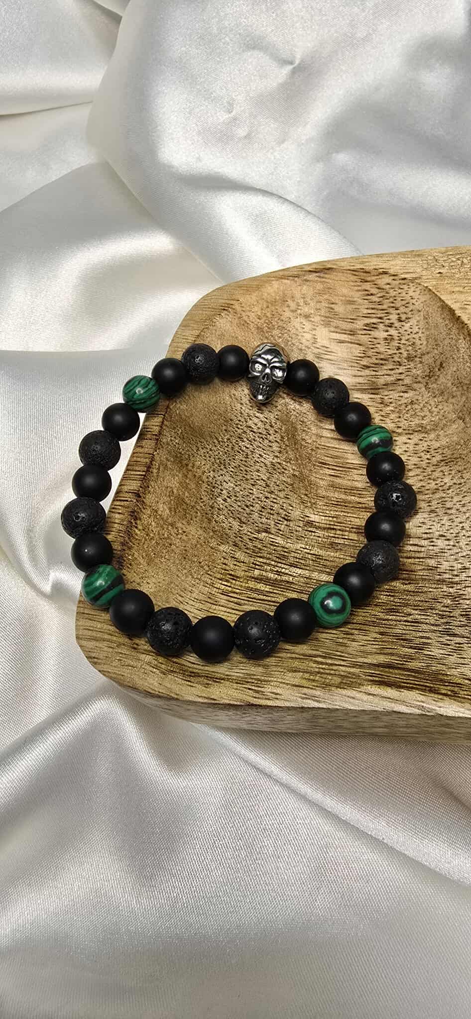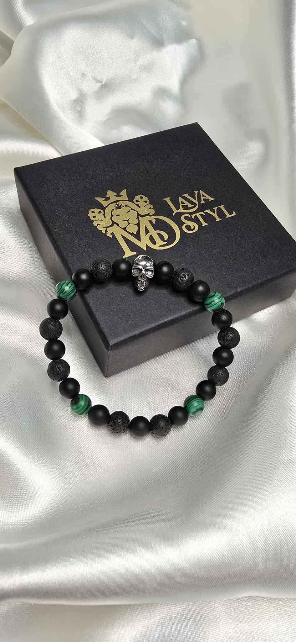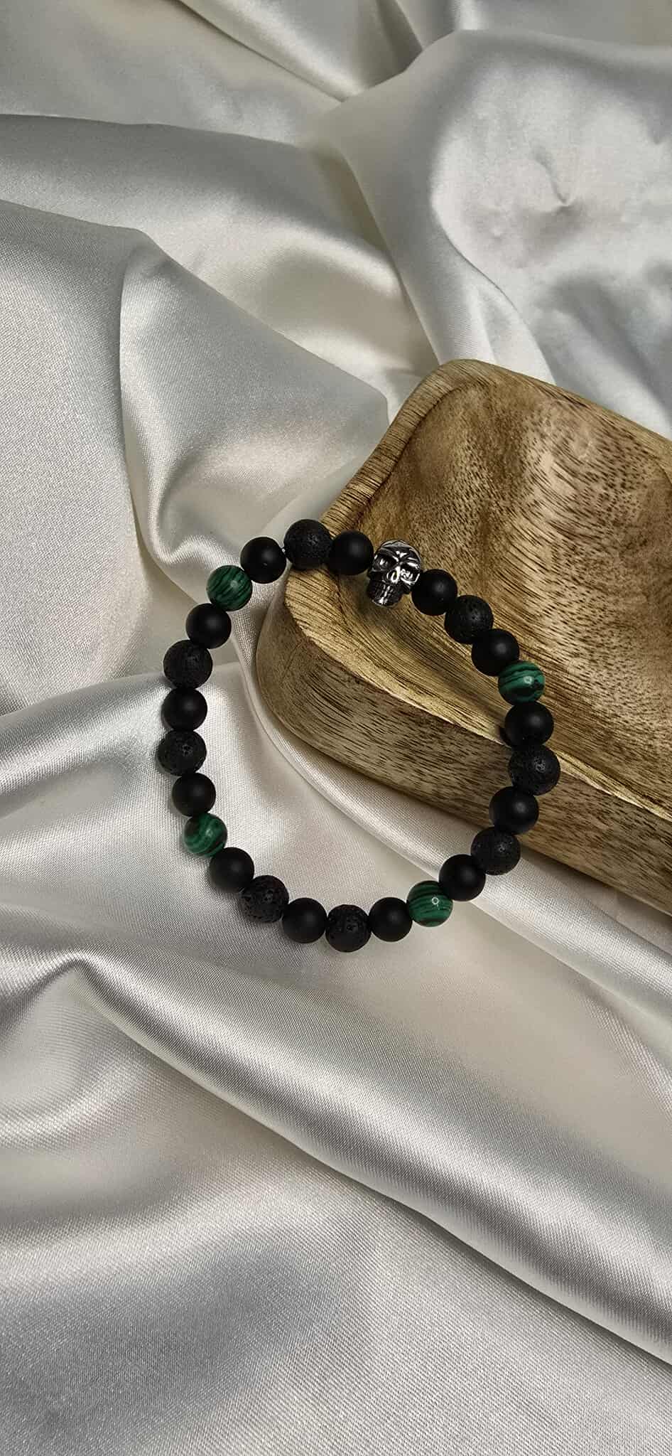 Pánsky náramok Guardian Spirit spája silu prírody a odvahu bojovníka. Je vyrobený z ónyxu, malachitu a lávového kameňa s priemerom 8 mm, doplnený o nerezovú lebku, ktorá symbolizuje odhodlanie a vnútornú moc.