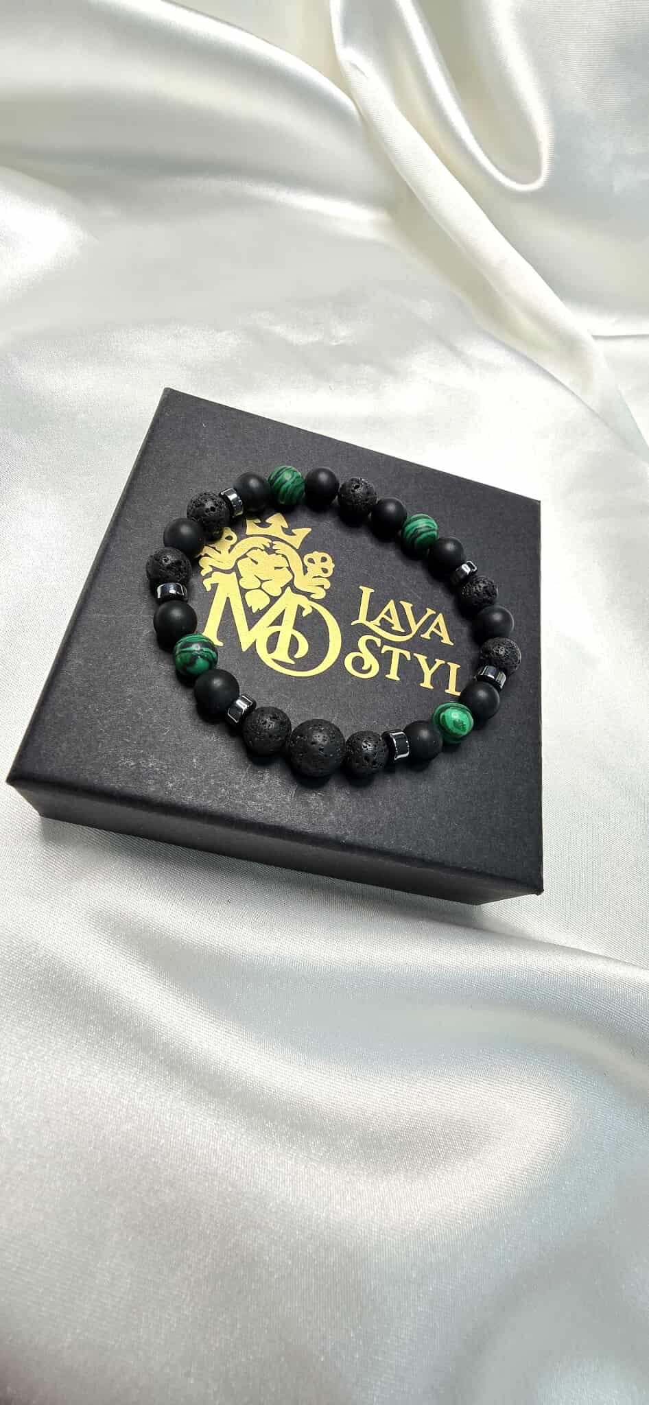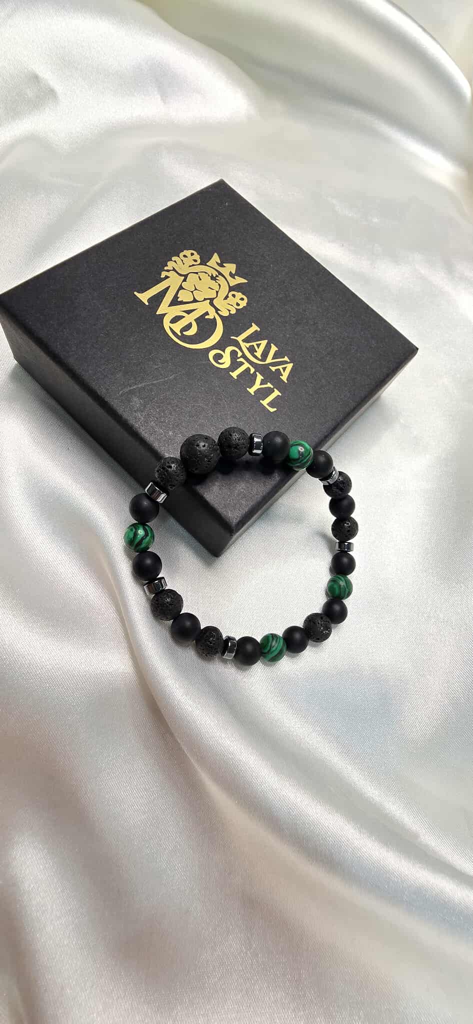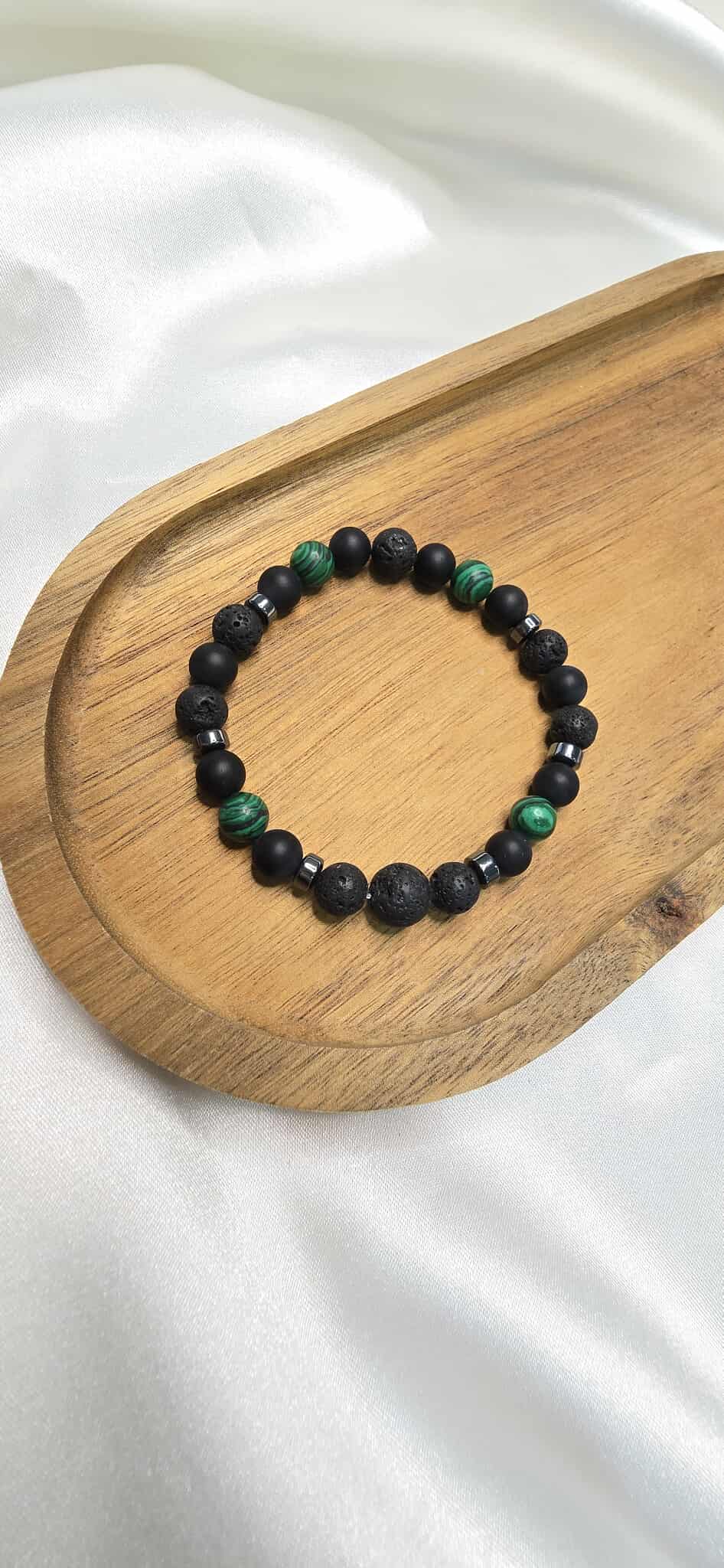Tento pánsky šperk kombinuje Malachit, matný Ónyx, Lávový kameň a Hematit, ktoré prinášajú ochranu, vnútornú rovnováhu, odvahu a energiu.