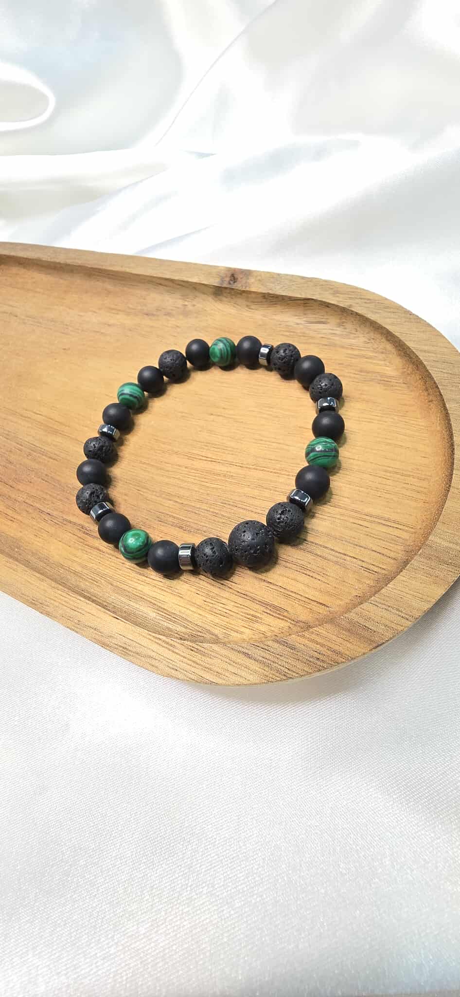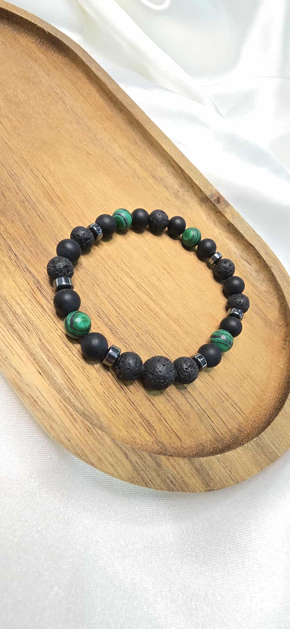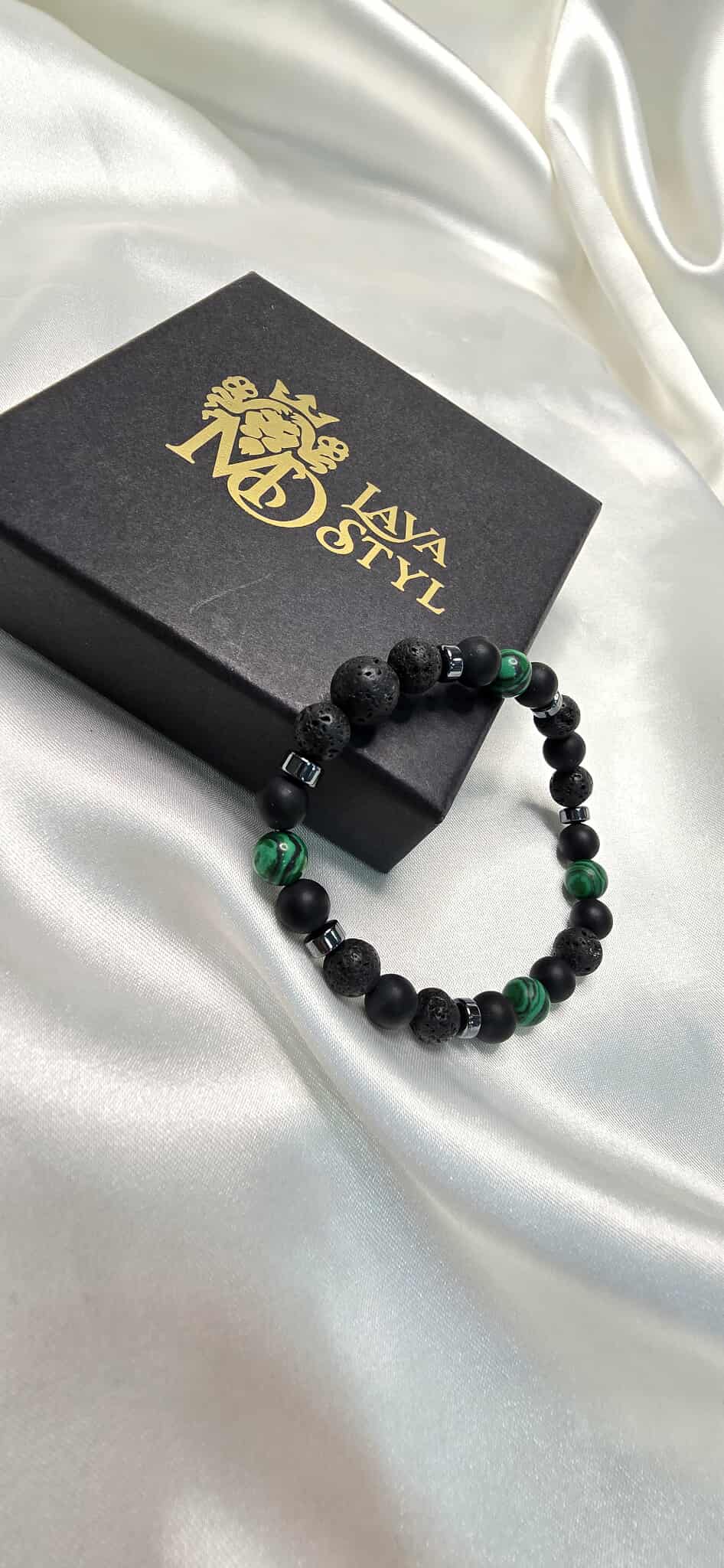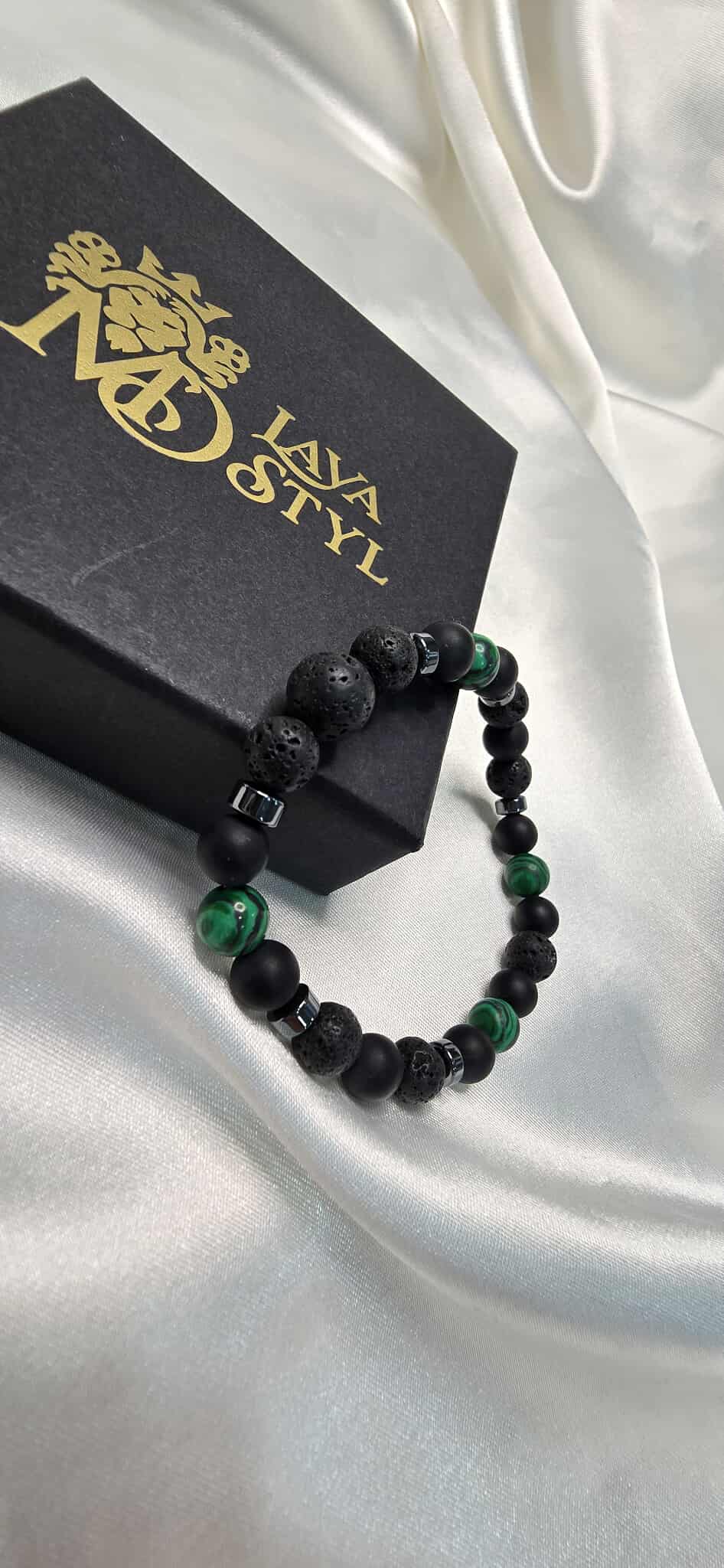 Tento pánsky šperk kombinuje Malachit, matný Ónyx, Lávový kameň a Hematit, ktoré prinášajú ochranu, vnútornú rovnováhu, odvahu a energiu.