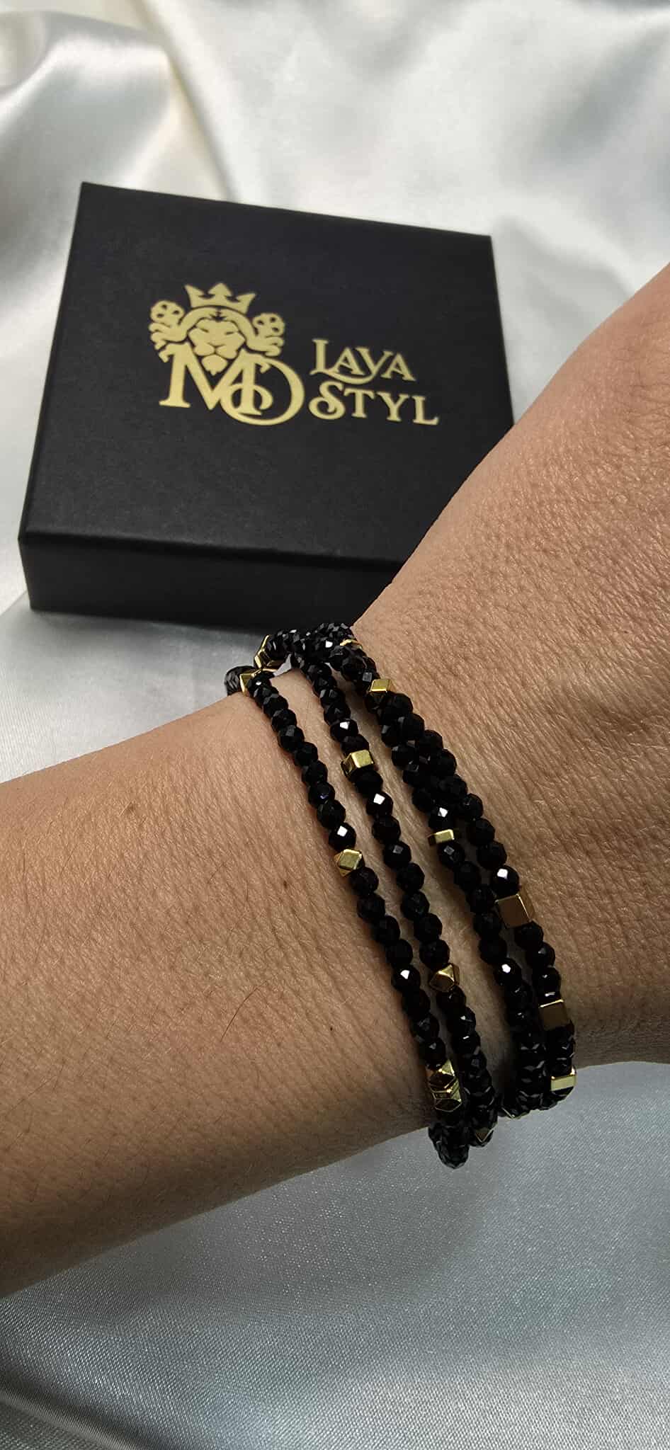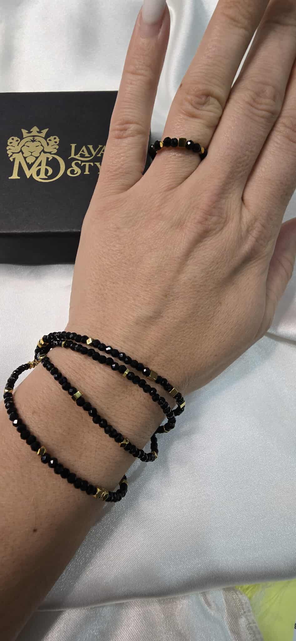 Dámsky náramok Midnight Elegance prináša jemnosť, štýl a nadčasovú eleganciu. Je vyrobený z čierneho spinelitu a hematitu, naviazaný zo štvorice tenkých pásikov, ktoré spolu vytvárajú vzdušný a sofistikovaný vzhľad.