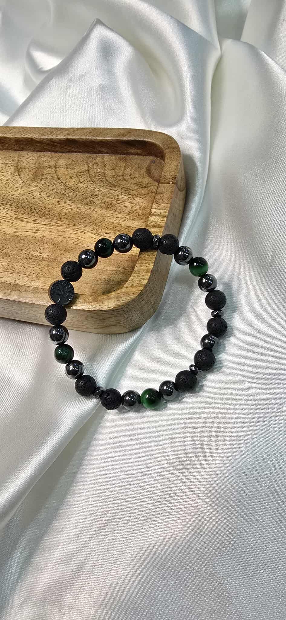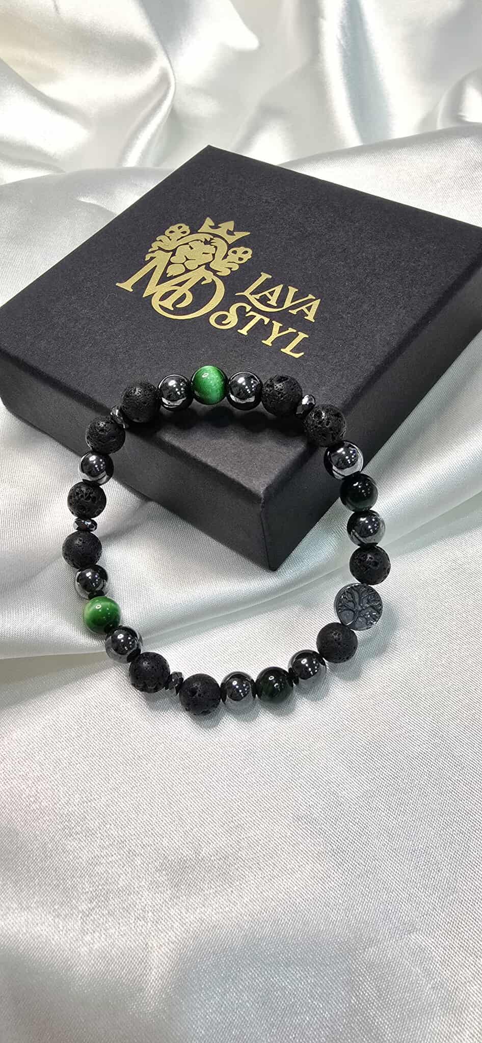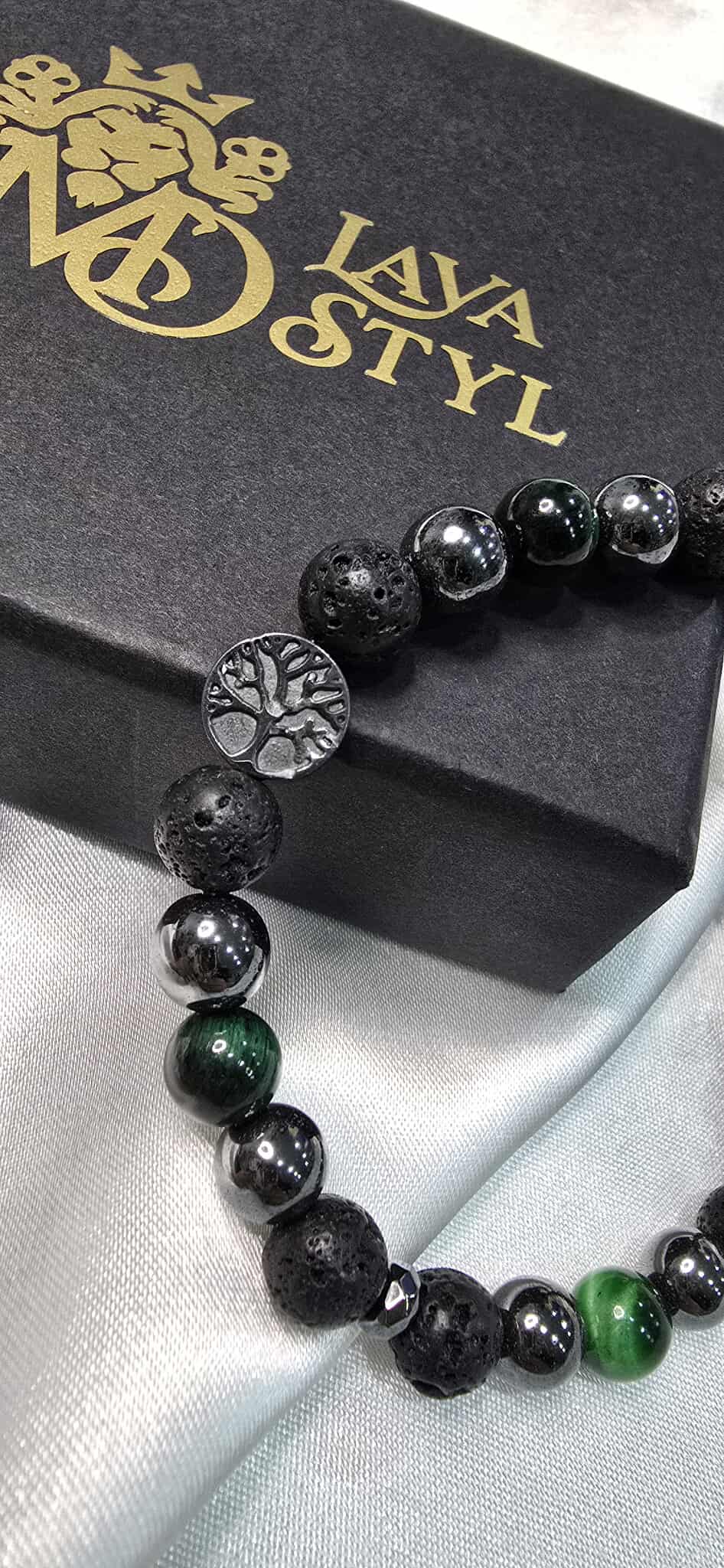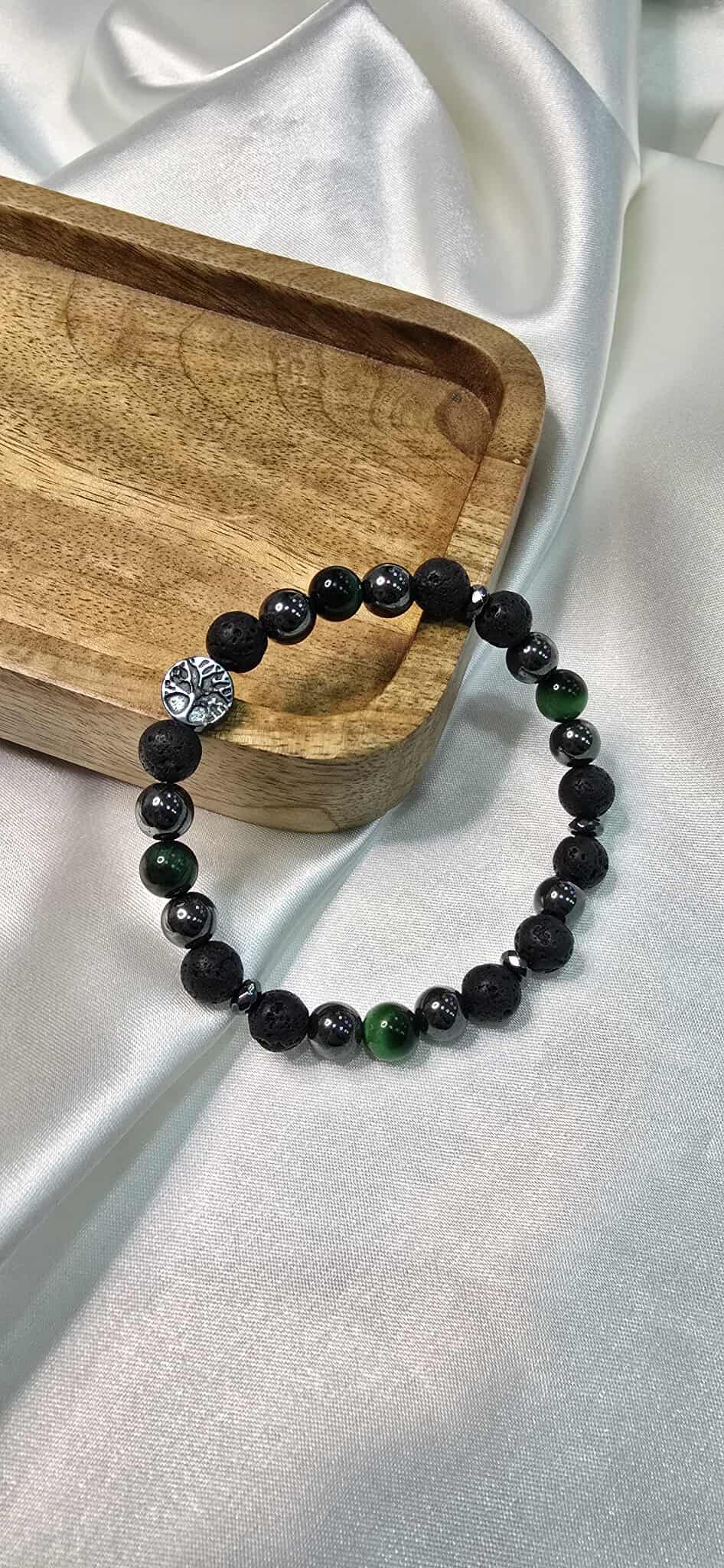 Pánsky náramok Roots of Strength spája energiu prírody a vnútornú silu. Je vyrobený z lávového kameňa, hematitu a zeleného tigrieho oka o priemere 8 mm a doplnený o komponent strom života z hematitu, ktorý symbolizuje rast, múdrosť a spojenie so životnou energiou.