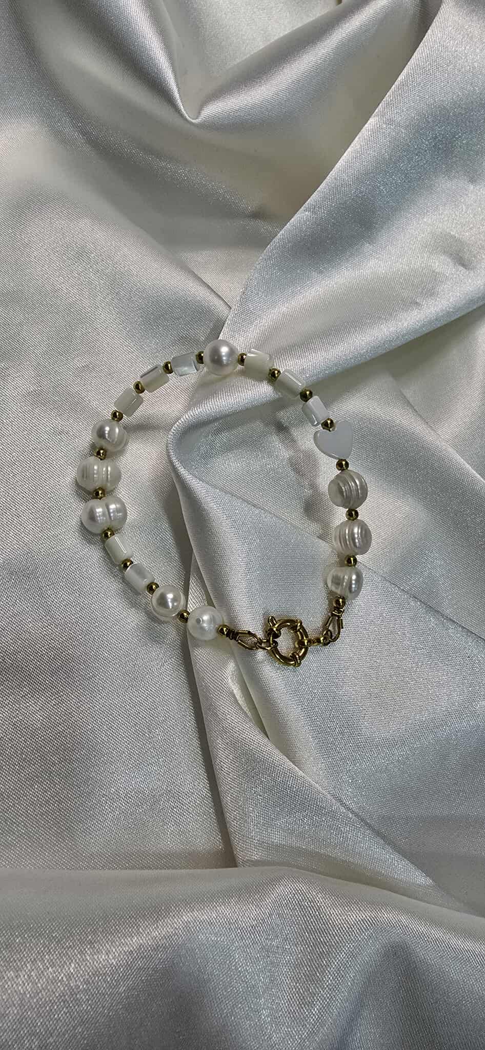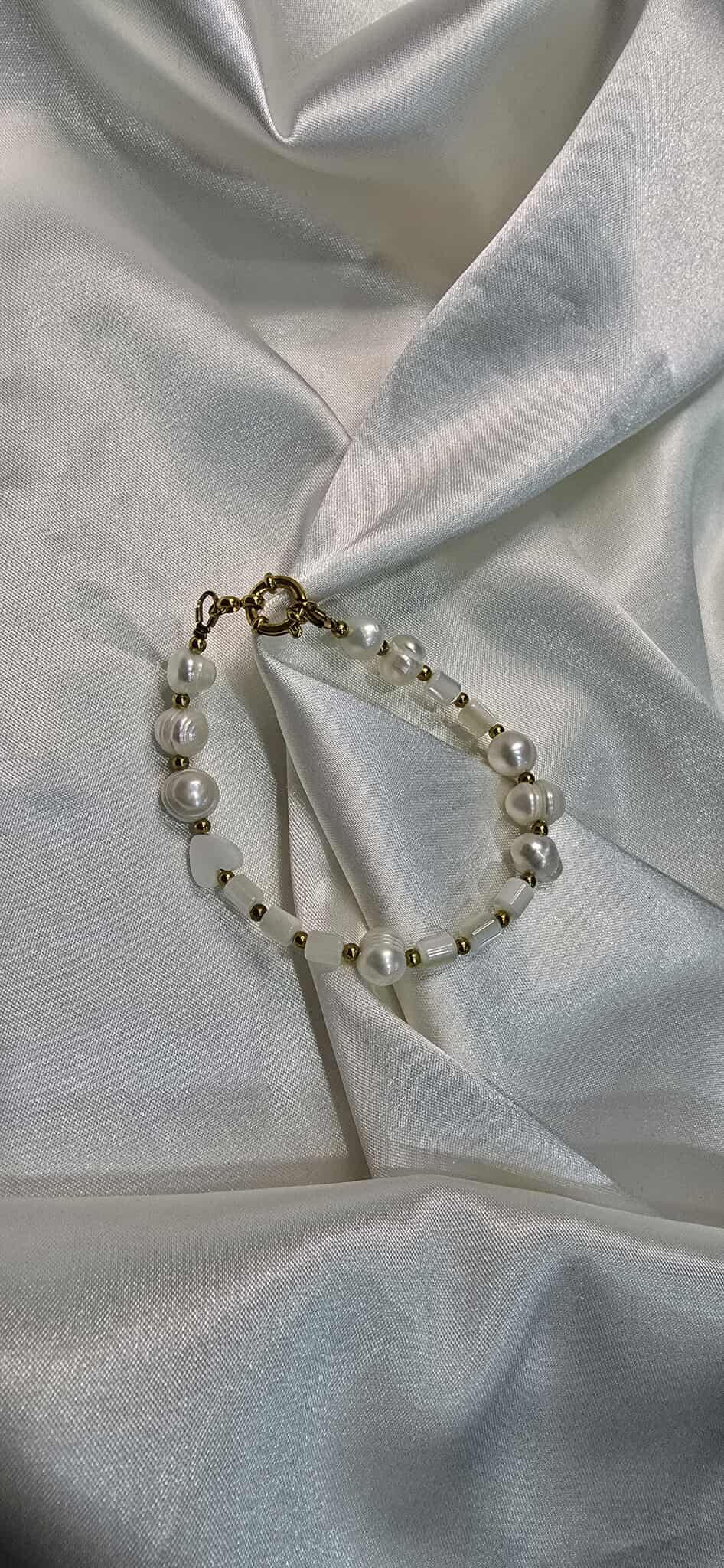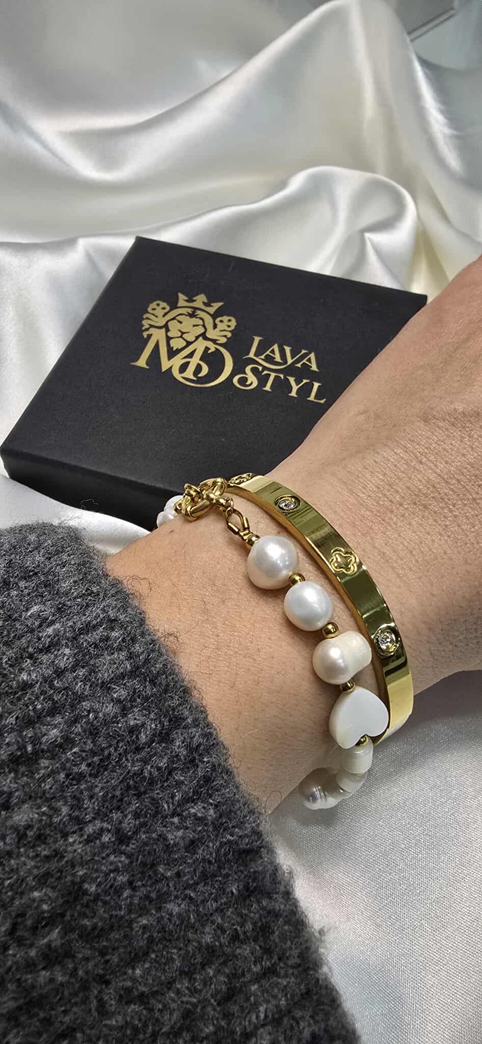 Náramok z perál – zlatá edícia Jemný a prirodzene luxusný náramok vytvorený z pravých perál a mušľového elementu Perlete, ktorý dodáva šperku nádych leta, slobody a dotyk mora. Každá perla je jedinečná, rovnako ako žena, ktorá ju nosí – s vlastným leskom, príbehom a silou. Doplnený je o nerezové komponenty v zlatom prevedení, vďaka ktorým si zachová dlhú životnosť a krásny elegantný vzhľad. Ideálny na každodenné nosenie aj ako jemný doplnok k špeciálnym príležitostiam.