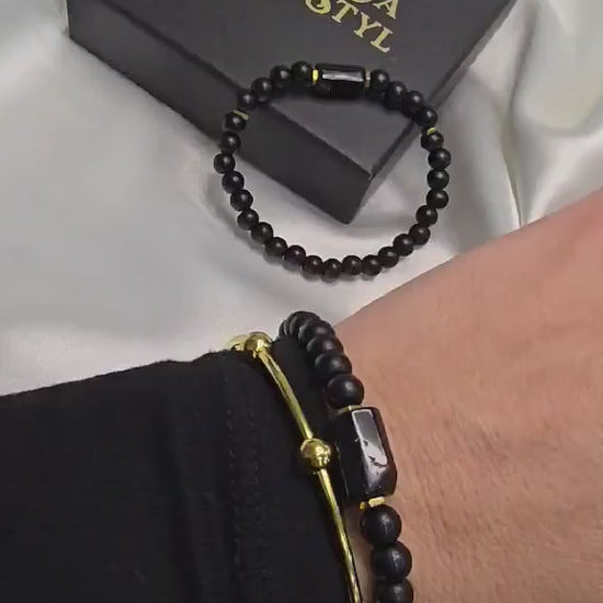 Objavte výrazný náramok z minerálneho kameňa Ónyx doplnený o prírodný turmalín, ktorý v sebe spája silu zeme a elegantný dizajn. Tento unisex doplnok je ideálny aj ako partnerský náramok – pre dvojice, ktoré chcú nosiť niečo symbolické, štýlové a harmonické.