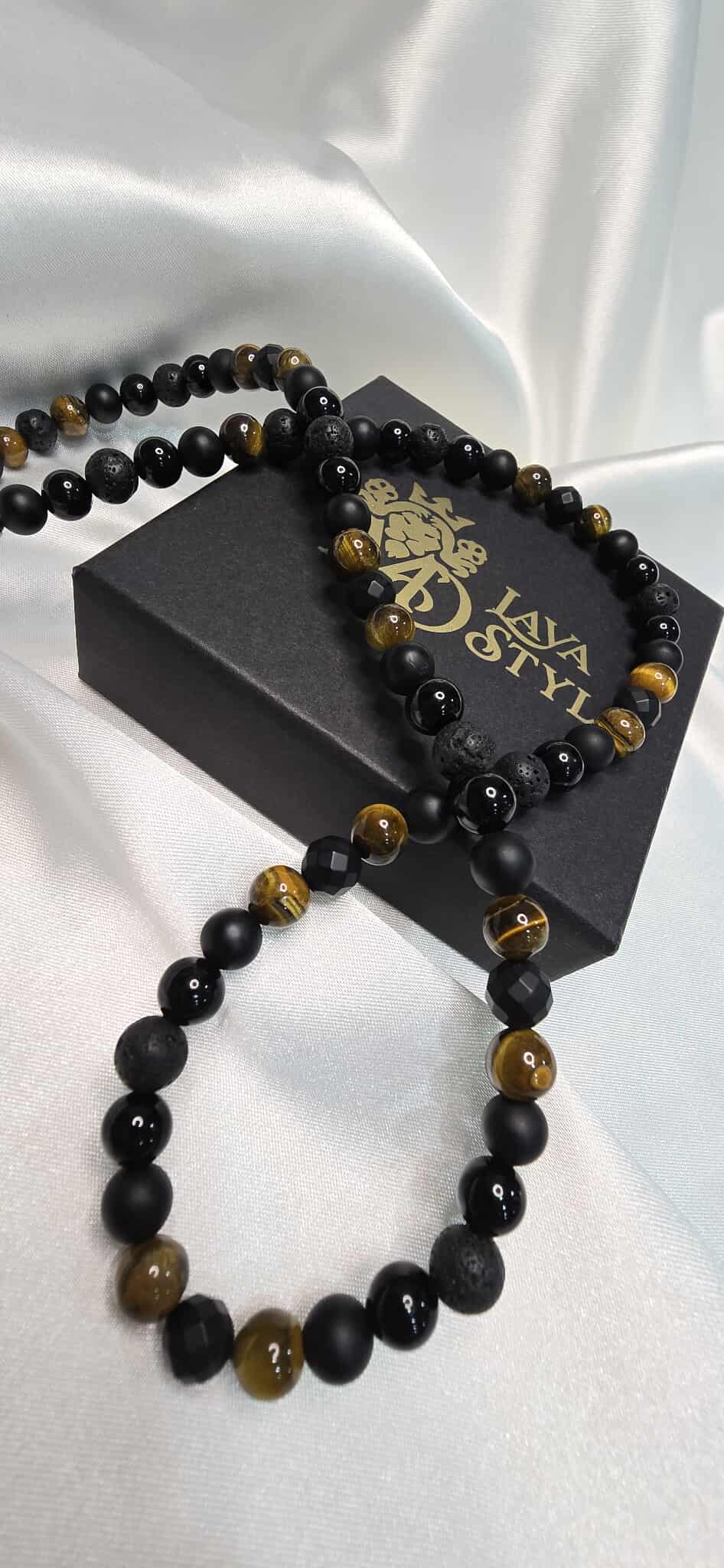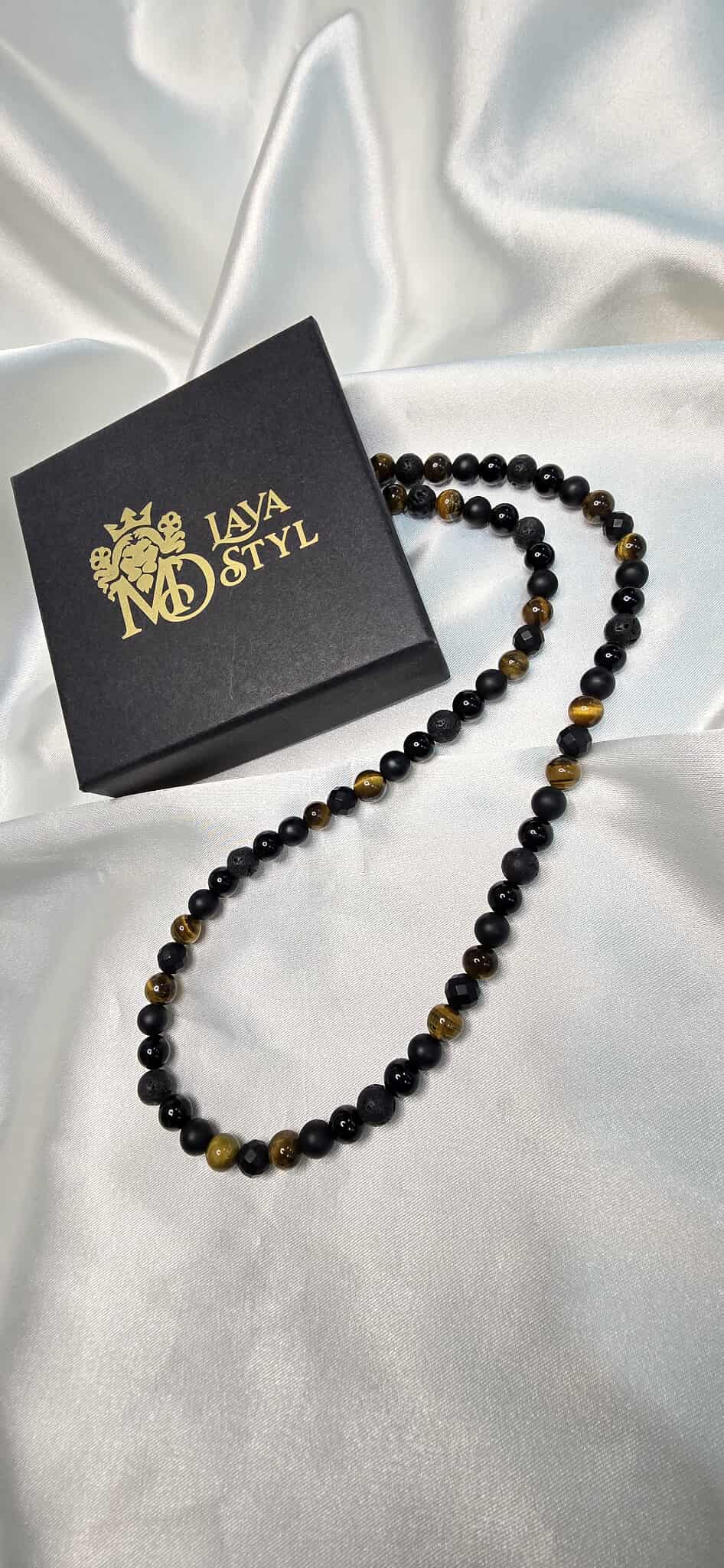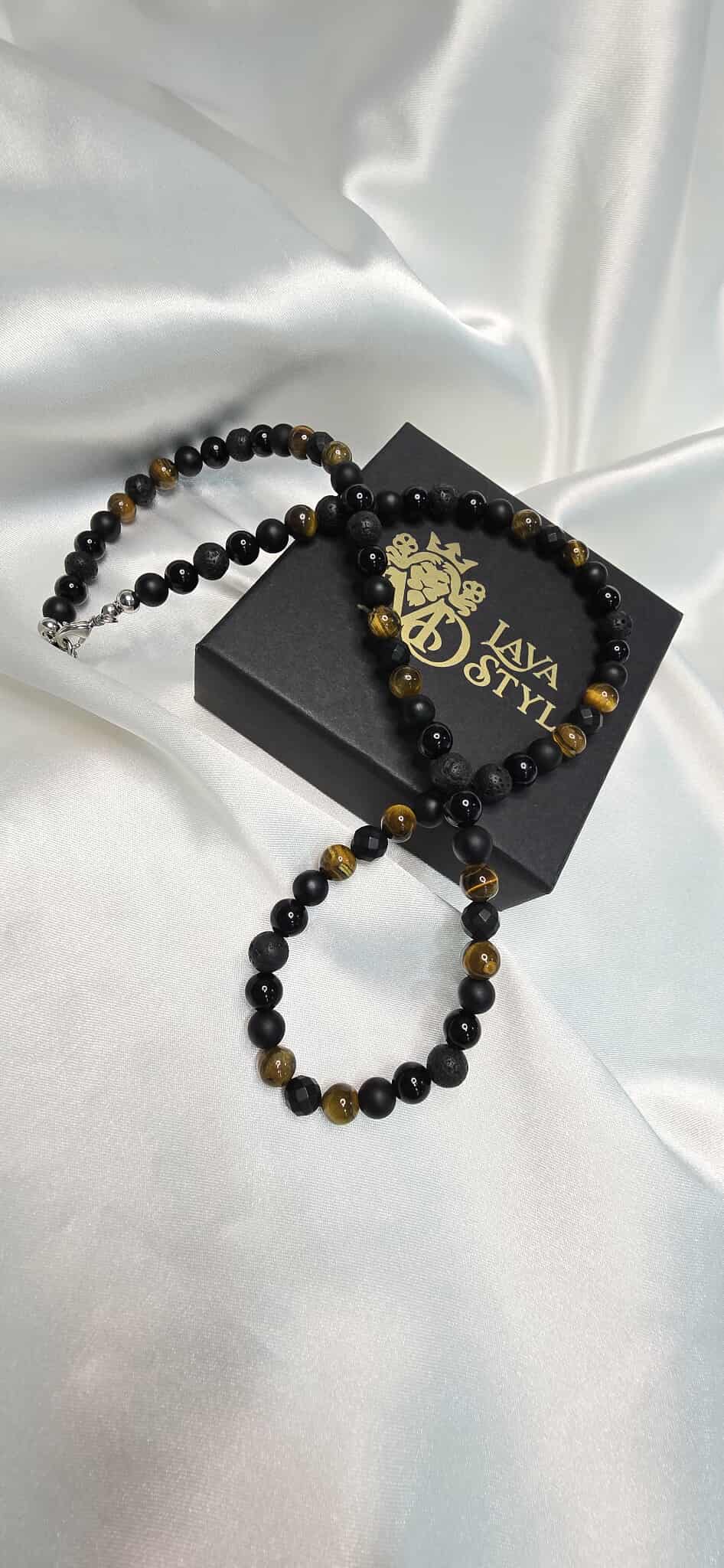 Elegantný pánsky náhrdelník Sila a Rovnováha vyrobený z prírodných minerálov, ktorý spája silu, stabilitu a mužský charakter. Kombinácia Tigrieho oka, lesklého aj matného Ónyxu a lávového kameňa vytvára nadčasový doplnok vhodný na každodenné nosenie aj výnimočné príležitosti.
