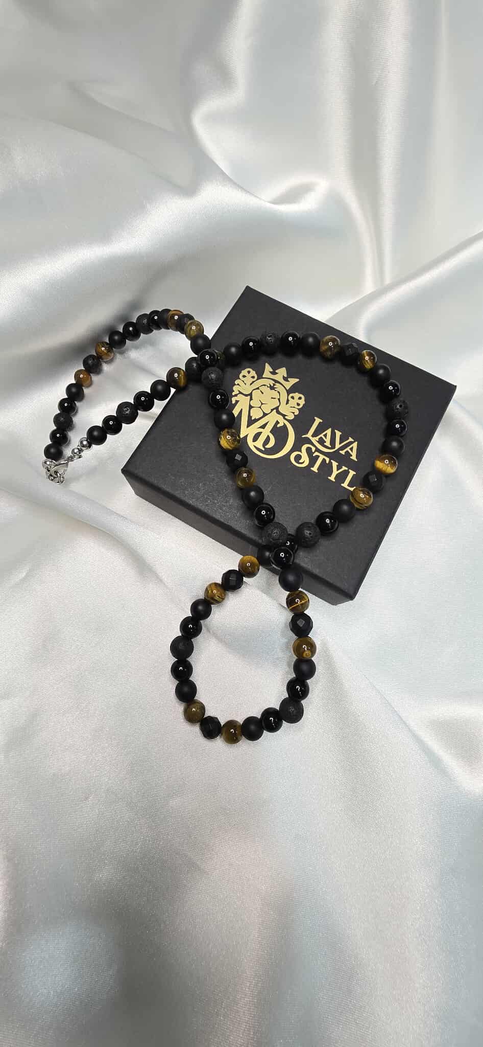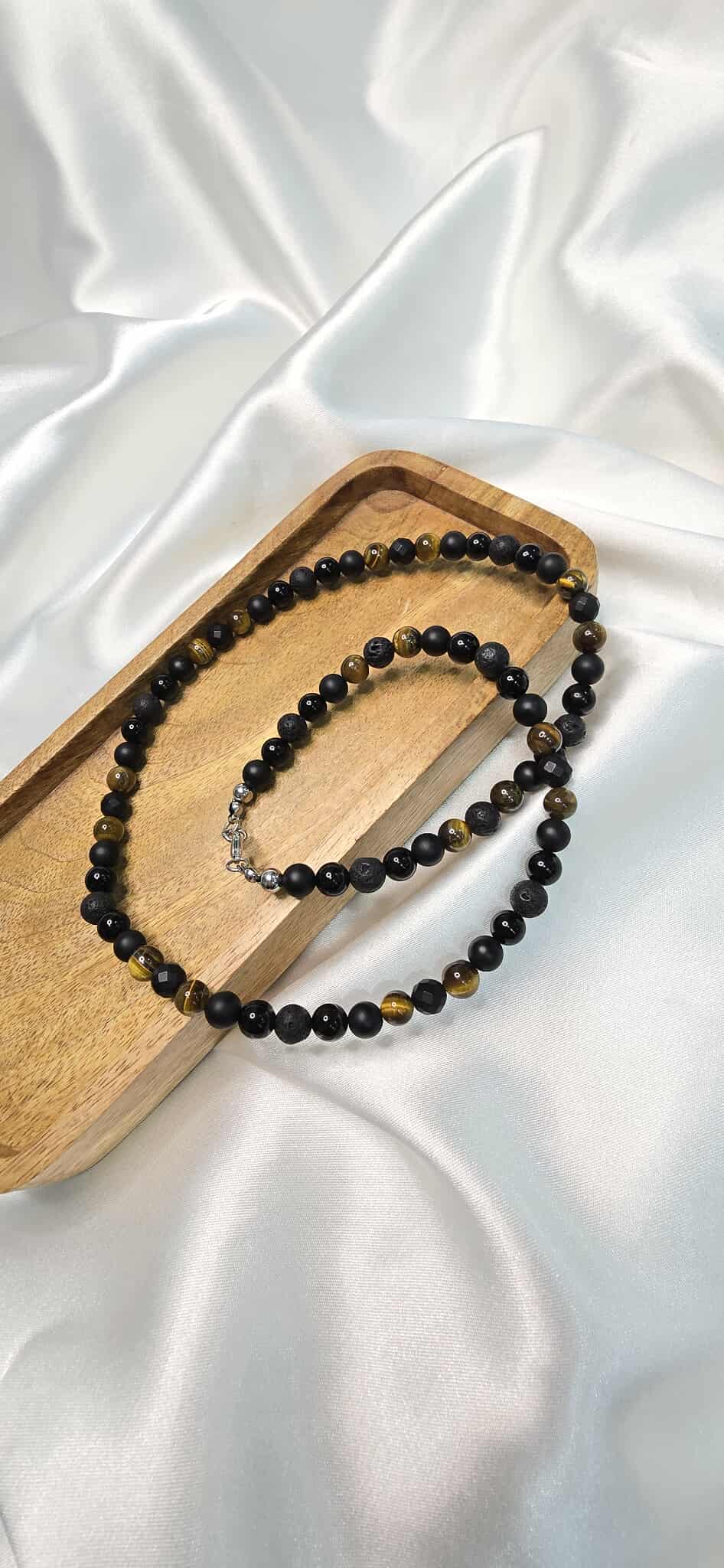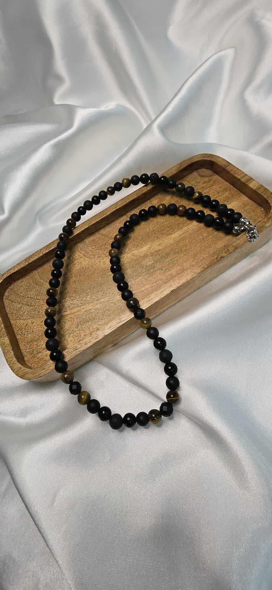 Elegantný pánsky náhrdelník Sila a Rovnováha vyrobený z prírodných minerálov, ktorý spája silu, stabilitu a mužský charakter. Kombinácia Tigrieho oka, lesklého aj matného Ónyxu a lávového kameňa vytvára nadčasový doplnok vhodný na každodenné nosenie aj výnimočné príležitosti.