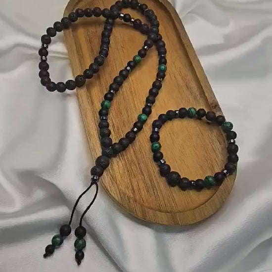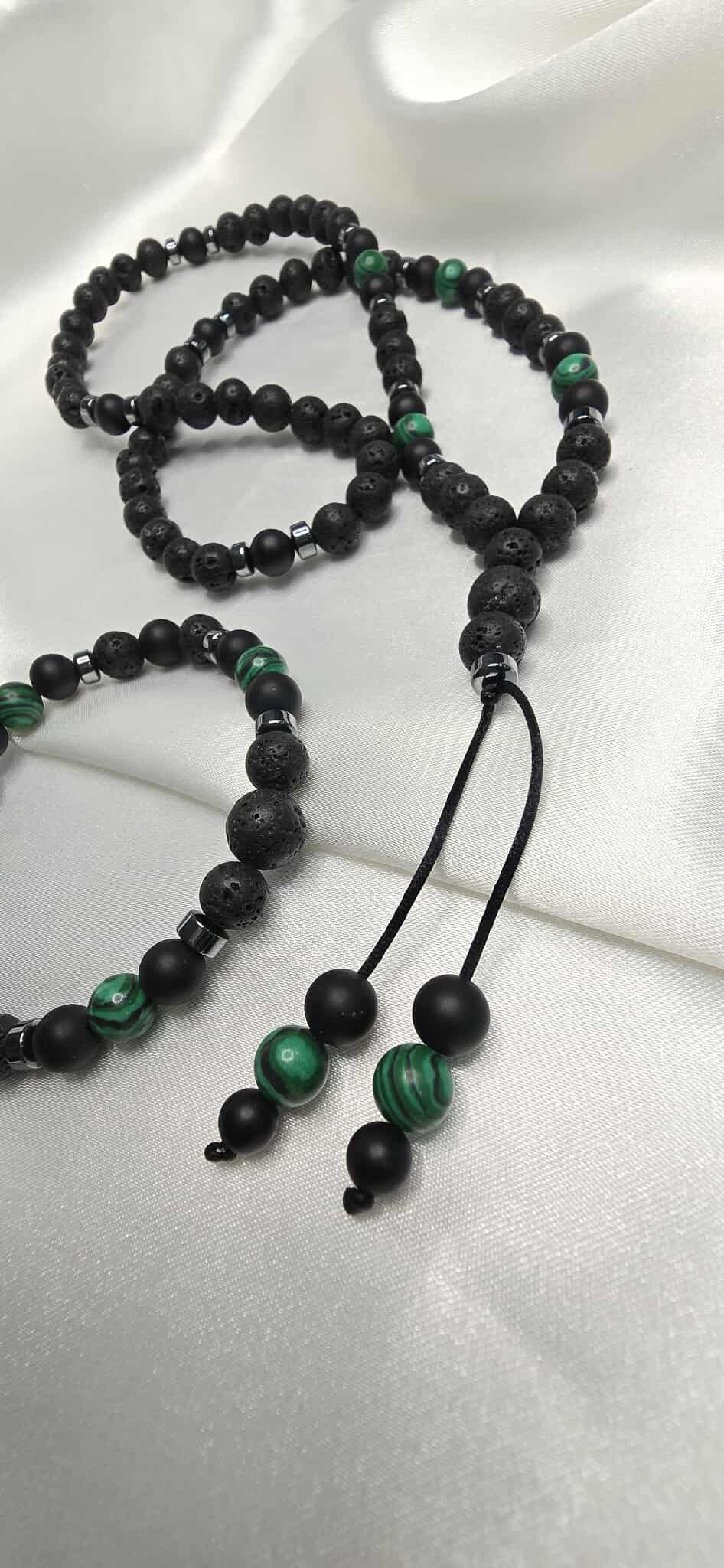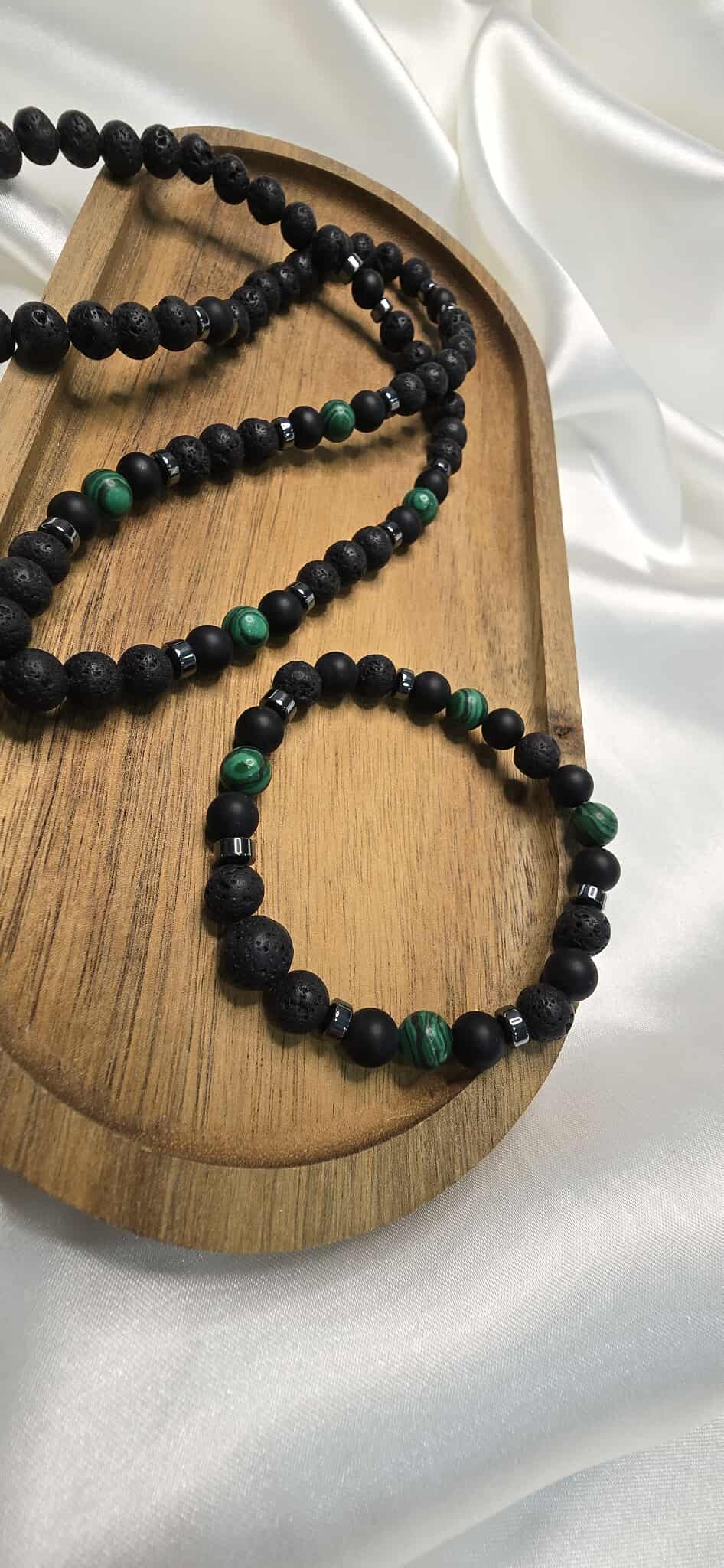 Ručne vyrobený z malachitu, matného ónyxu, lávového kameňa a hematitu, ktoré spolu vytvárajú harmonickú rovnováhu medzi silou, ochranou a vnútorným pokojom.
