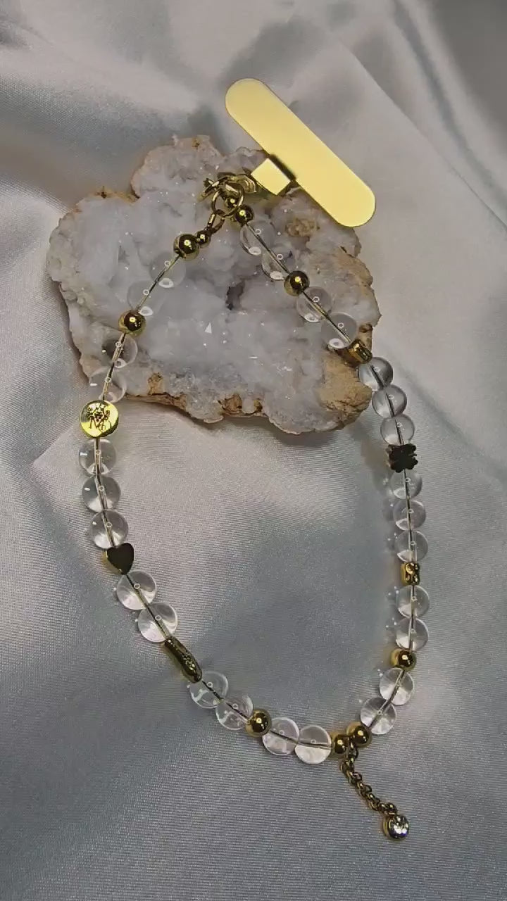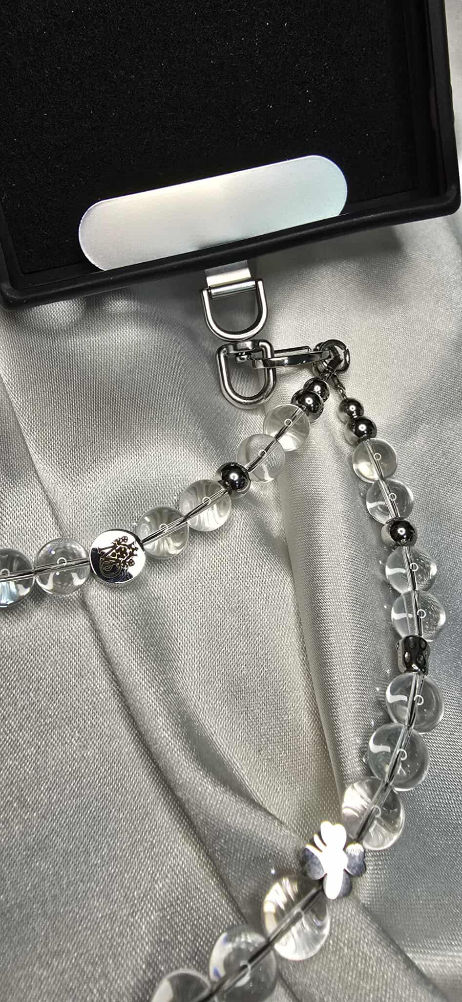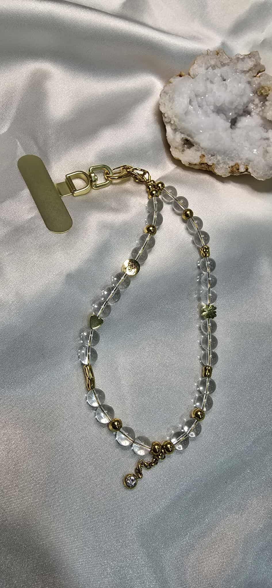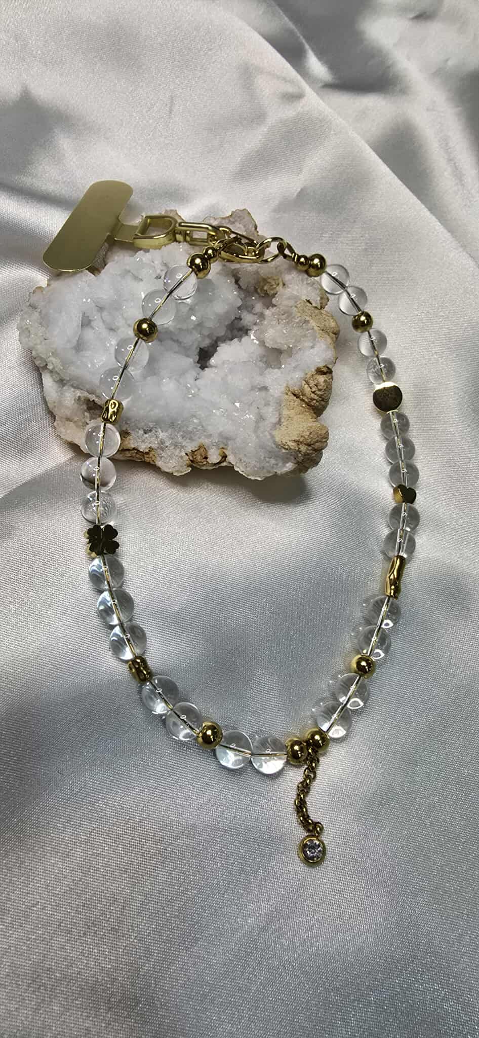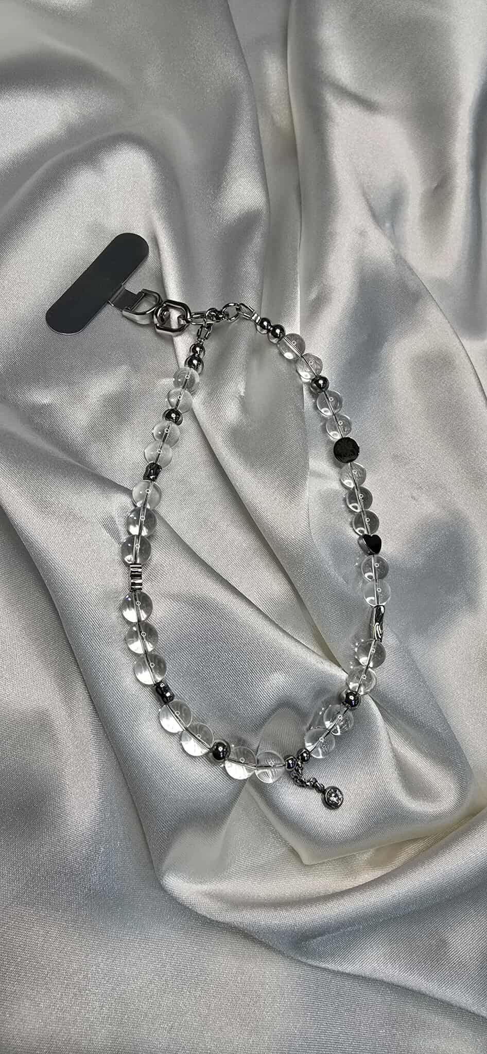 Štýlová a praktická retiazka na mobil vyrobená z prírodného minerálneho kameňa krištáľu, doplnená o kvalitné komponenty z nehrdzavejúcej ocele.