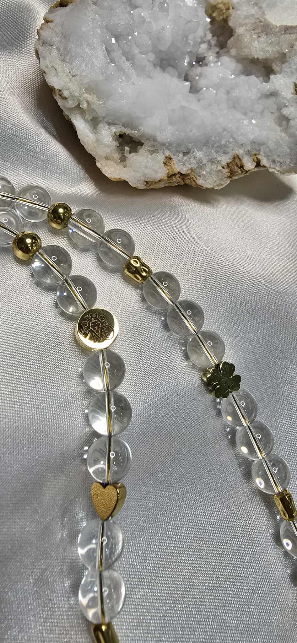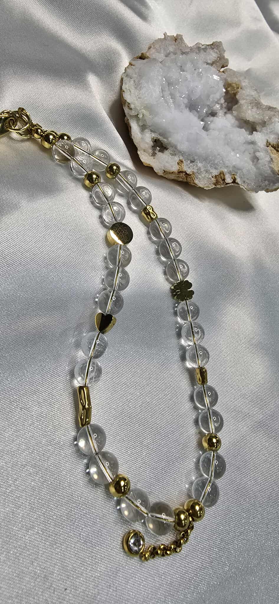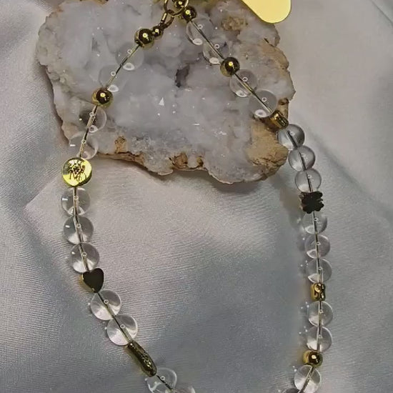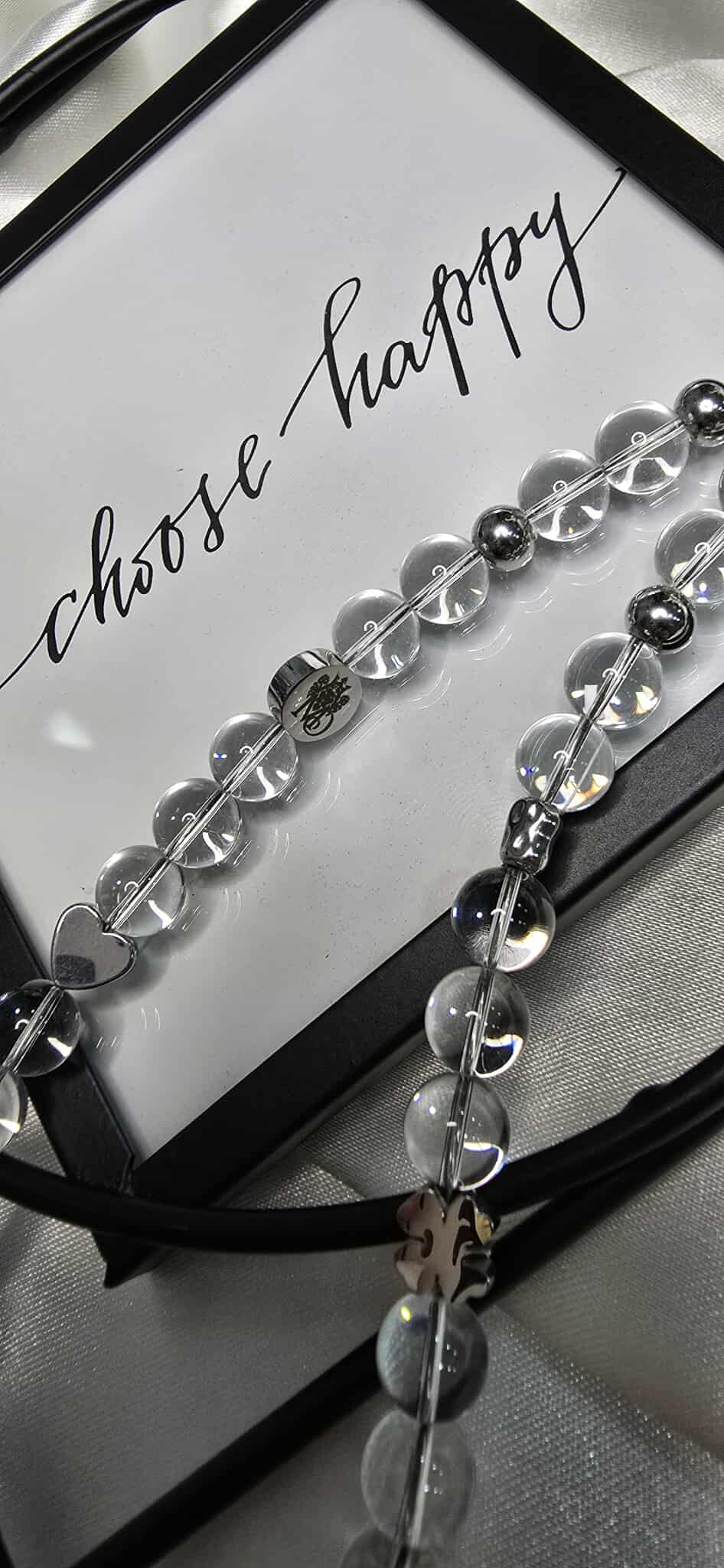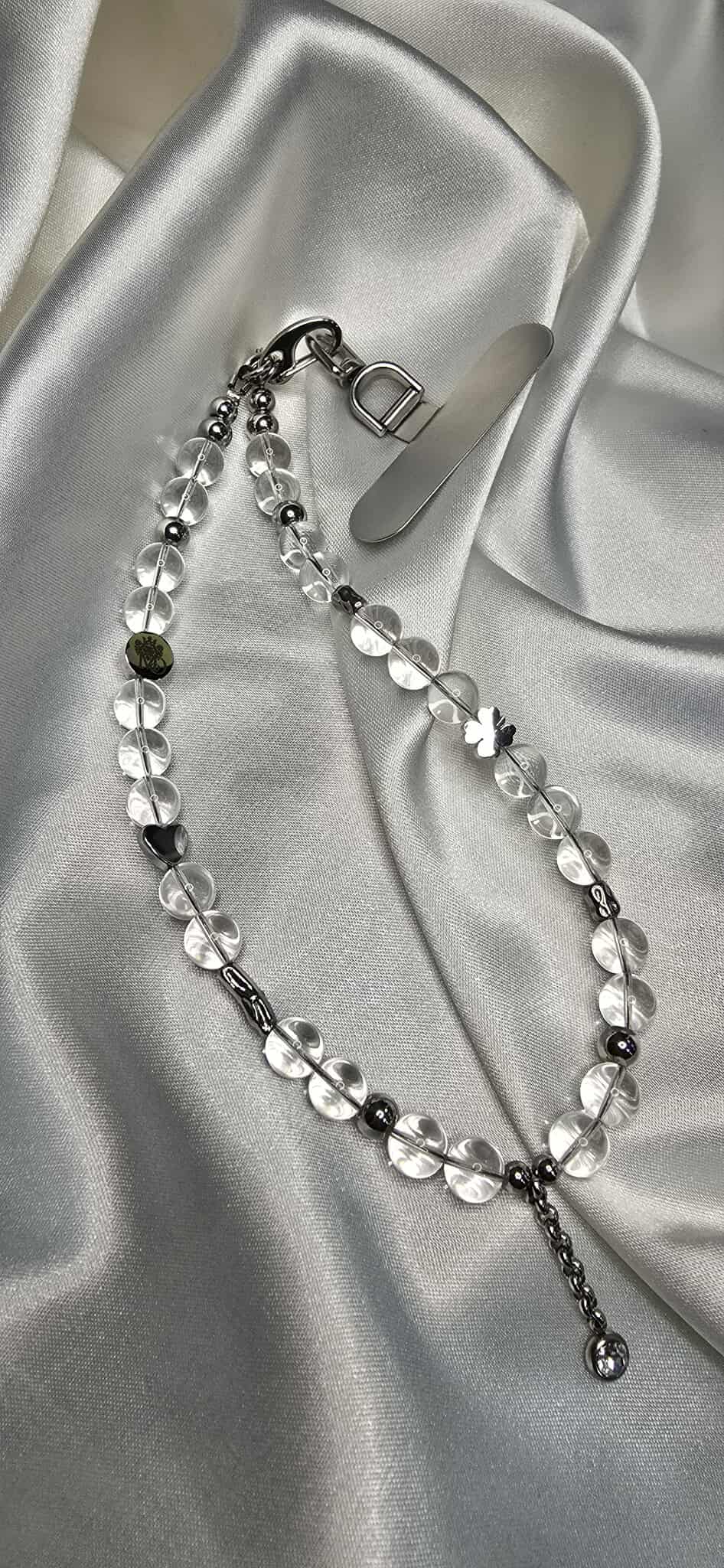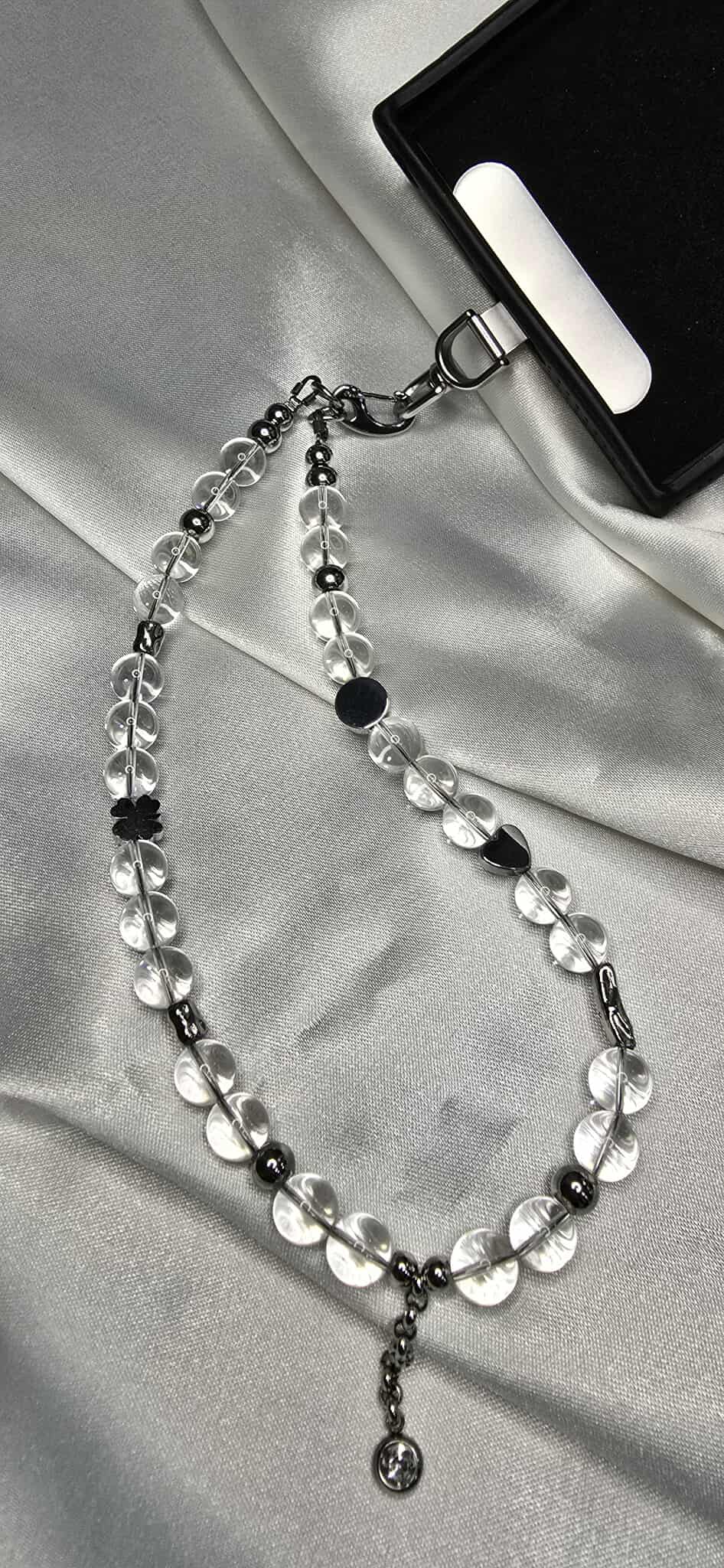 Štýlová a praktická retiazka na mobil vyrobená z prírodného minerálneho kameňa krištáľu, doplnená o kvalitné komponenty z nehrdzavejúcej ocele.